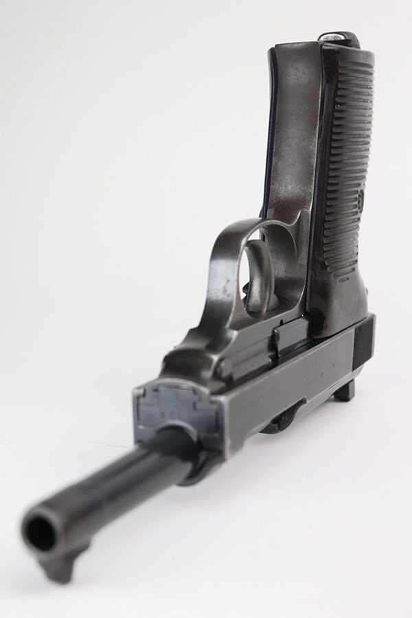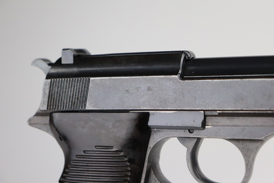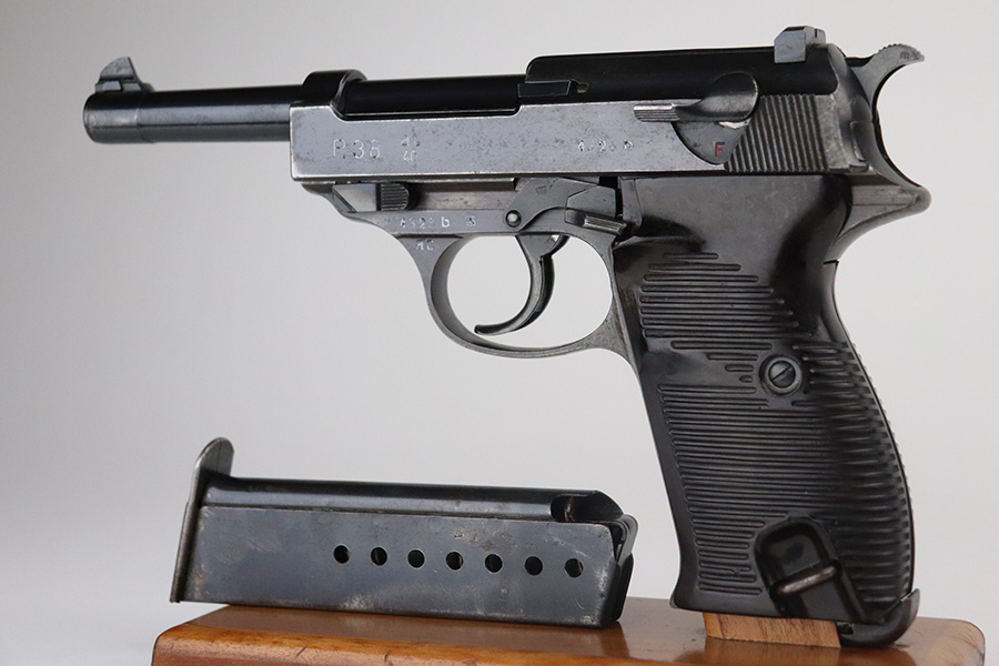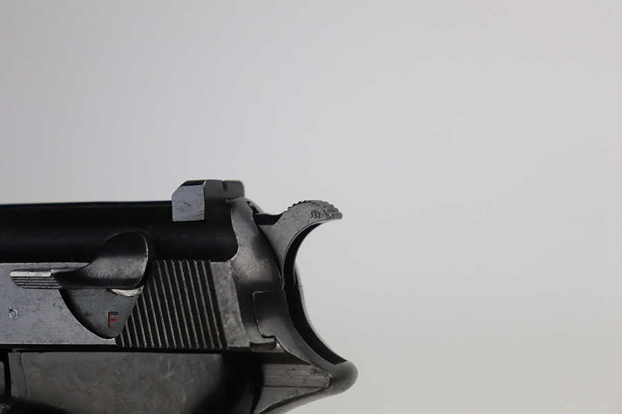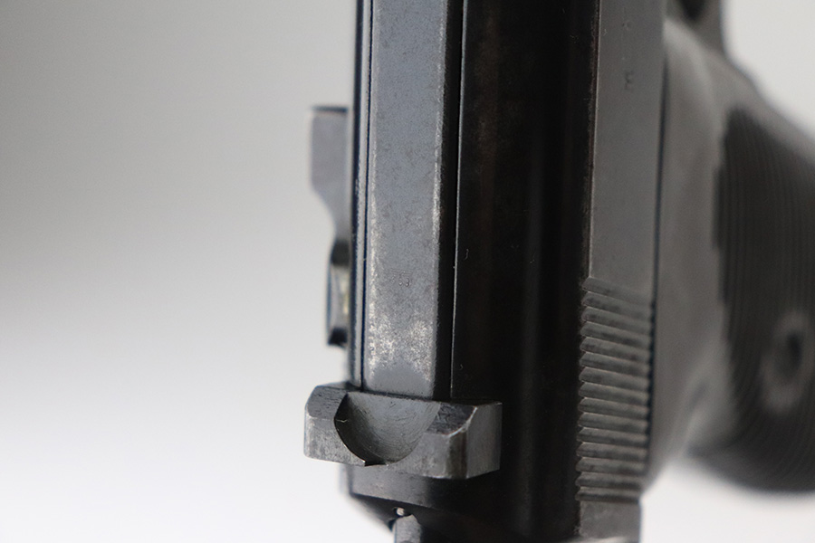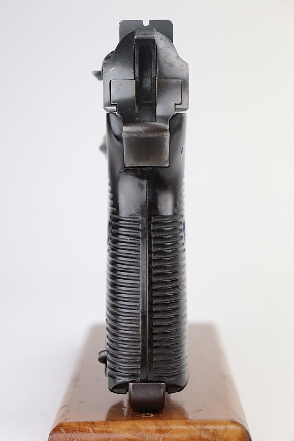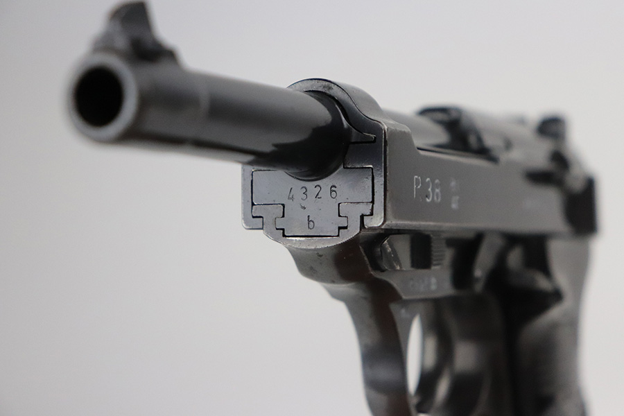 7/1/21 – This is a very nice example of a Walther P.38 issued to the Nazi military in 1940. The gun is all matching and has the proper “Eagle 359” military proofs throughout. It has retained about 90-91% of its finish. There is minor wear around the high edges of the slide and around the muzzle. Thinning on the front strap. While there isn’t a ton of actual finish loss, there is spotty oxidation on the whole gun. Comes with excellent matching grips and a period-correct mismatched magazine. The bore has good rifling with freckling throughout. De-cocker is functional.