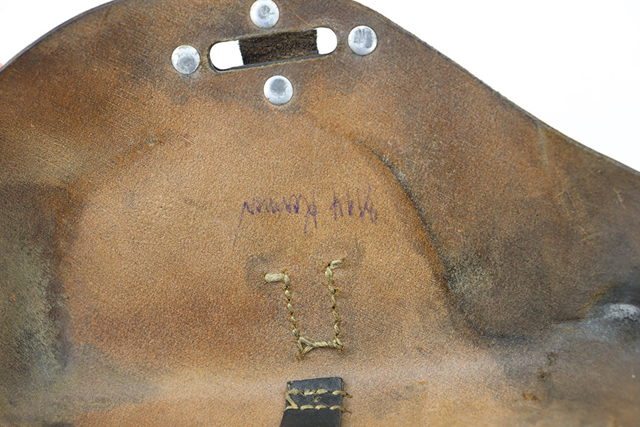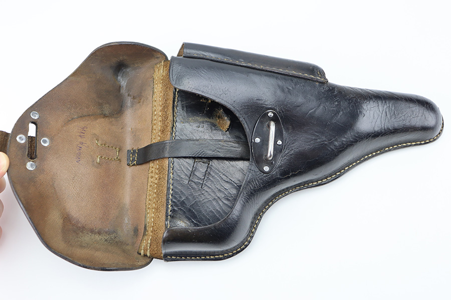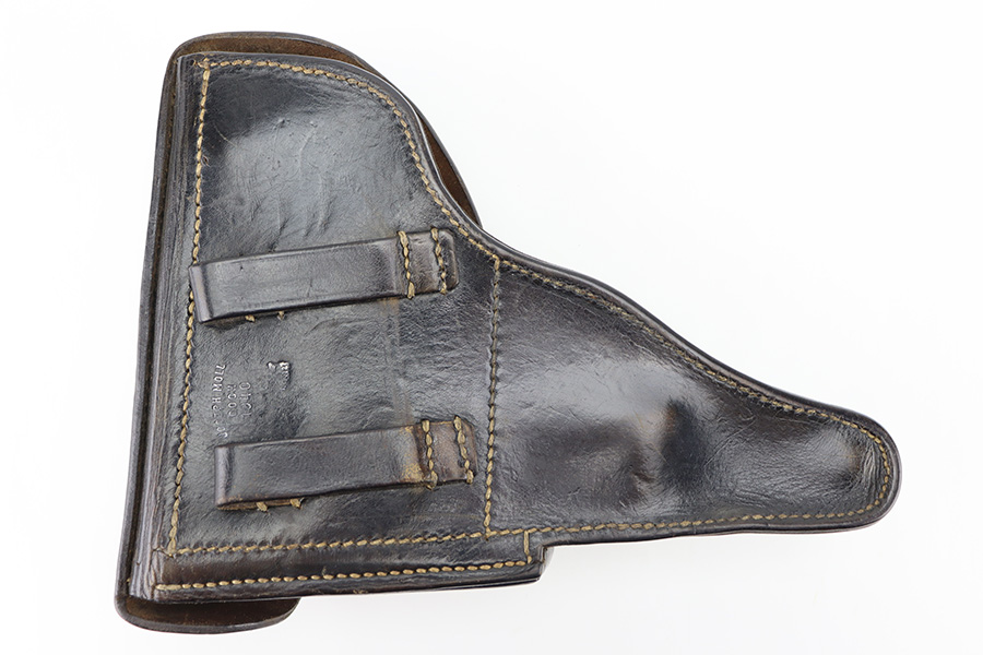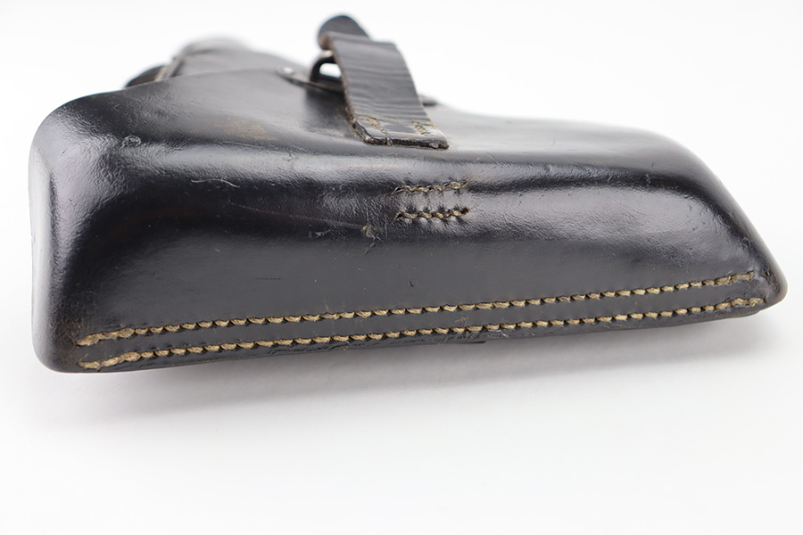 7/9/24 – This is an early P.38 production 1940 dated holster that fits either a P.38 pistol or a CZ-38 (39) pistol. The holster is in great overall condition with some light surface wrinkling on the closure strap and front leather. Normal pliability and light use wear. Clean interior leather. All original stitching with no stitching issues. The back leather is dated, maker stamped, and waffen military proof stamped.