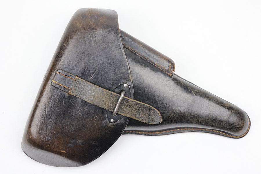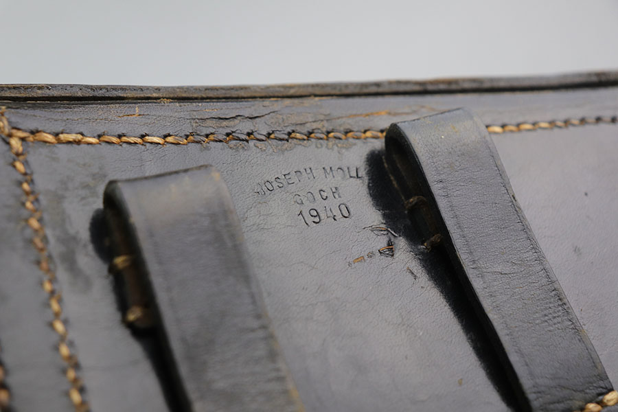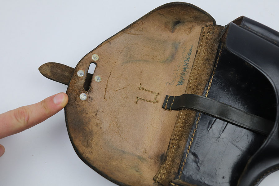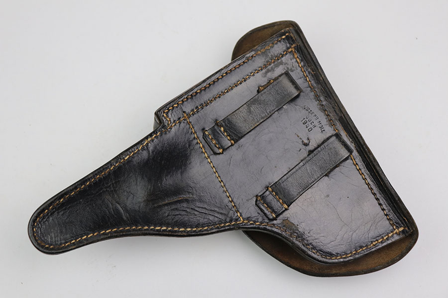 1/6/21 – This is an original and very scarce 1940 dated P.38 holster. The holster unfortunately has been cut down slightly on the front leather. Otherwise the holster is in great shape with no major issues. Some light surface wrinkling and normal aging wear. The back leather is maker stamped and dated with a waffen eagle proof stamp. Only the top of the eagle is visible (poor strike). No stitching issues.