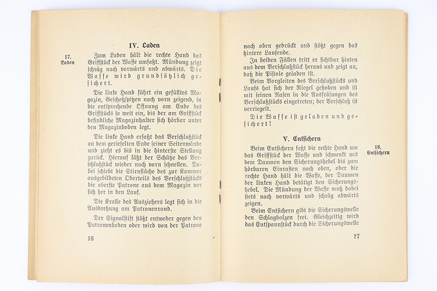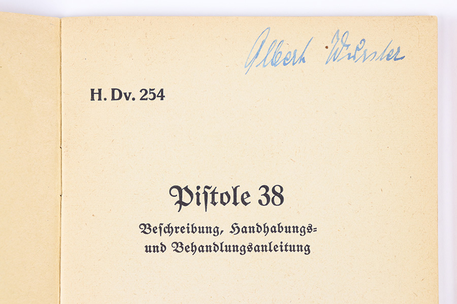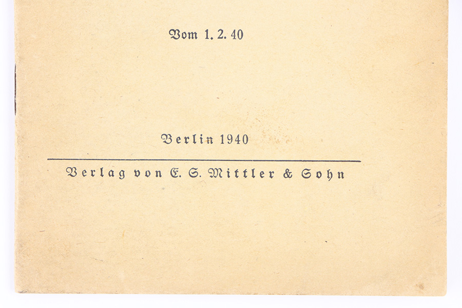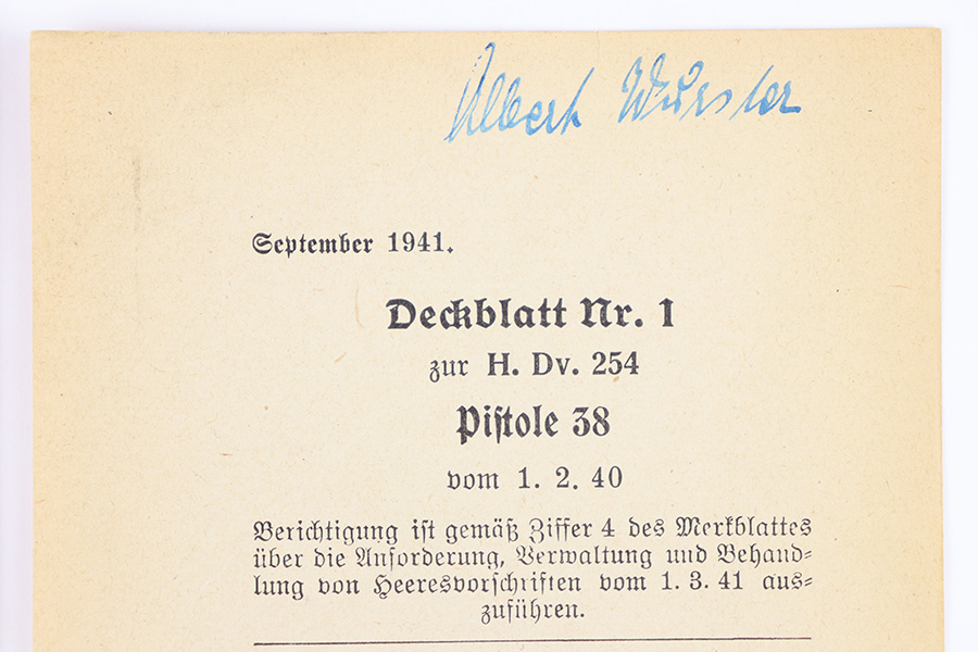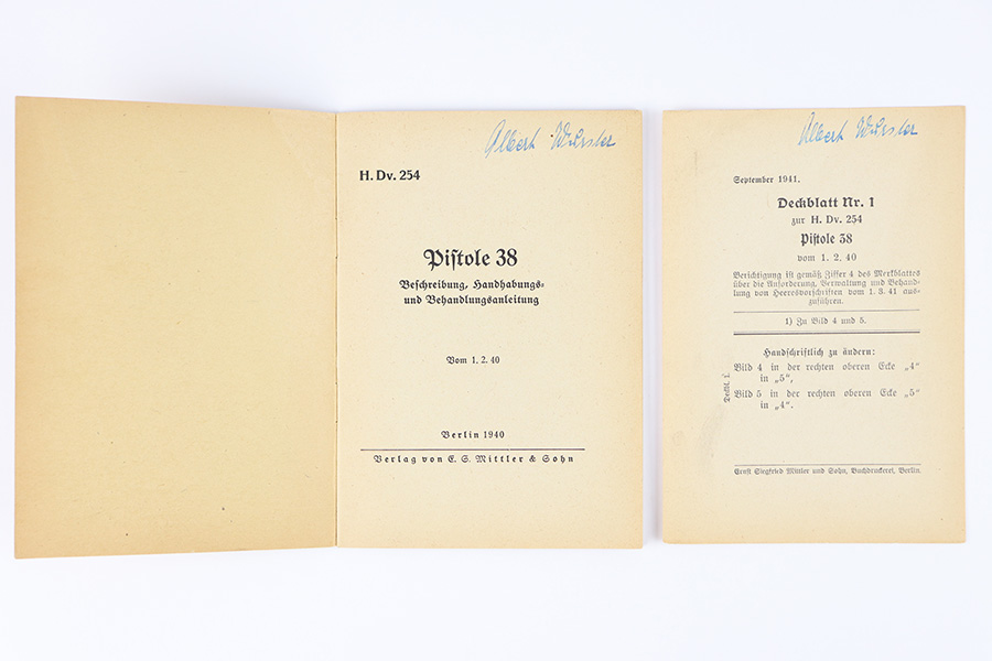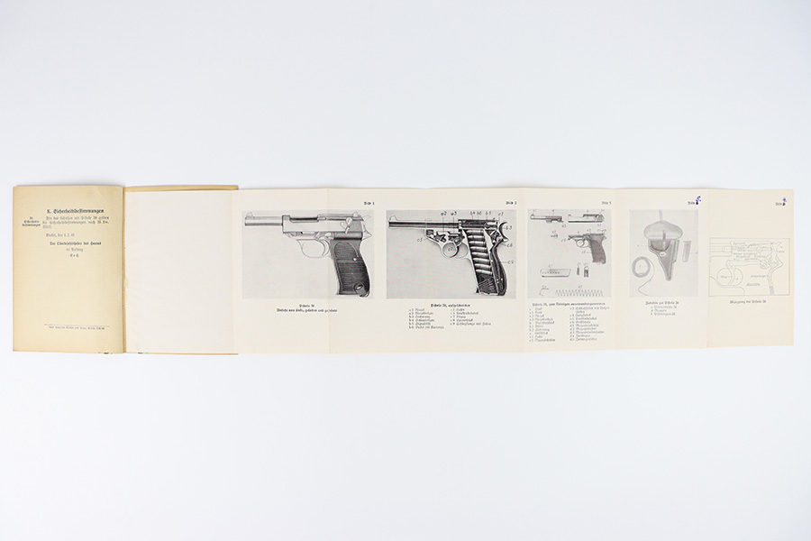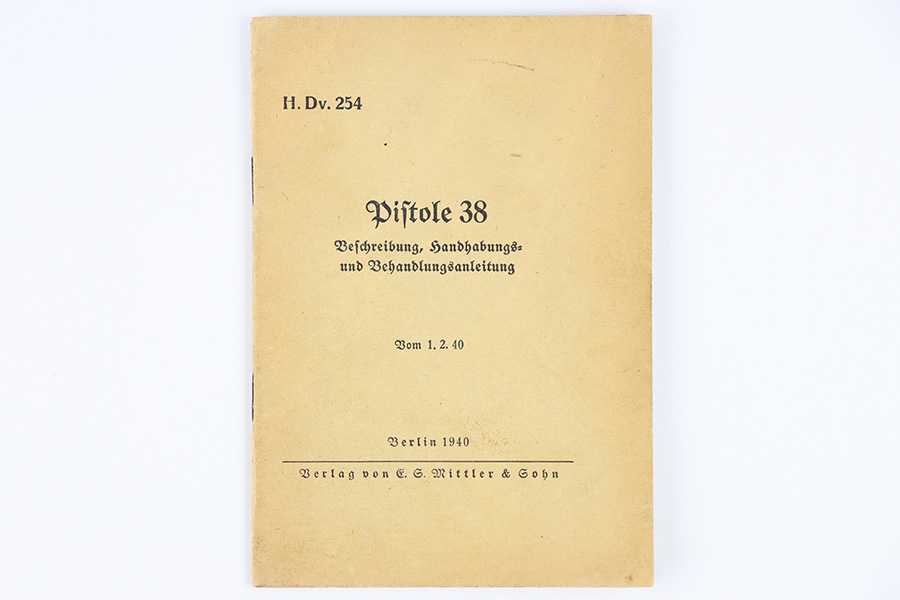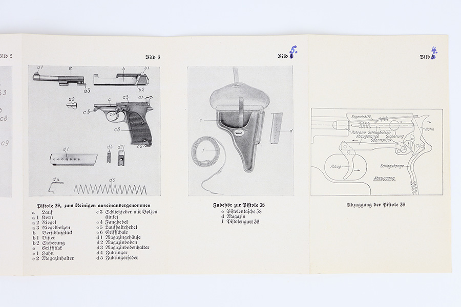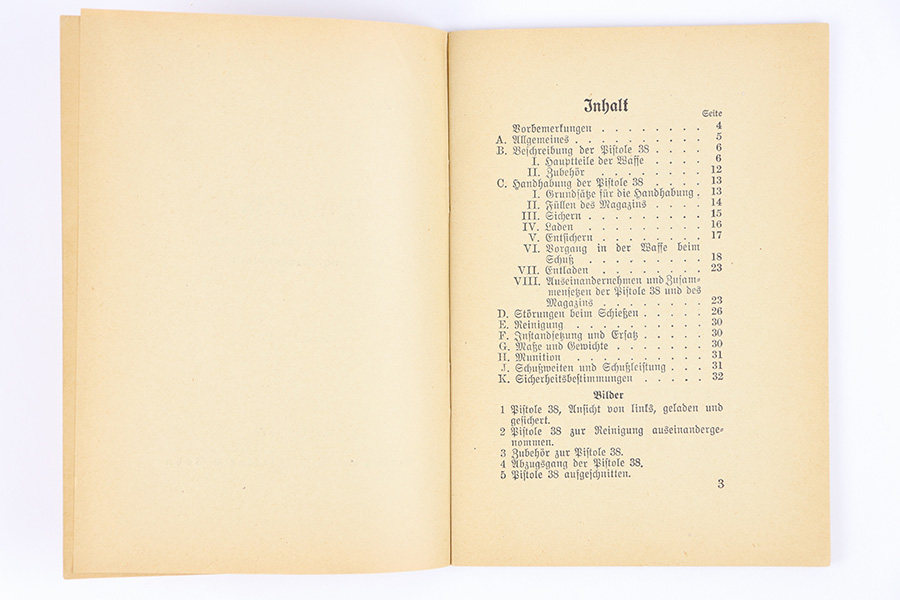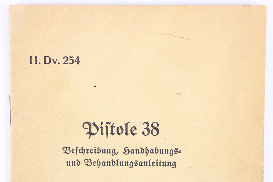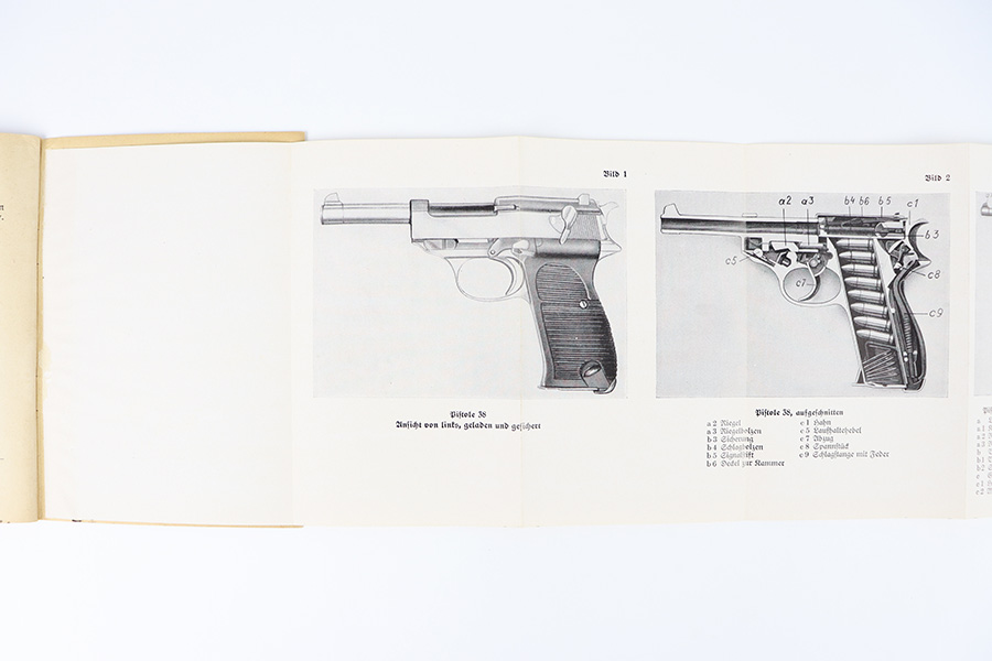 9/26/23 – This is a scarce, WW2 original German P.38 pistol manual. The manual is 1940 dated, so this was made during early P.38 production. The interior cover page is dated September 1941, but this page is not attached to the other pages, and doesn’t show signs of ever having been attached to the binding. All pages are in great shape with some mild yellowing from age. The back cover page is a fold-out diagram for the pistol and internals.