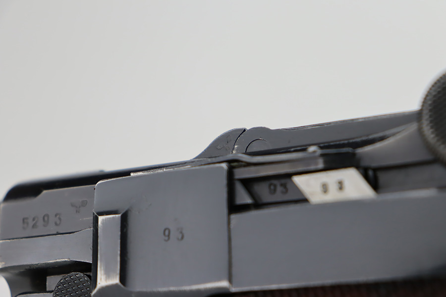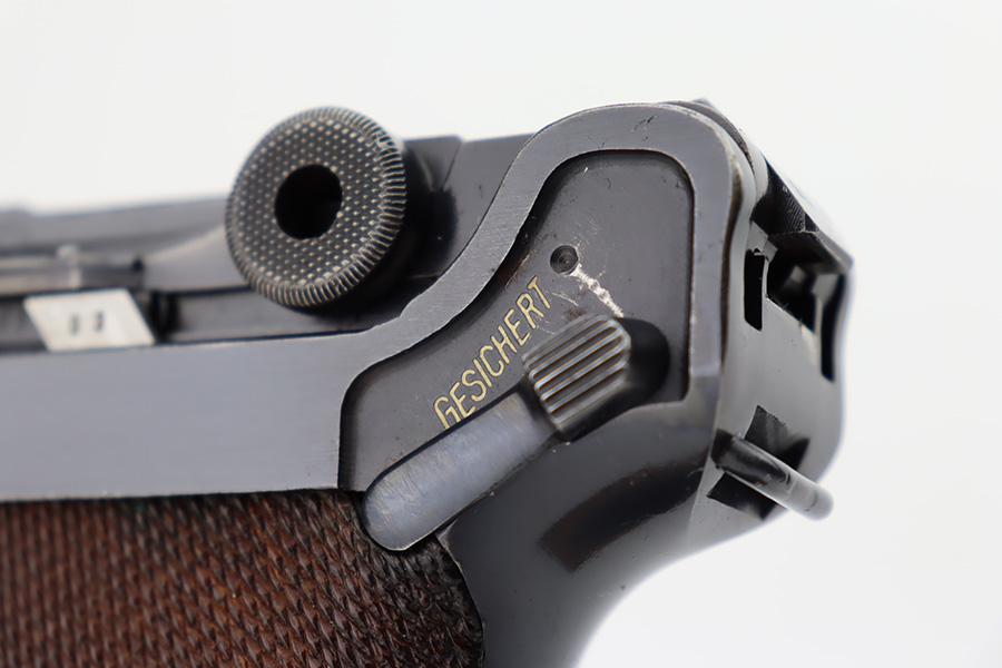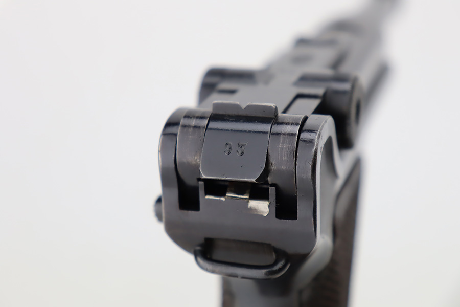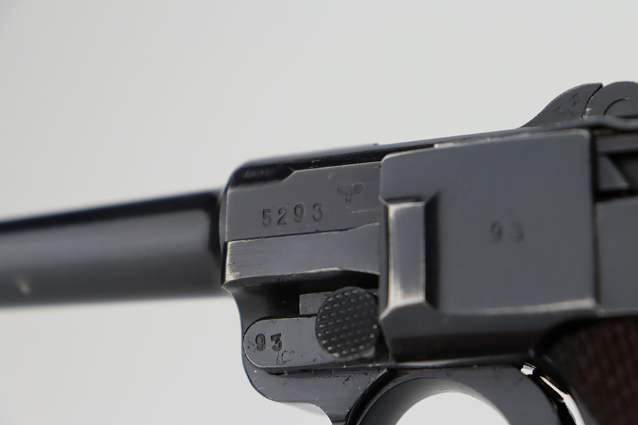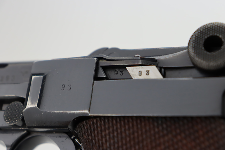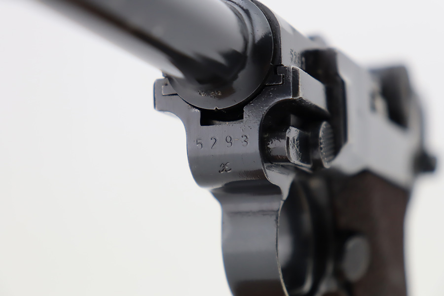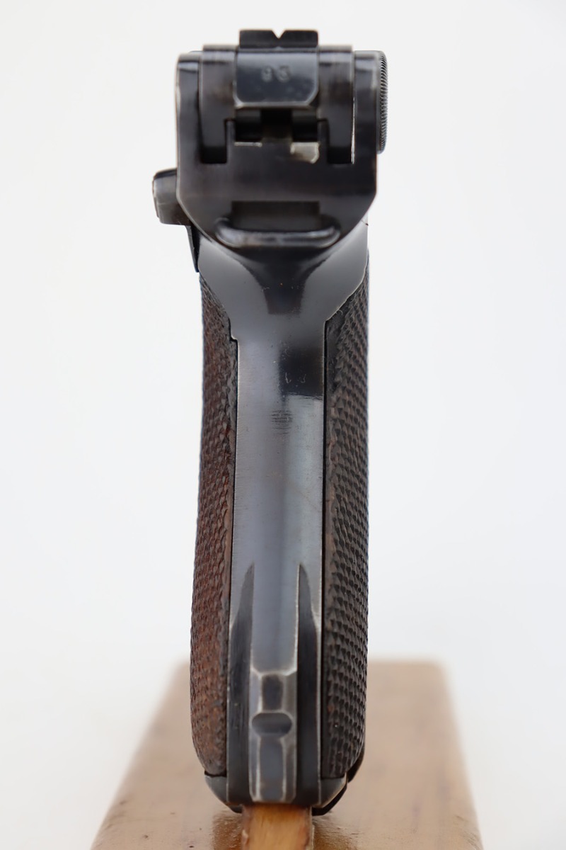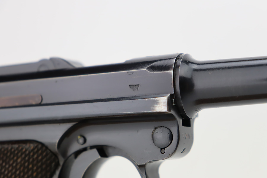 10/12/23 -This is a very nice example of a Mauser Banner Luger issued to the Nazi police force in 1940. It is all matching, has the proper police “Eagle L” proof on the right side of the slide, and has an installed police sear safety. The bluing rates about 93-94%. There is light spotty wear on the front strap, a few small dots of discoloration along the left side of the barrel, wear around the muzzle, and hints of wear on the high edges. Fitted with minty un-numbered wood grips and comes with a mismatched armorers replacement magazine. Mint bore.