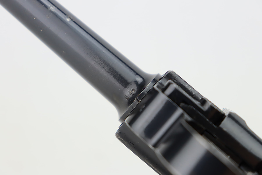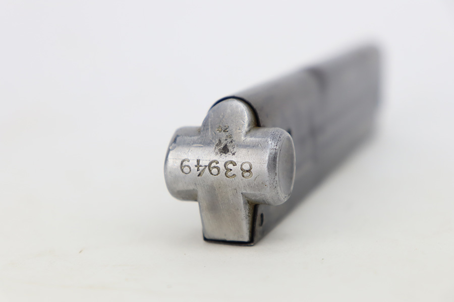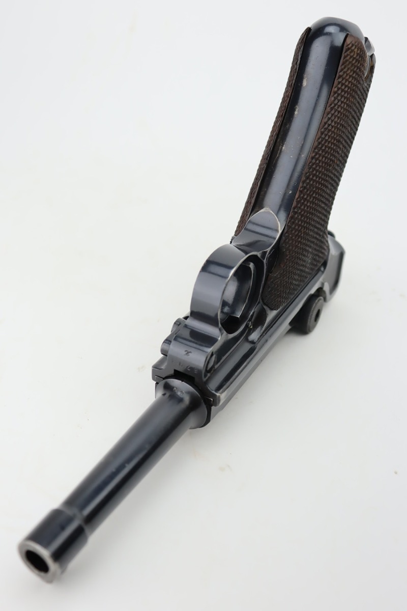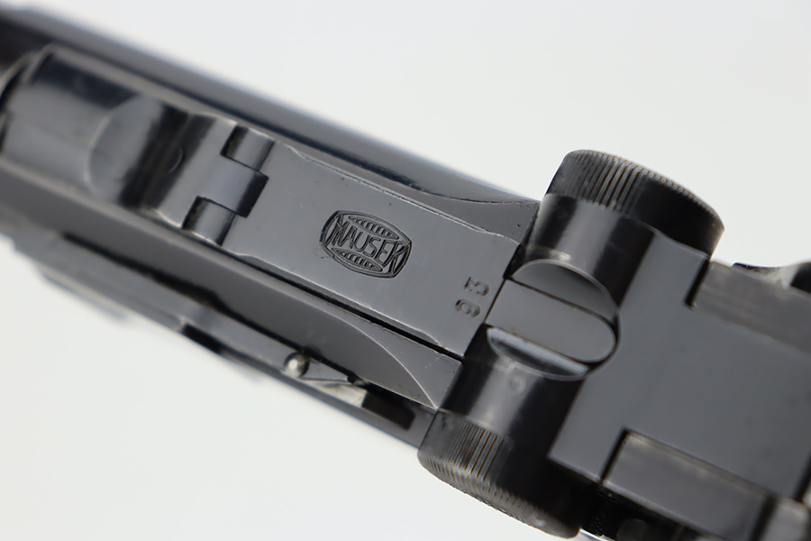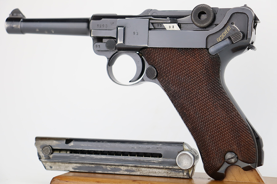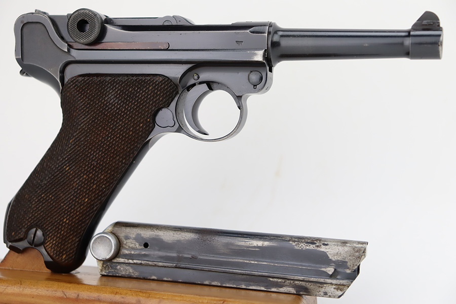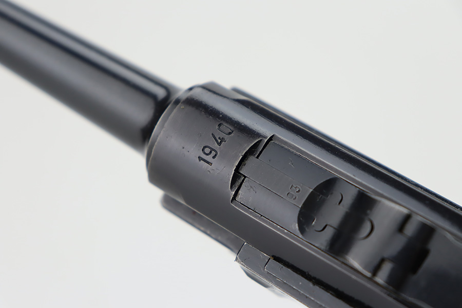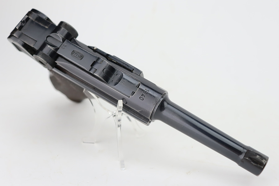 10/12/23 -This is a very nice example of a Mauser Banner Luger issued to the Nazi police force in 1940. It is all matching, has the proper police “Eagle L” proof on the right side of the slide, and has an installed police sear safety. The bluing rates about 93-94%. There is light spotty wear on the front strap, a few small dots of discoloration along the left side of the barrel, wear around the muzzle, and hints of wear on the high edges. Fitted with minty un-numbered wood grips and comes with a mismatched armorers replacement magazine. Mint bore.