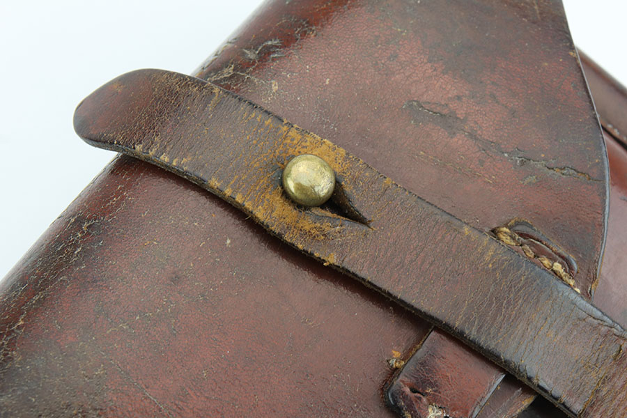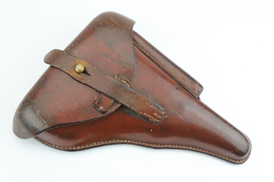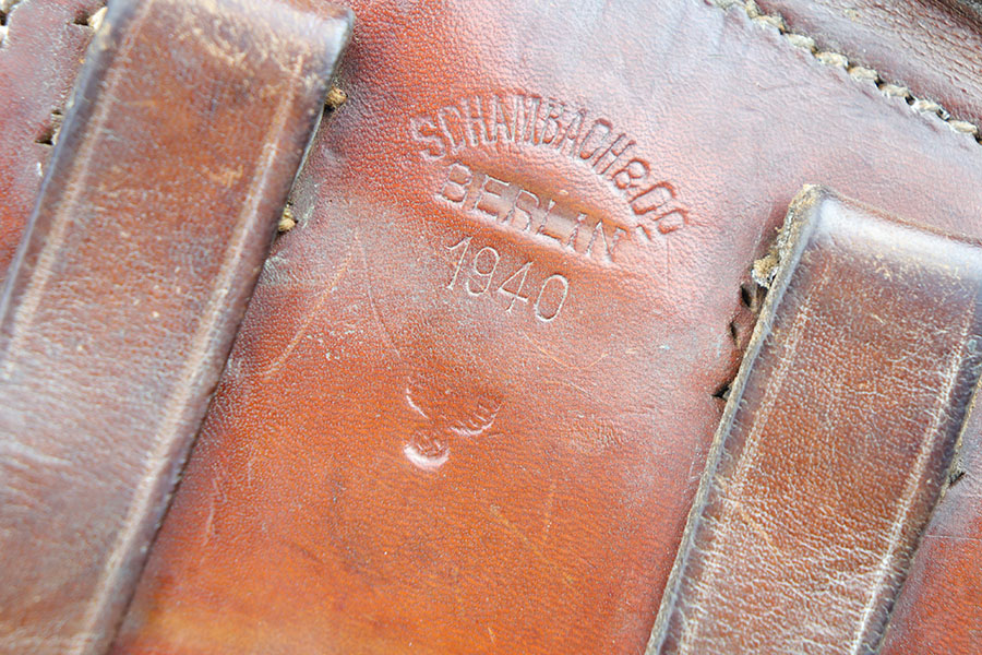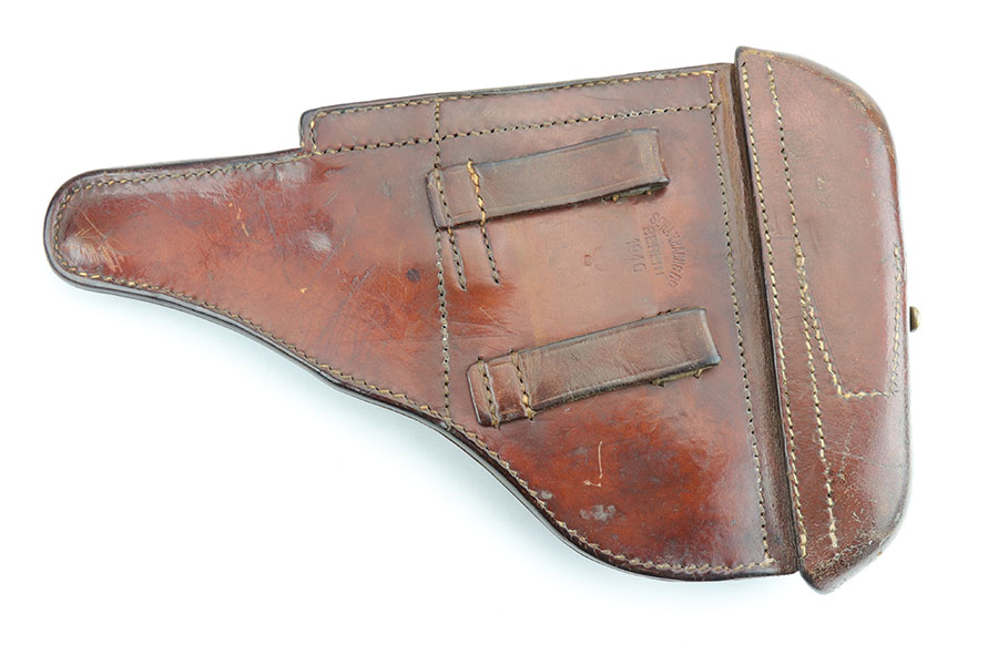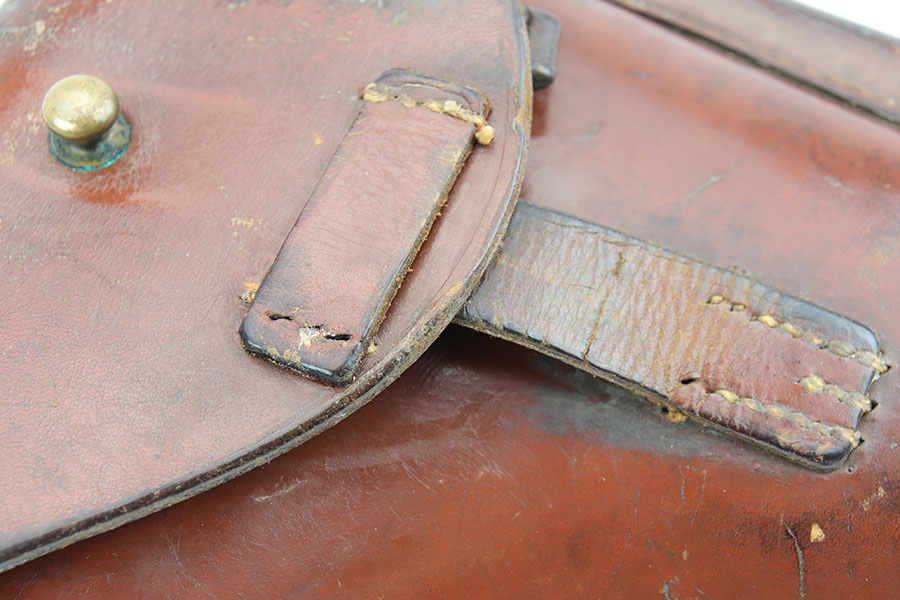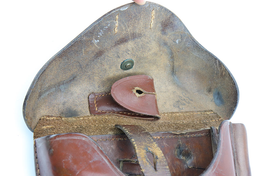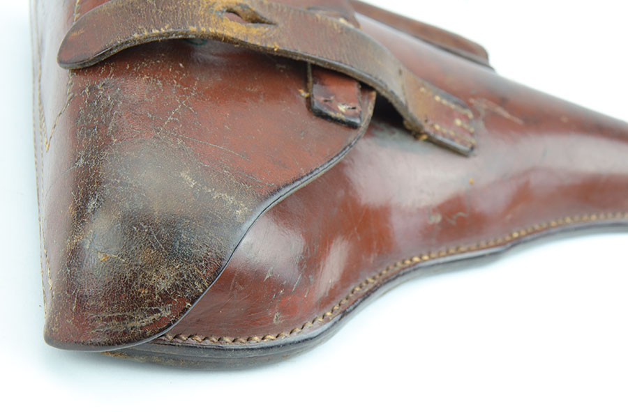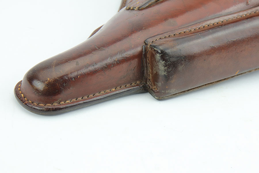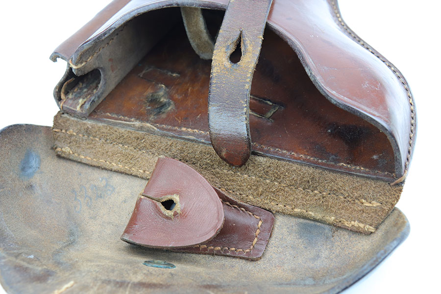 8/16/19 – This is an original 1940 dated Police Luger holster from WW2. The holster is in great overall condition with an early style brass closure knob. It’s somewhat unusual to see a 1940 date with a brass knob, as this was around the time the Germans switched to aluminum / nickle. The back of the holster is dated, police eagle stamped, and maker stamped. The leather is completely in tact, but there is some mild discoloration and wrinkling on the front leather & closure strap. The stitching is all in tact except for a few minor stitches missing in the front securing strap. See photos.