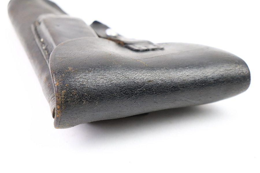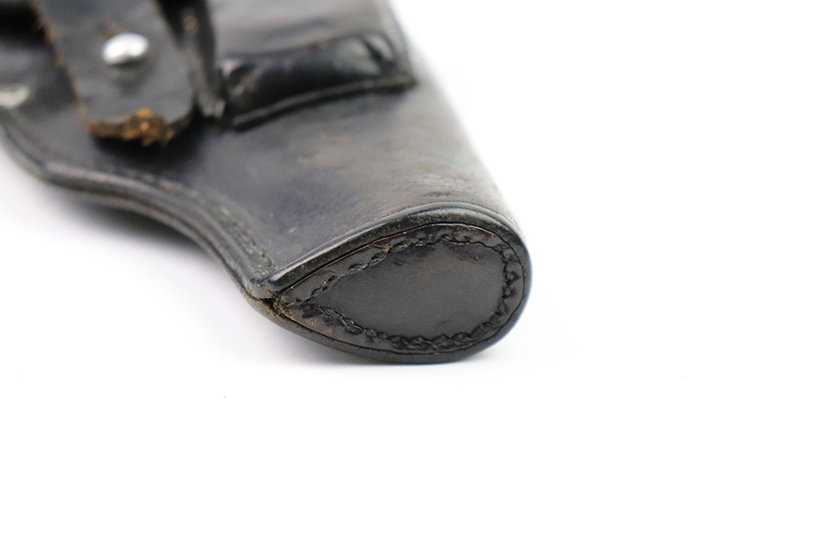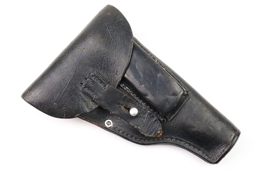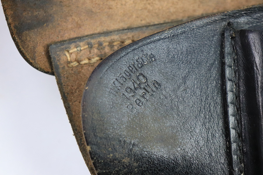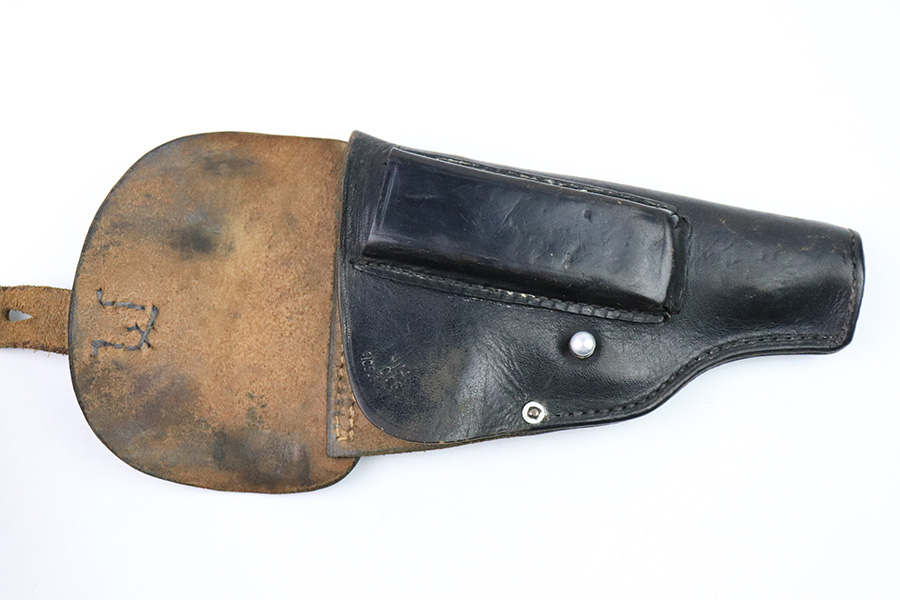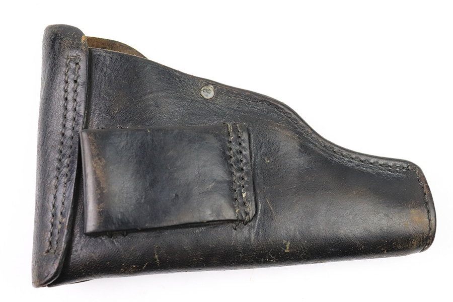 12/22/22 – This is an original police style holster that fits a 7.65mm pistol, such as the Walther PP. The holster is maker stamped and dated under the closure strap, but there’s no visible police eagle stamp. Our guess is this was a weakly struck stamp that has faded out of the leather over time. The black leather and stitching is in great condition overall with normal aging and use wear but no excessive damage nor any replacement stitching.