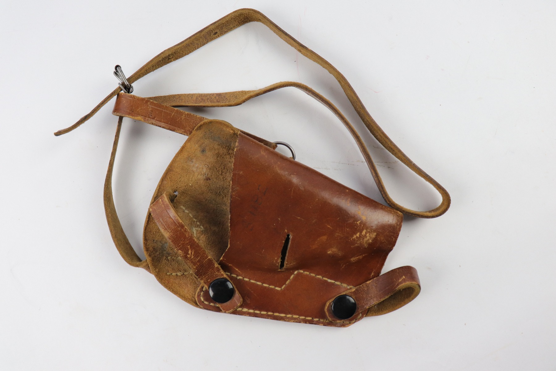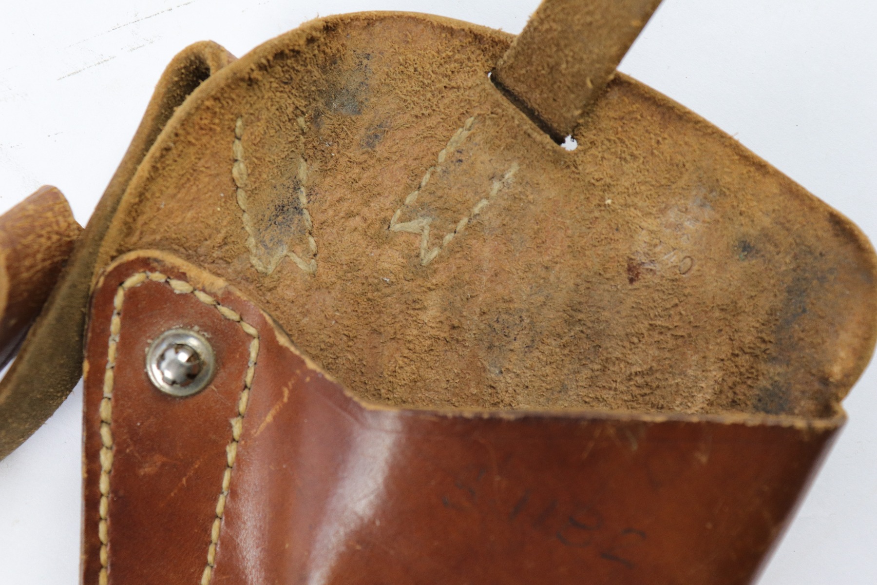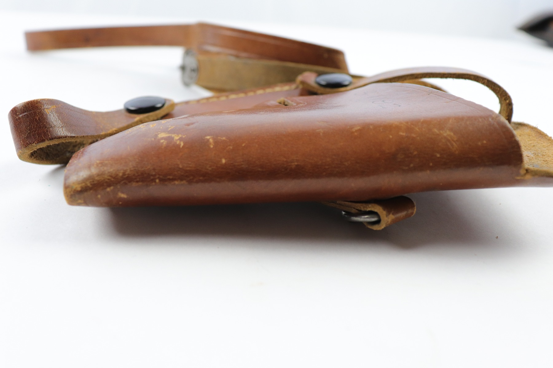 4/23/18 – This is an original 1940 dated Walther PPK shoulder holster. The holster is waffen proofed with a military eagle (looks like WaA73?”) that’s small and just above a 1940 date stamp. The leather is somewhat pliable but has nice shape overall. The stitching is all original and in tact as well. The shoulder strap has some wrinkling throughout but is completely in tact and excellent overall. Fits a PPK very nicely and the outline in the leather suggests this is what was once held inside this holster. Guaranteed original.