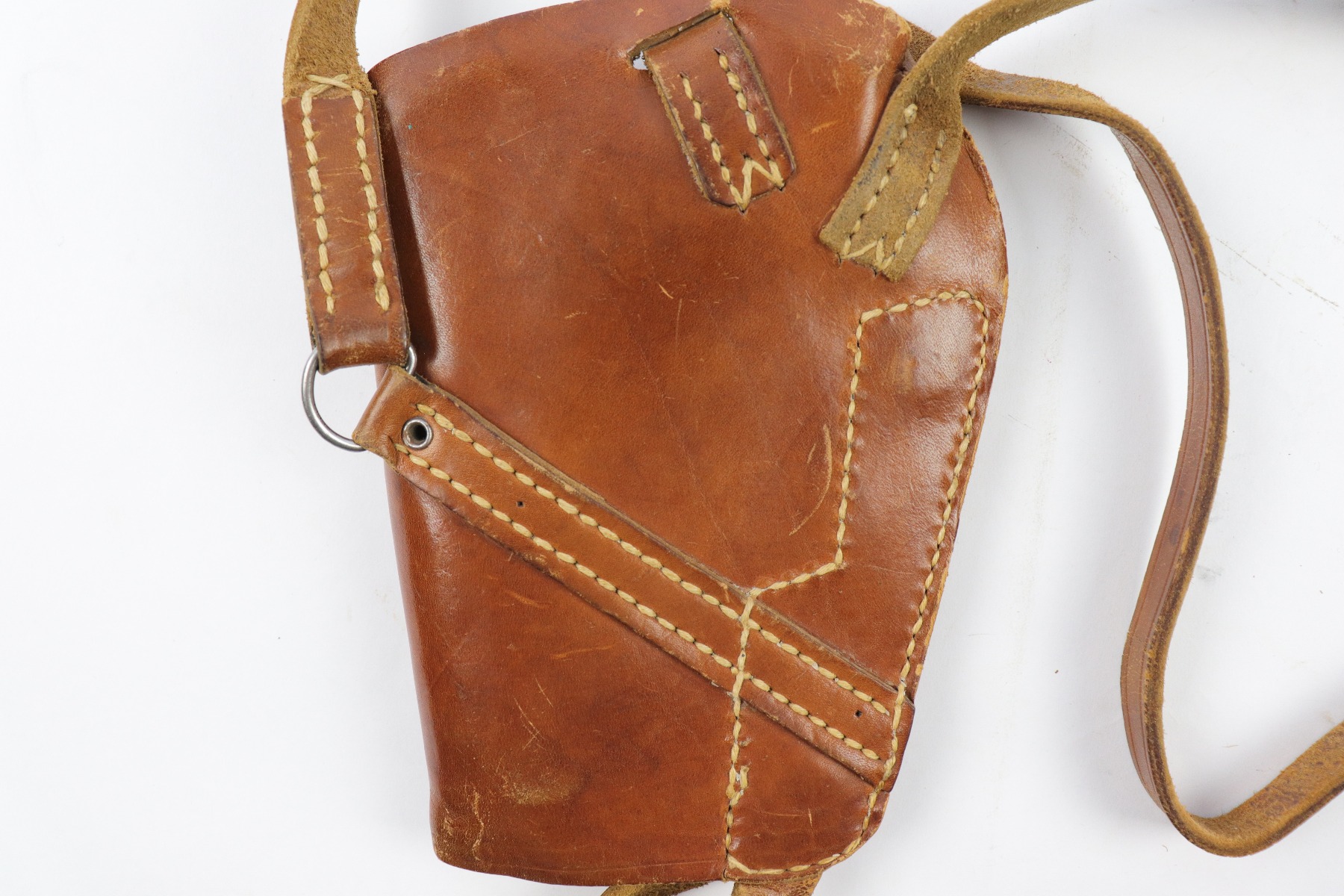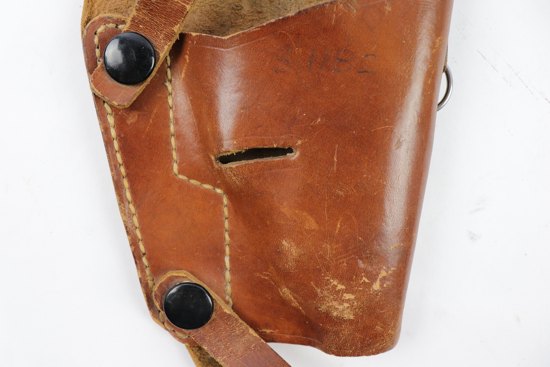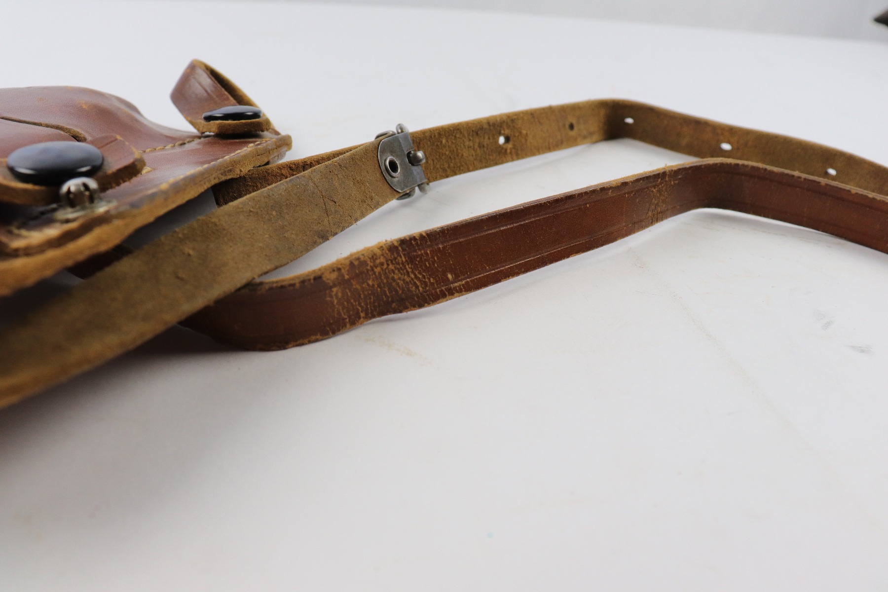 4/23/18 – This is an original 1940 dated Walther PPK shoulder holster. The holster is waffen proofed with a military eagle (looks like WaA73?”) that’s small and just above a 1940 date stamp. The leather is somewhat pliable but has nice shape overall. The stitching is all original and in tact as well. The shoulder strap has some wrinkling throughout but is completely in tact and excellent overall. Fits a PPK very nicely and the outline in the leather suggests this is what was once held inside this holster. Guaranteed original.