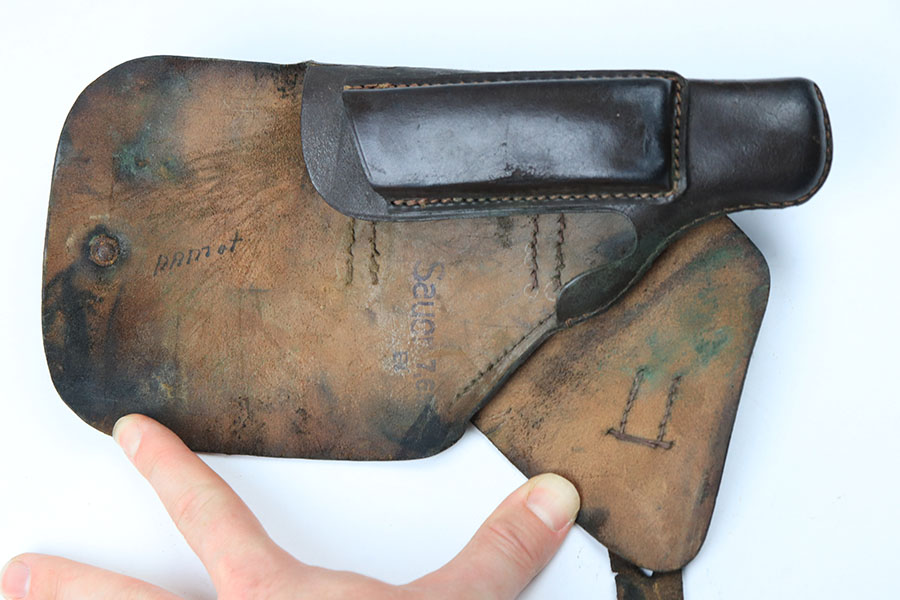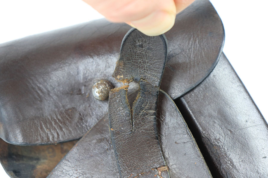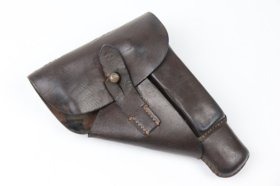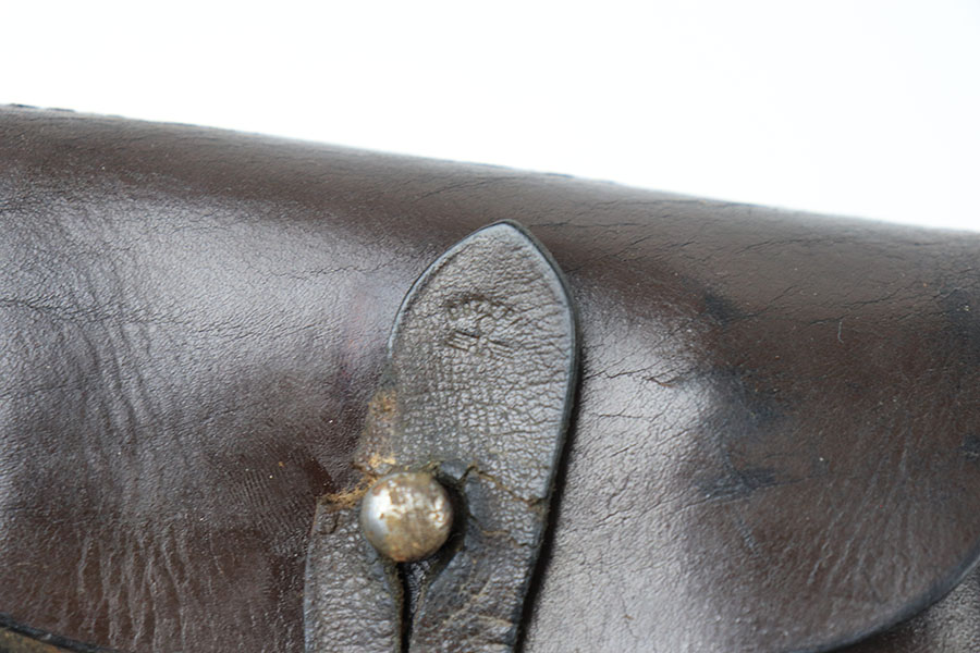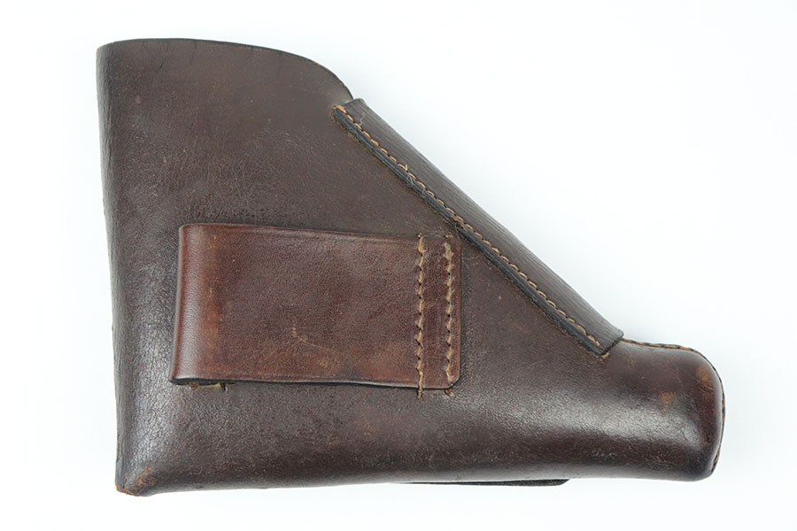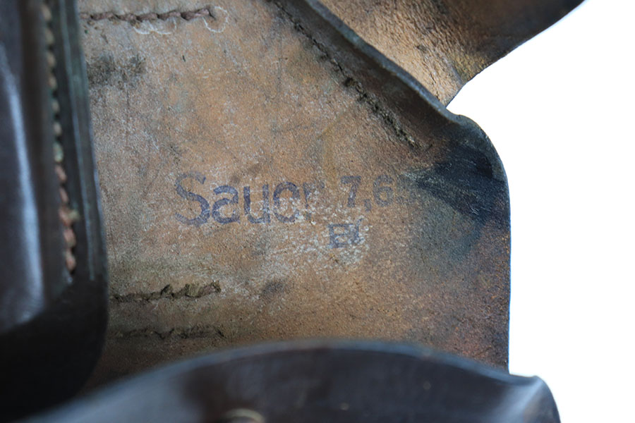 8/20/21 – This is an original, rare variation Sauer 38h holster. The holster is maker stamped Genschow & Co, and dated 1940 under the closure strap. The closure strap is also waffen proof stamped. The interior leather is Sauer 7,65 ink stamped, as shown. Unfortunately, the closure strap is broken at the hole opening for the stud. The leather is fairly rigid with some mild surface cracking. No stitching issues.