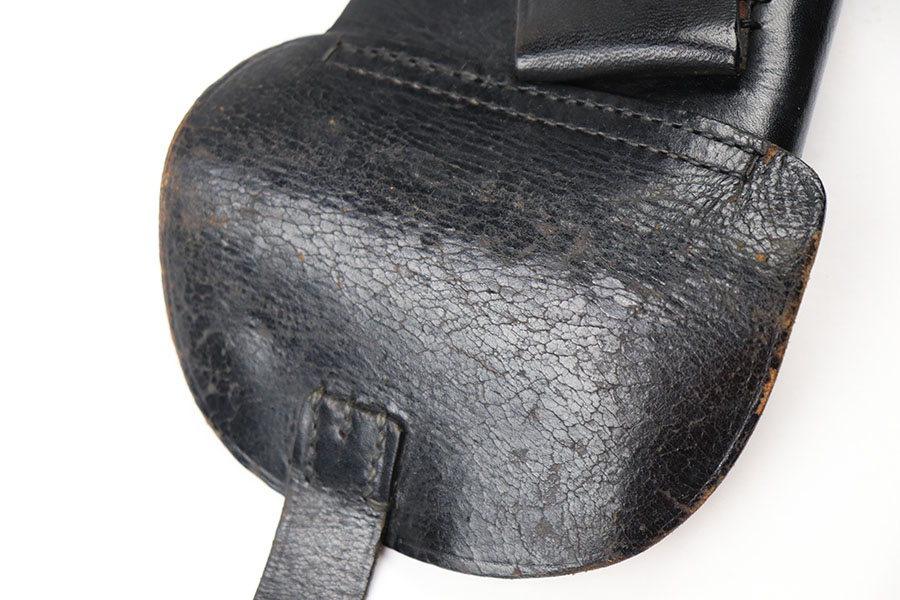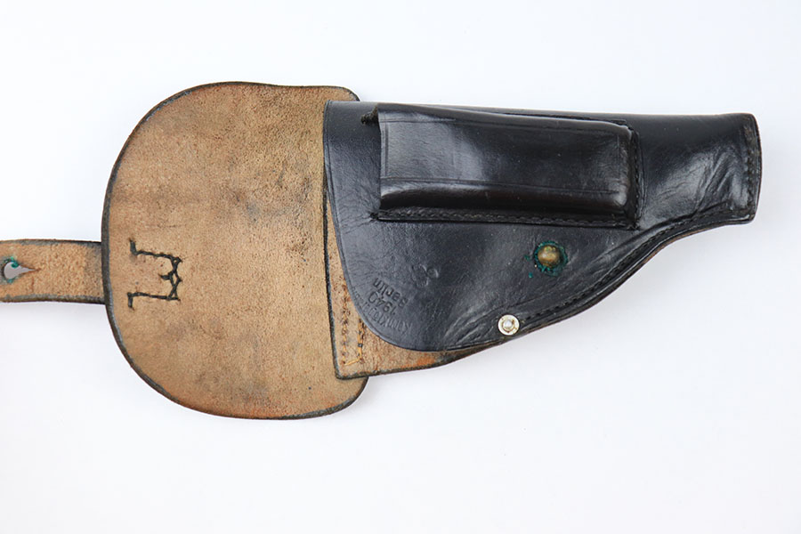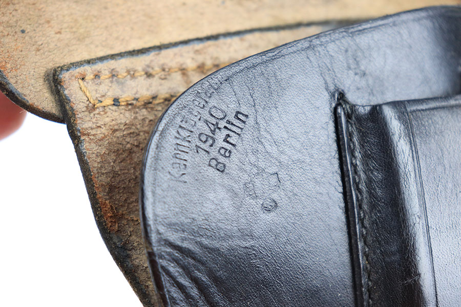9/14/21 – This is an original 1940 dated police holster for a 6.35mm pistol. Perfect for a Sauer or Behorden pistol. The holster has all original leather and stitching. The top leather has surface wrinkling but no deep cracks in the leather. Maker stamped, dated, and police eagle stamped under the closure strap.