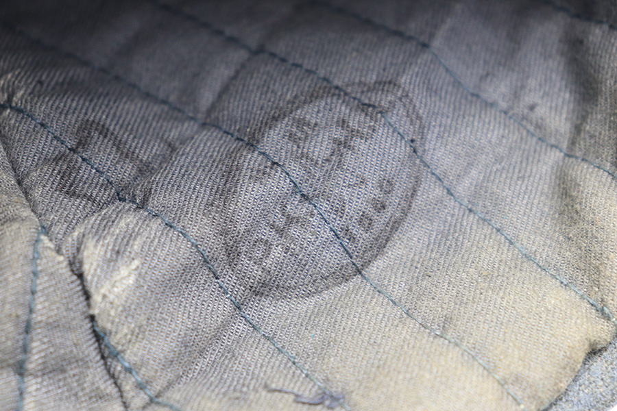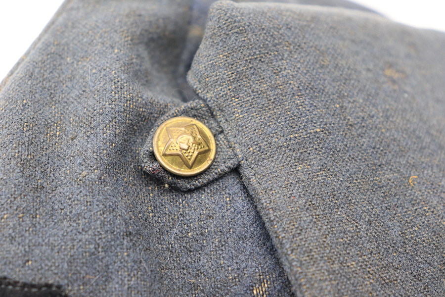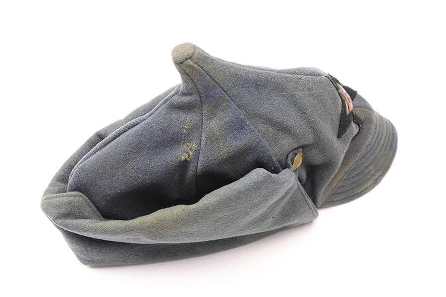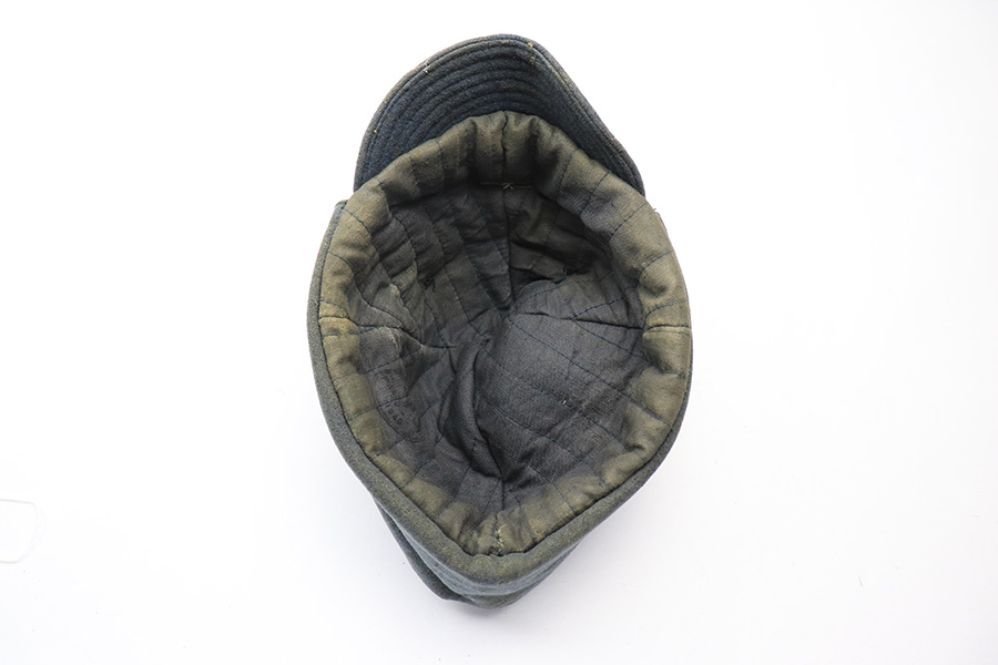 5/13/22 – This is an original 1940 Soviet Wool Budenovka cap. The cap features a black star background surrounding the Soviet emblem, which signifies this was issued to tank troops. The blue-gray wool exterior has some mild fading and signs of aging, but is in great condition overall. There is one small hole behind the right ear of the cap. The interior of the cap is ink stamped and dated 1940.