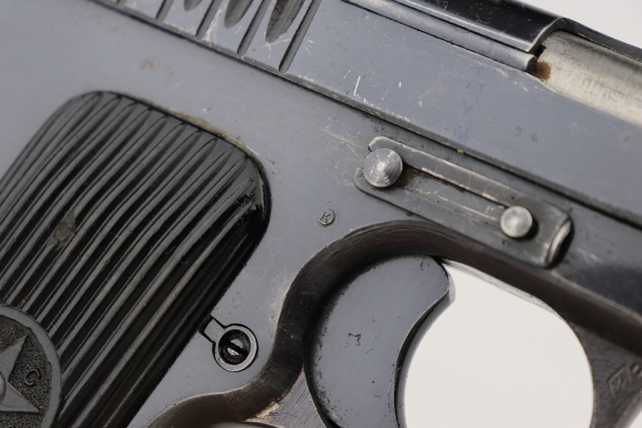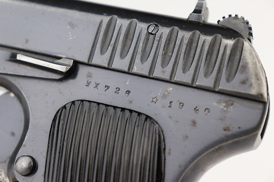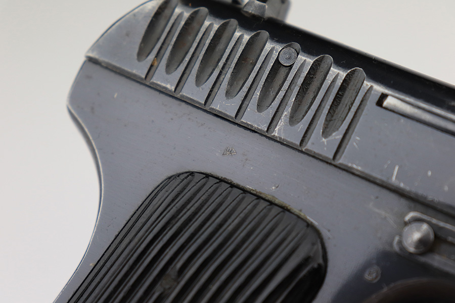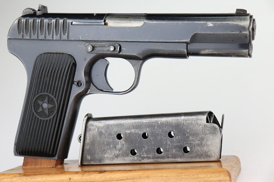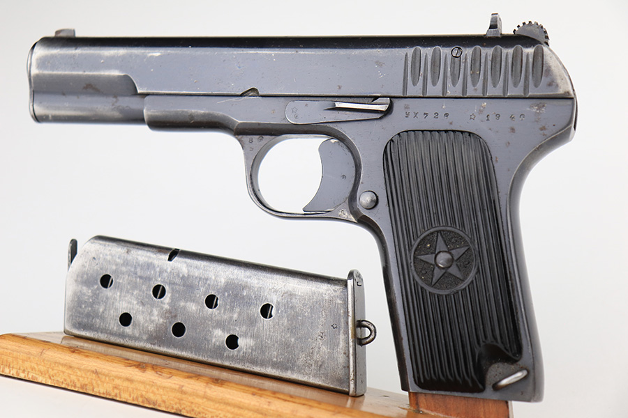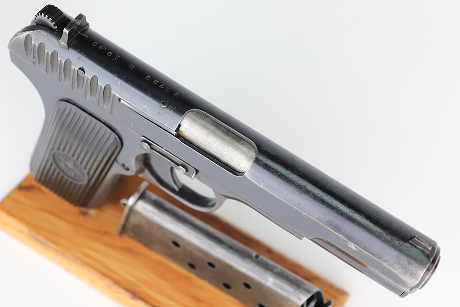 3/14/23 – This is a nice example of a Tokarev TT-33 issued to the Soviet military in 1940. This one is all matching and has the proper Soviet “Star” proofs throughout. It has retained about 93% of its original finish with minor wear around the muzzle and around the high edges in general. Light handling marks here and there along the slide and on the front strap. Excellent period-correct black bakelite grips. Comes with a period-correct but mismatched magazine. The bore has good rifling with minor freckling throughout. The hold-open does not work with this magazine.