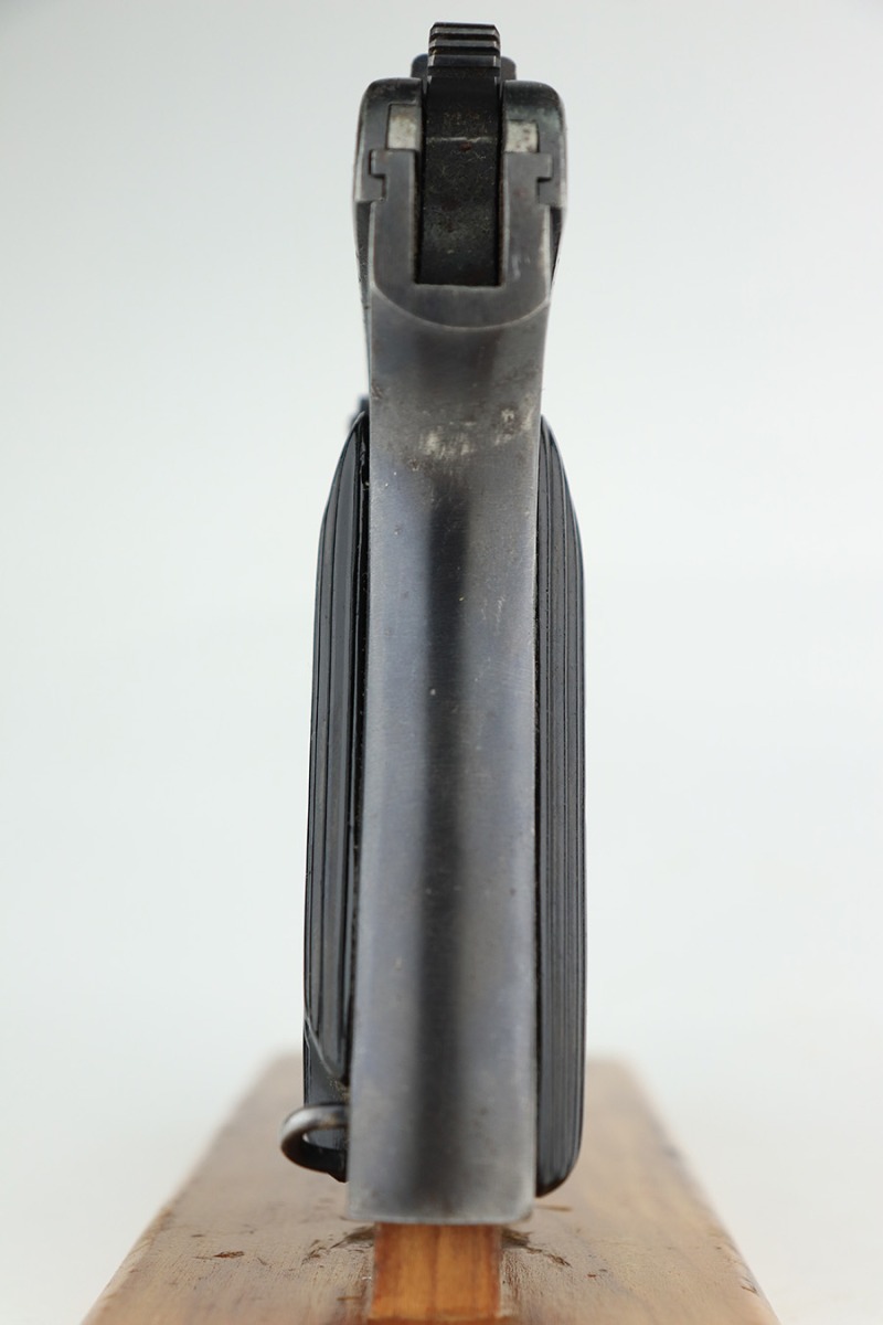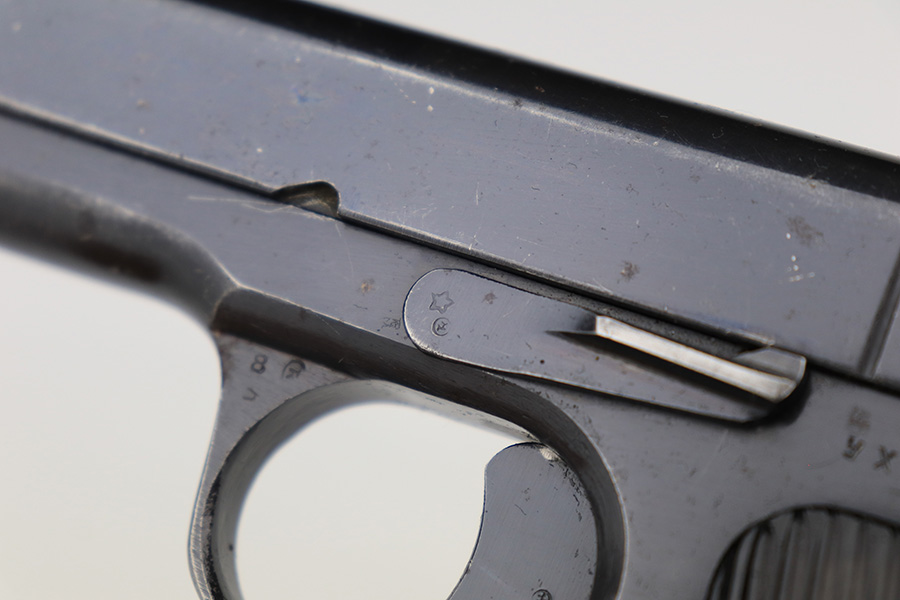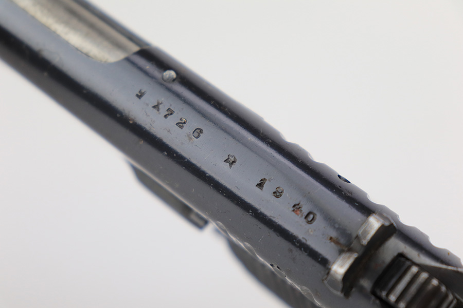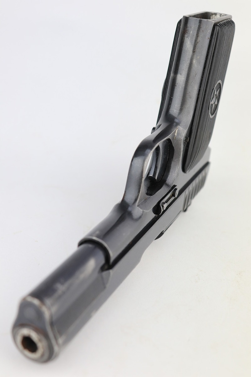 3/14/23 – This is a nice example of a Tokarev TT-33 issued to the Soviet military in 1940. This one is all matching and has the proper Soviet “Star” proofs throughout. It has retained about 93% of its original finish with minor wear around the muzzle and around the high edges in general. Light handling marks here and there along the slide and on the front strap. Excellent period-correct black bakelite grips. Comes with a period-correct but mismatched magazine. The bore has good rifling with minor freckling throughout. The hold-open does not work with this magazine.