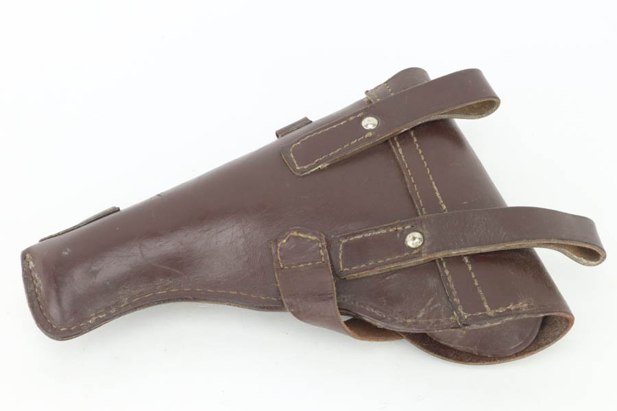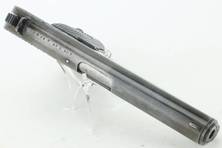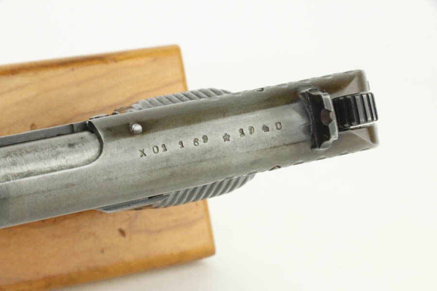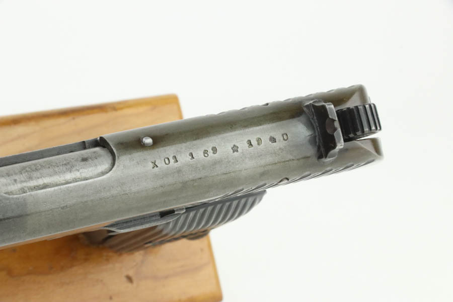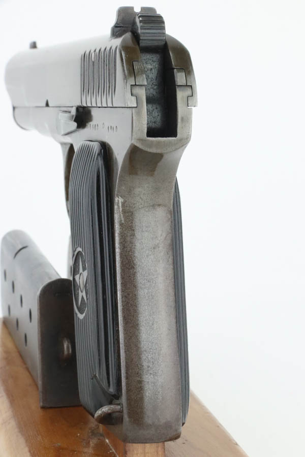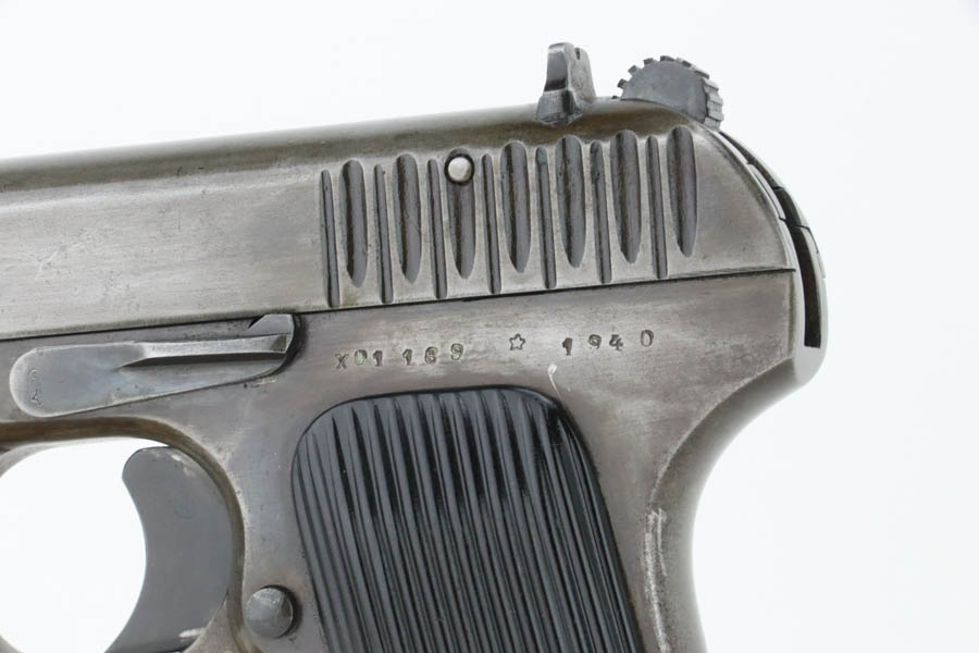 8/15/24 – This is a Tokarev TT-33 issued to the Soviet military in 1940. This one is all matching and comes with one original matching-numbered magazine. It also comes with a holster, cleaning rod, and a spare mismatched magazine. The gun has lost the majority of its finish with obvious wear throughout. Fitted with proper black bakelite grips. The bore has pretty good rifling, but there is spotty surface oxidation throughout.
