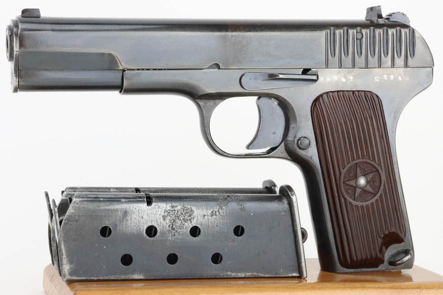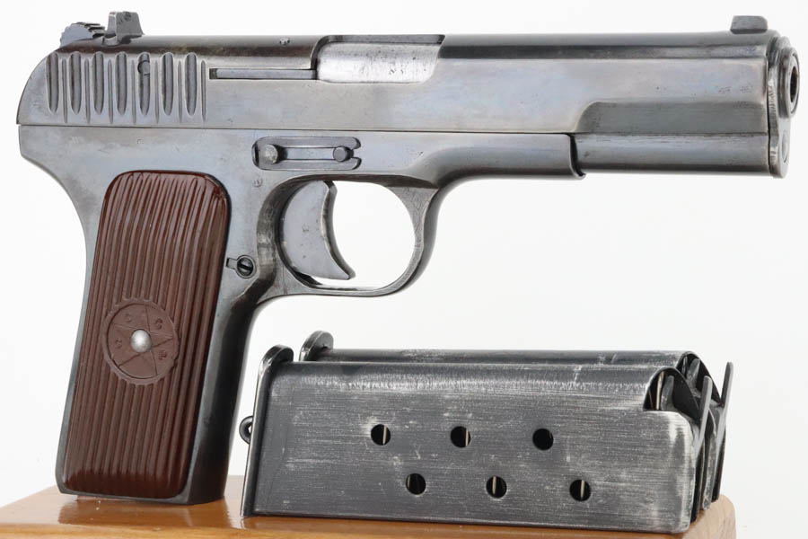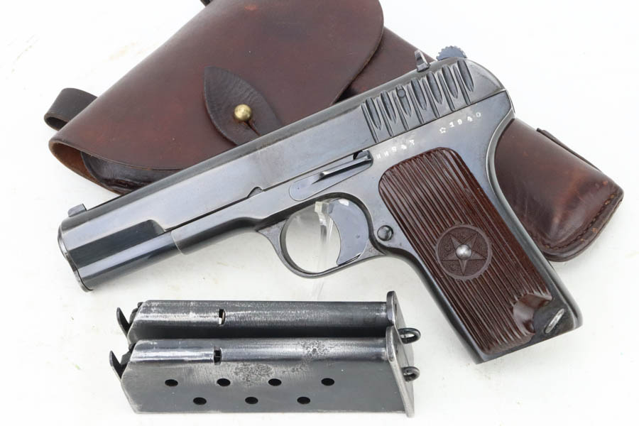 05/22/2024 – For sale is a Soviet TT-33 Tokarev handgun made in 1940. This handgun is matching on the frame, slide and barrel but has a mismatched magazine. The overall condition of the handgun is 90% as a lot of the original finish is worn on the frame and the rear half of the slide and the handgun looks to have been refinished in the past as there are some old pitting that’s finished over on the right side. The bore is clean but there is some pitting at the muzzle. The handgun comes with two mismatched magazines and a holster & cleaning rod.