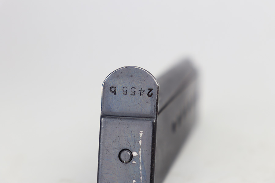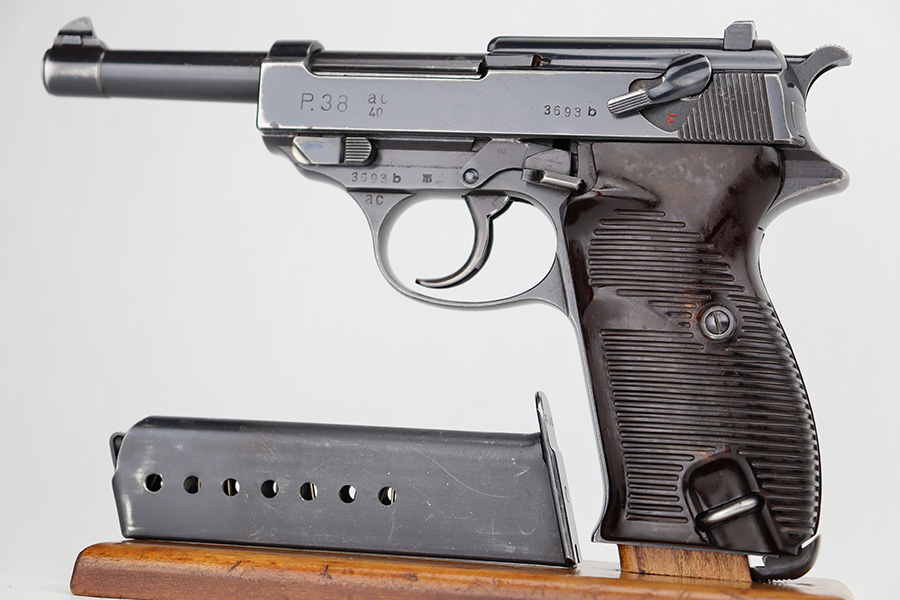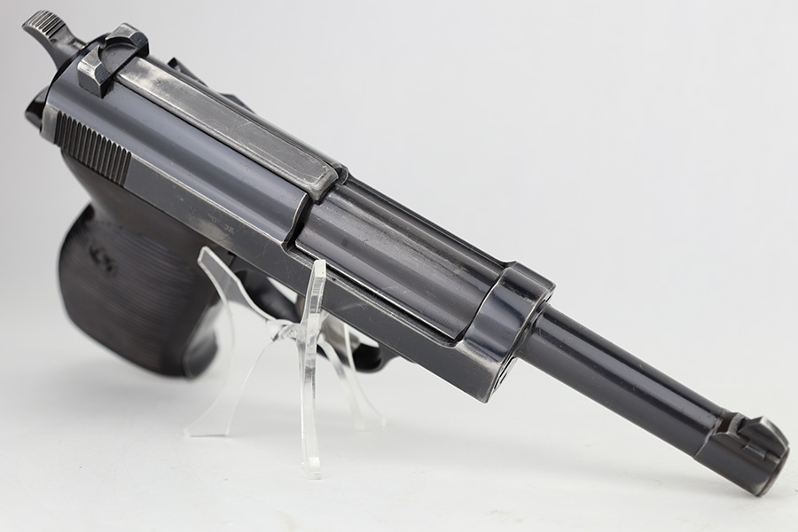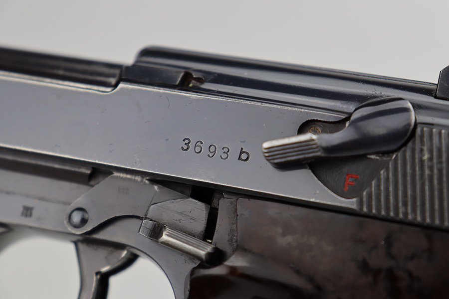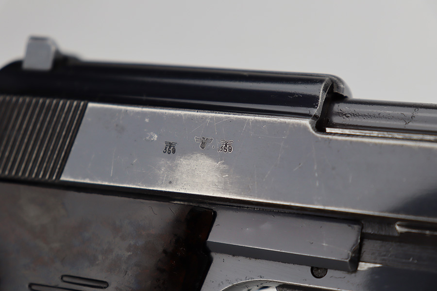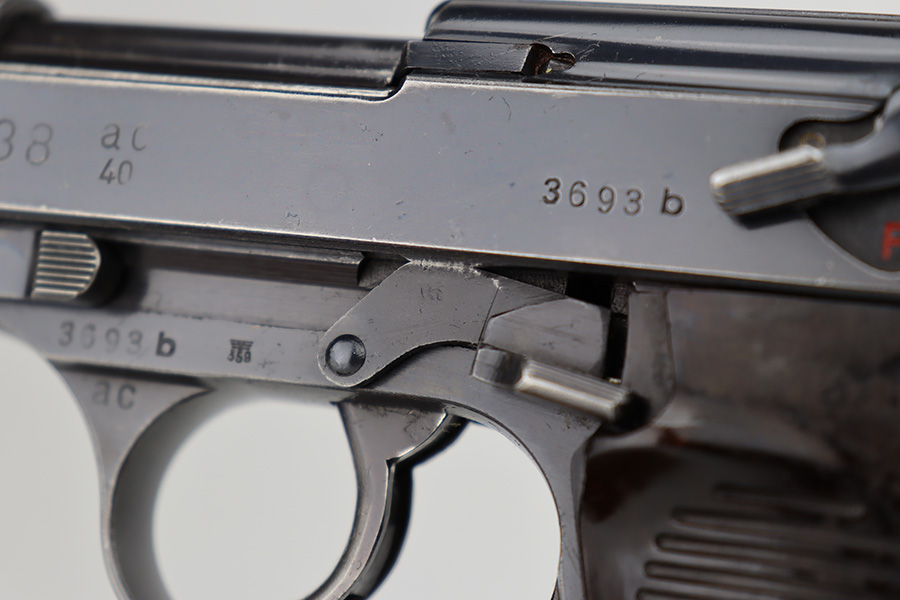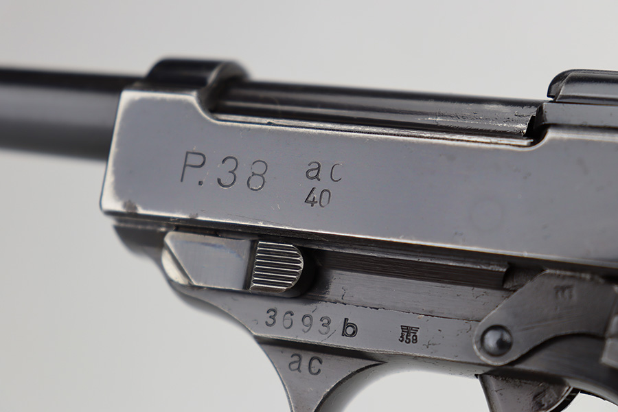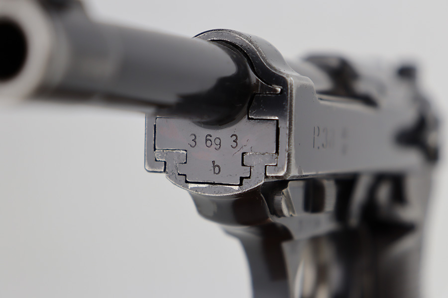6/12/23 – This is a nice example of an AC 40 Walther P.38 issued to the Nazi military in 1940. It is all matching with the proper “Eagle 359” military acceptance proofs throughout, even on the small parts. Fitted with excellent matching-numbered and waffen-proofed Walther grips. Comes with a period-correct numbered magazine in the same “b” serial block, but it is not matching to the gun. The gun itself has retained roughly 80% of its original high polish finish. The majority of the wear is on the front strap, but there is also wear around the muzzle and on the high edges of the slide in general. One small area of wear and light scratching on the right side of the slide. The bore has good rifling with minor pin-pricking throughout. De-cocker is functional.