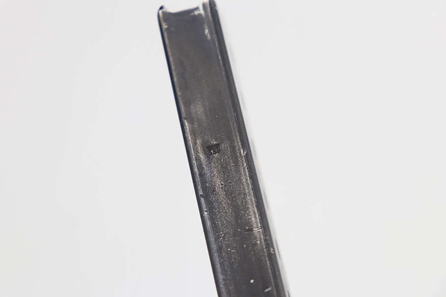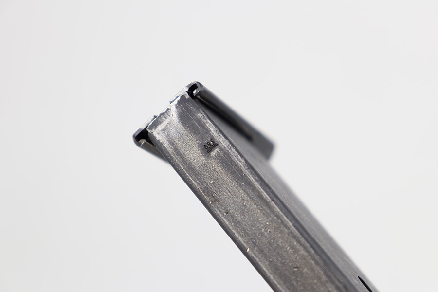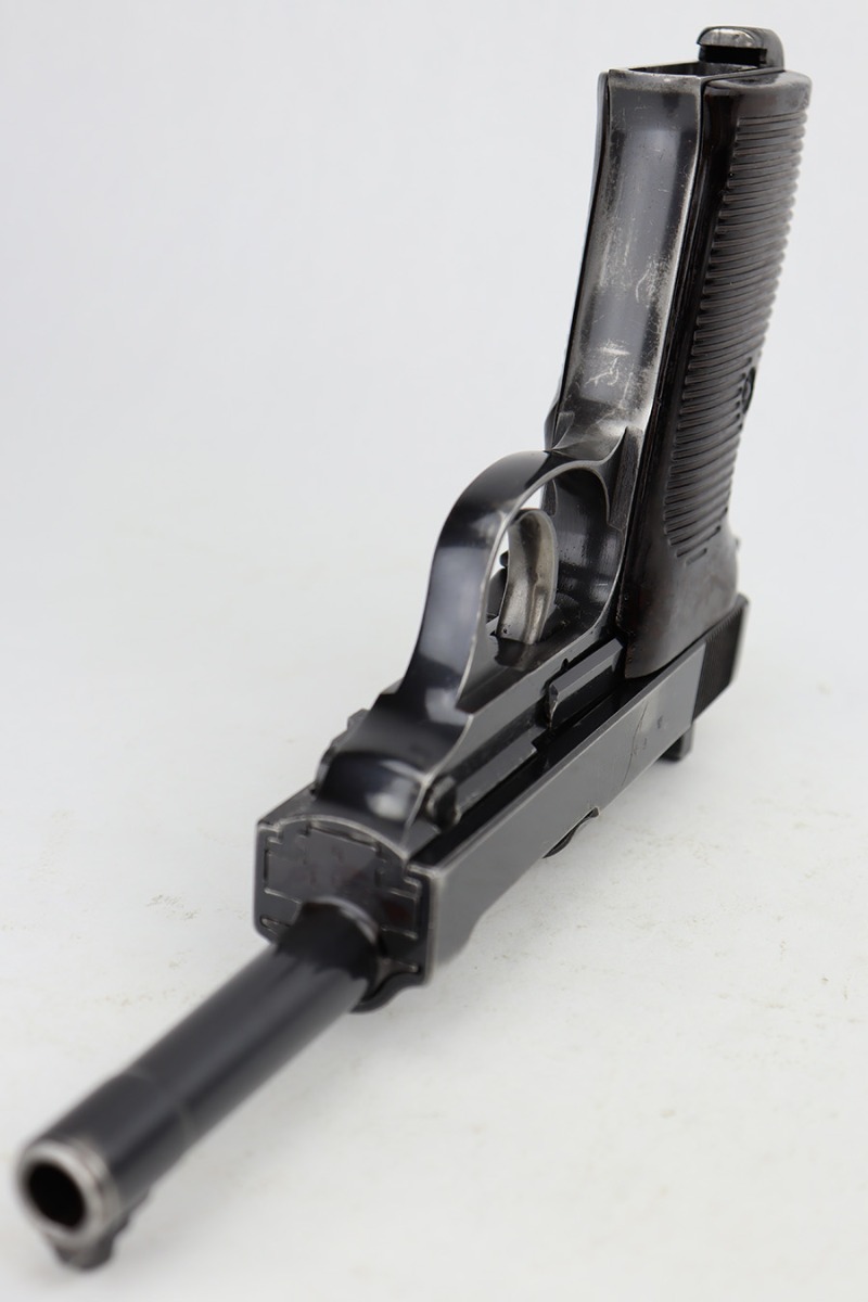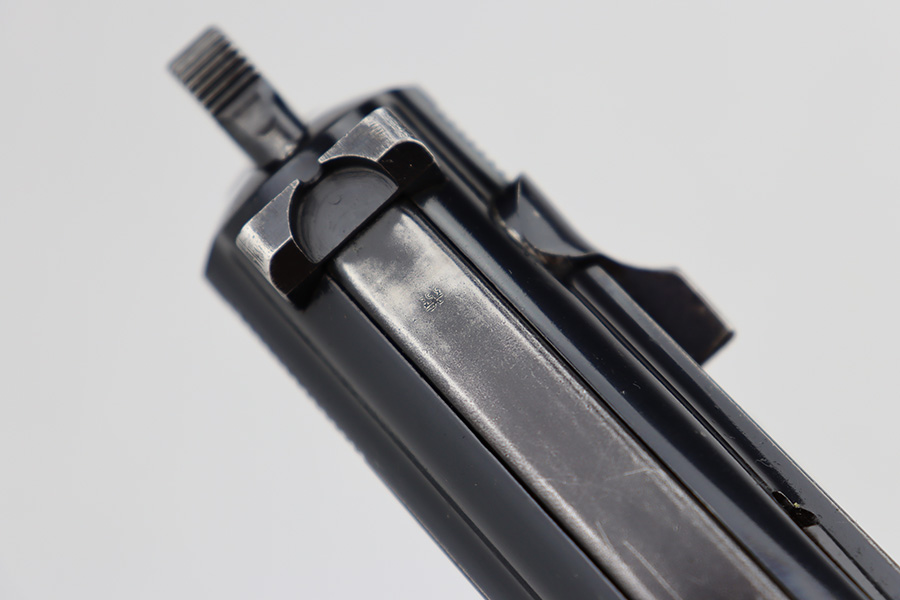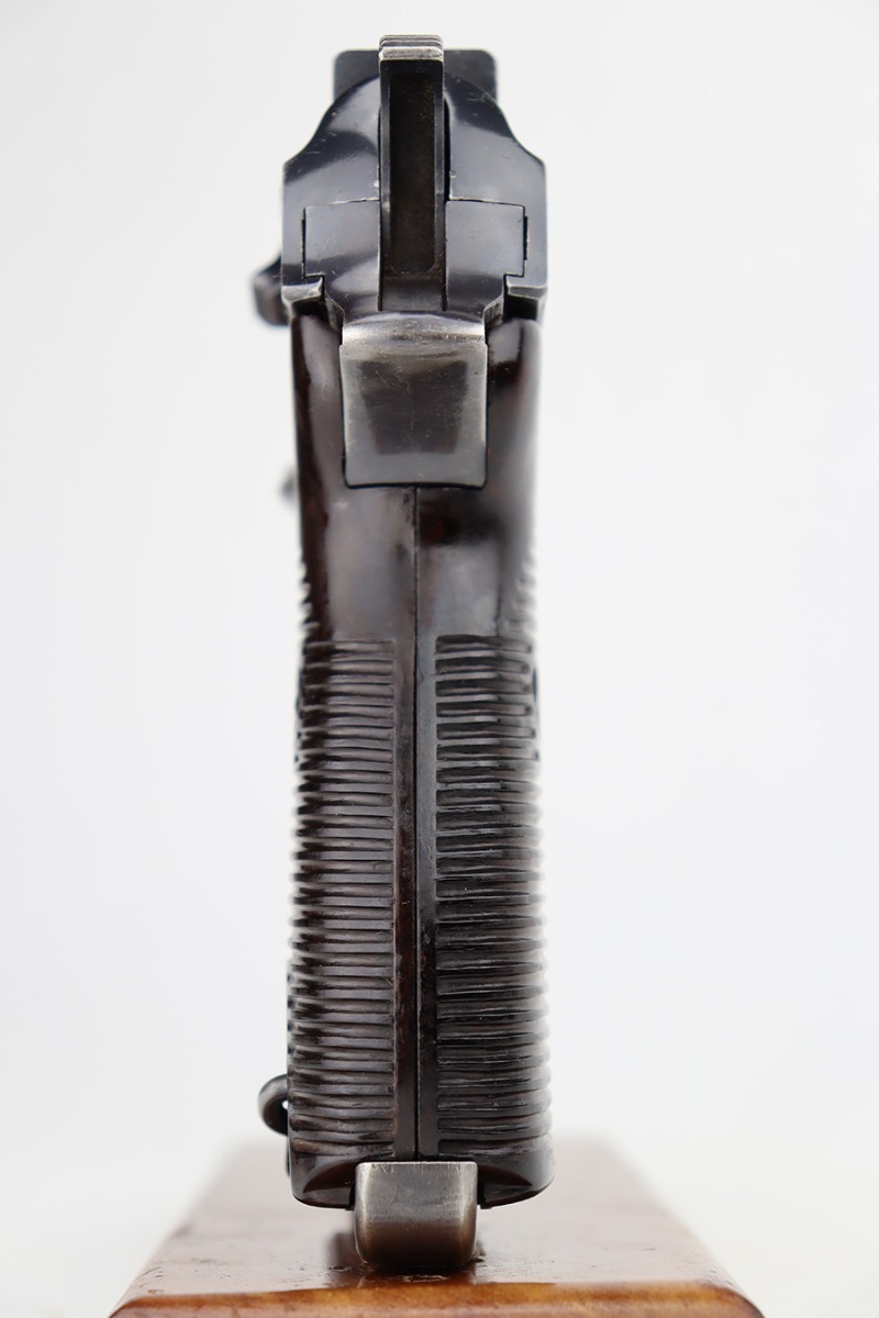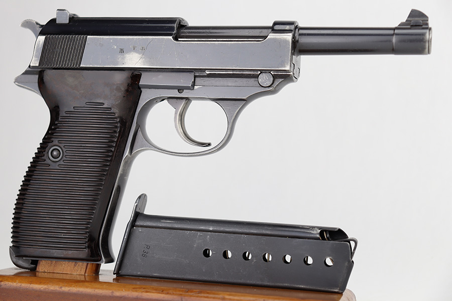 6/12/23 – This is a nice example of an AC 40 Walther P.38 issued to the Nazi military in 1940. It is all matching with the proper “Eagle 359” military acceptance proofs throughout, even on the small parts. Fitted with excellent matching-numbered and waffen-proofed Walther grips. Comes with a period-correct numbered magazine in the same “b” serial block, but it is not matching to the gun. The gun itself has retained roughly 80% of its original high polish finish. The majority of the wear is on the front strap, but there is also wear around the muzzle and on the high edges of the slide in general. One small area of wear and light scratching on the right side of the slide. The bore has good rifling with minor pin-pricking throughout. De-cocker is functional.