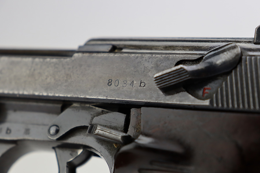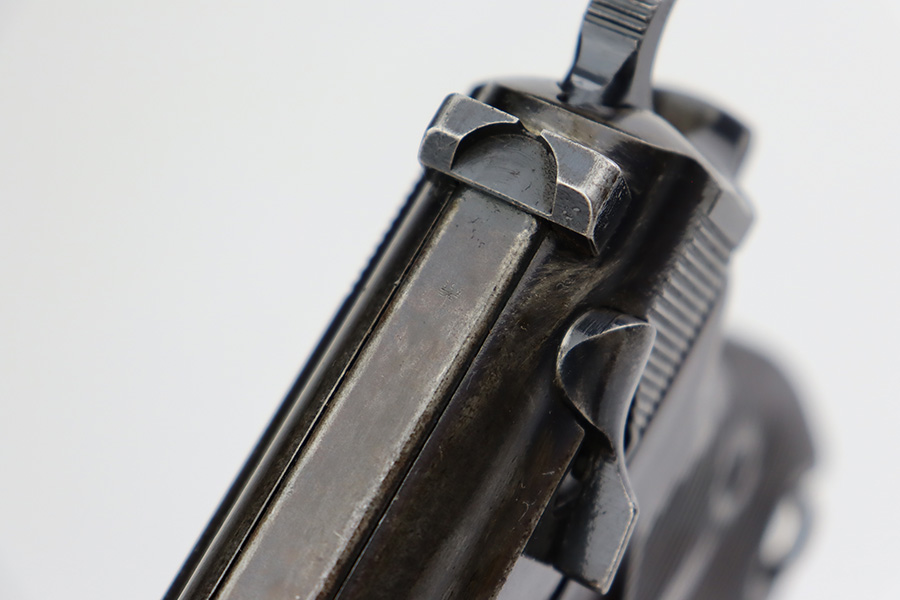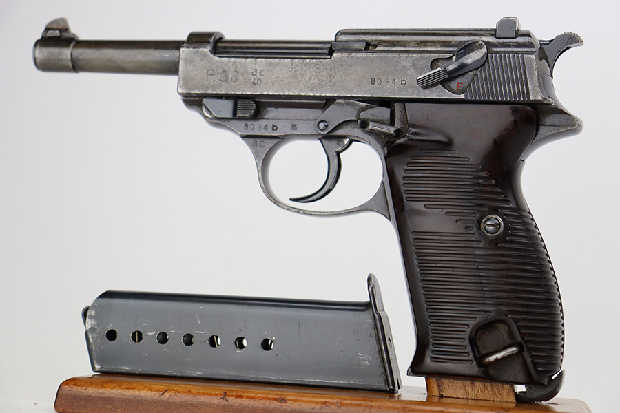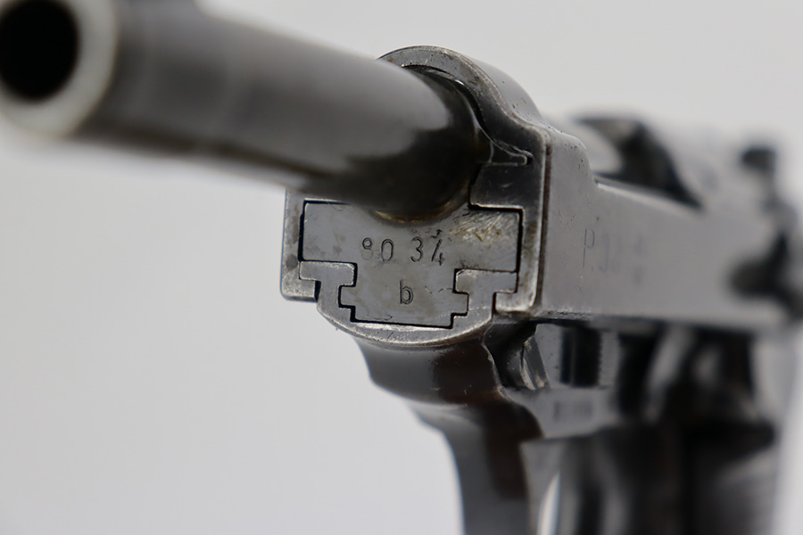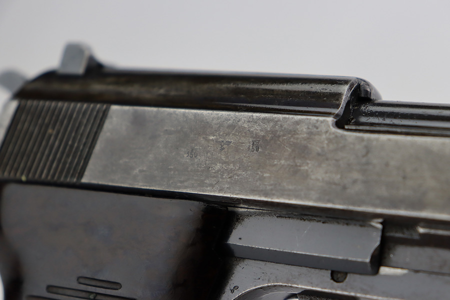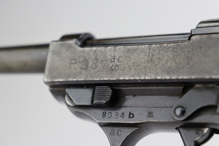 7/12/23 – This is an AC 40 Walther P.38 issued to the Nazi military in 1940. All matching with the proper “Eagle 359” military acceptance proofs throughout, even on the small parts. It has lost most of its bluing with obvious finish loss along the barrel, on the slide, and on the front strap. Splotchy discoloration and spotty oxidation throughout. Fitted with excellent matching-numbered and waffen-proofed grips. Comes with a jvd magazine. The condition of the bore is poor – oxidation and pitting throughout. De-cocker is functional.