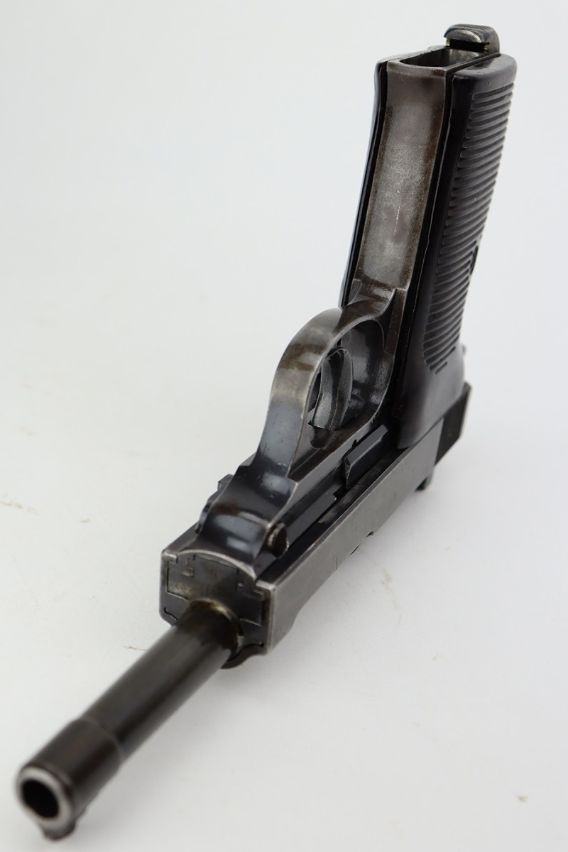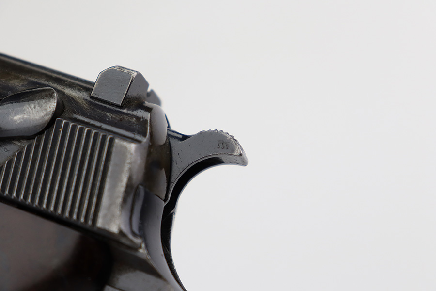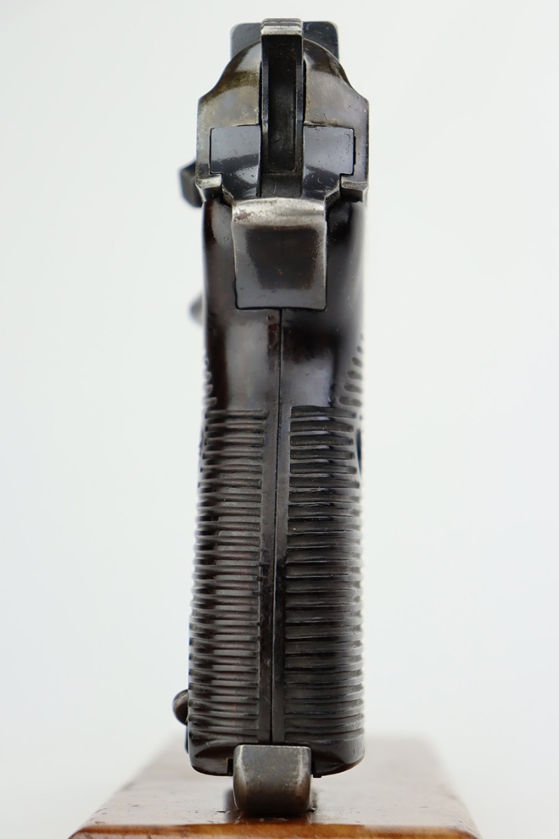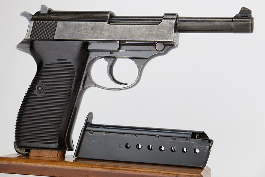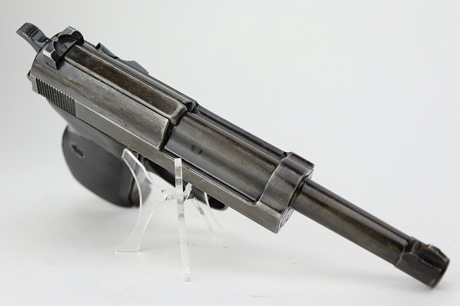 7/12/23 – This is an AC 40 Walther P.38 issued to the Nazi military in 1940. All matching with the proper “Eagle 359” military acceptance proofs throughout, even on the small parts. It has lost most of its bluing with obvious finish loss along the barrel, on the slide, and on the front strap. Splotchy discoloration and spotty oxidation throughout. Fitted with excellent matching-numbered and waffen-proofed grips. Comes with a jvd magazine. The condition of the bore is poor – oxidation and pitting throughout. De-cocker is functional.