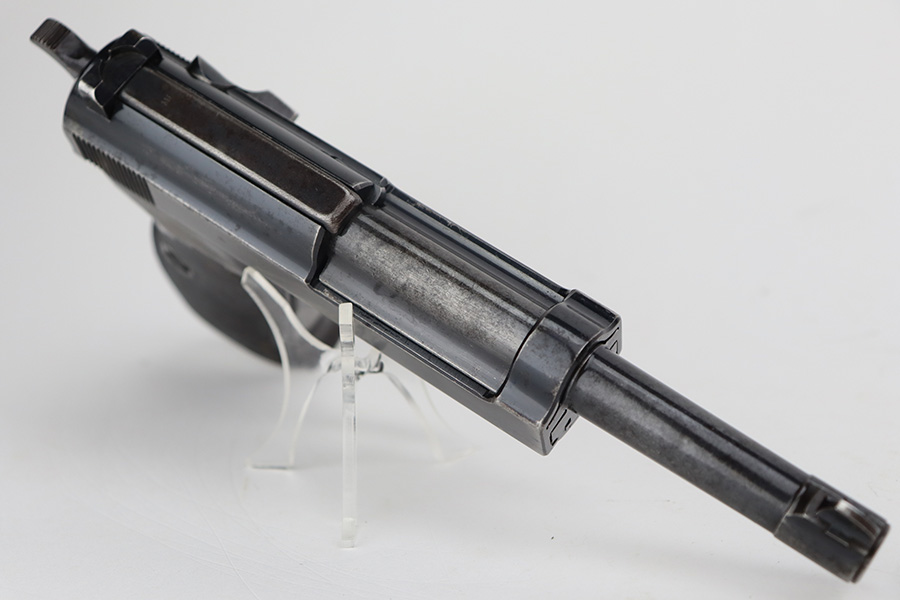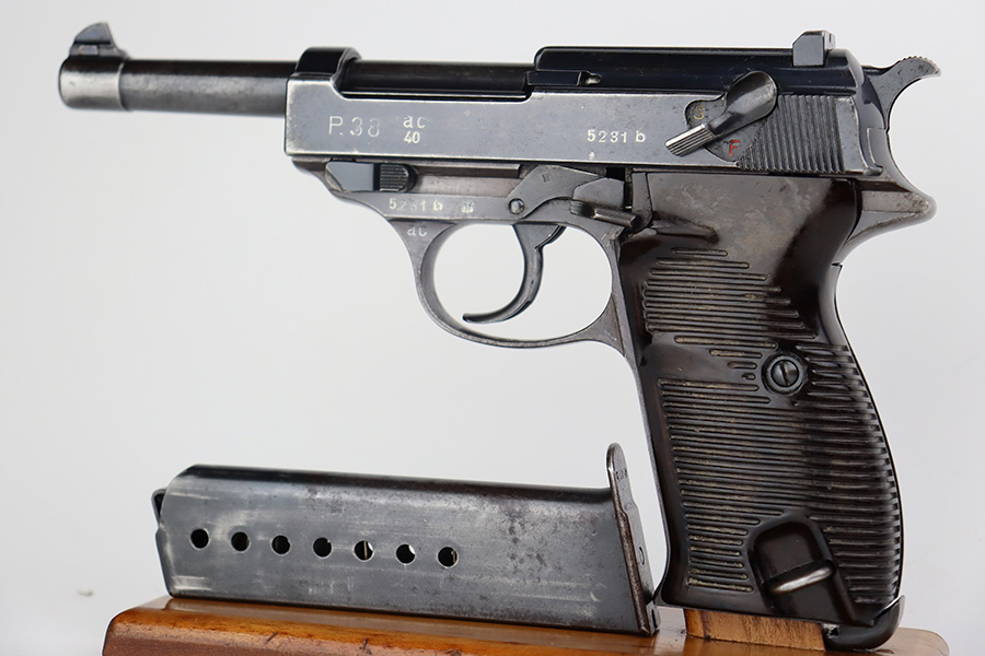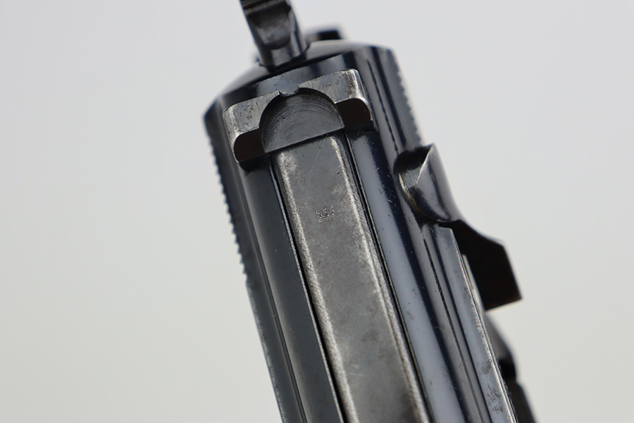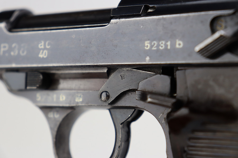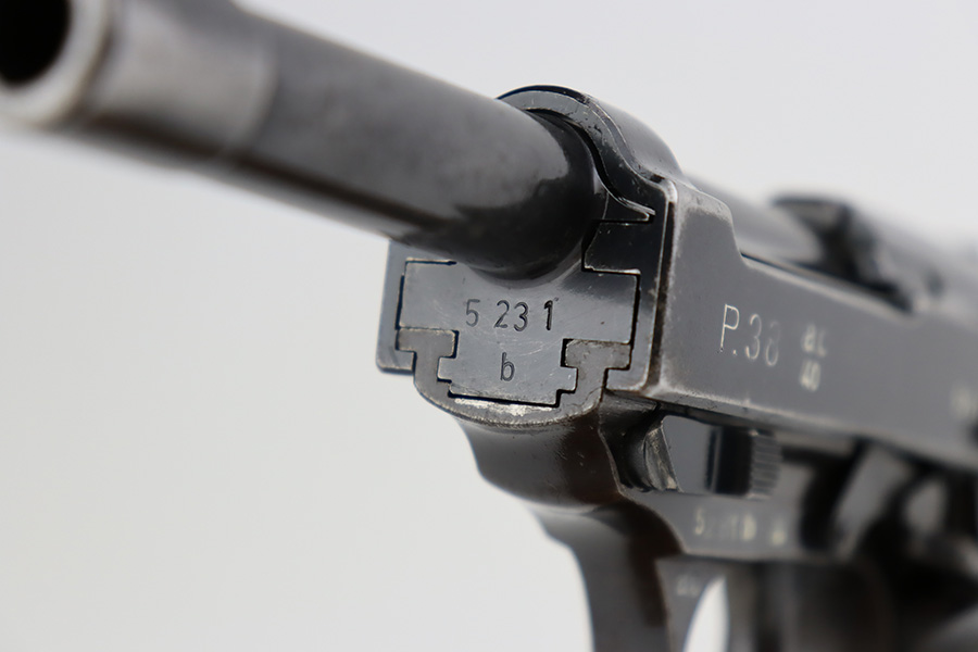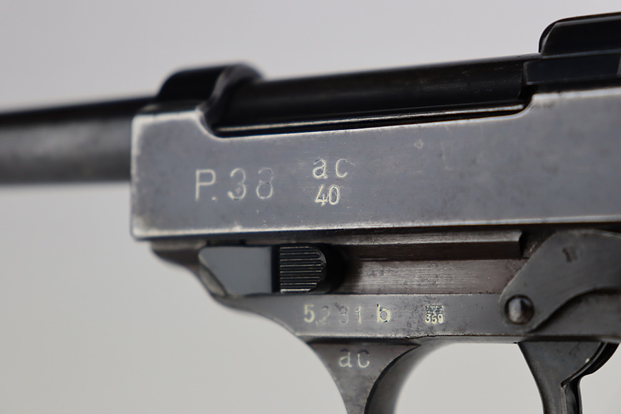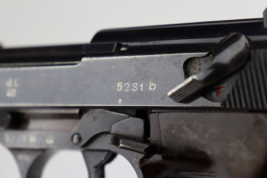 8/24/23 – This is a nice example of an AC 40 Walther P.38 issued to the Nazi military in 1940. It is all matching and has the proper “Eagle 359” military acceptance proofs throughout, even on the small parts. The grips are also matching-numbered and waffen-proofed. It comes with a numbered magazine in the same “b” serial block, but it is mismatched. The gun itself has retained roughly 65% of its original high polish finish. There is obvious spotty wear and spotty oxidation throughout. Very nice bore with great rifling. De-cocker is functional.