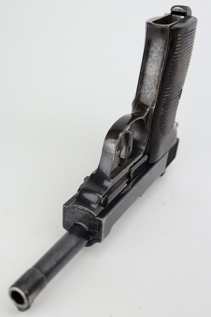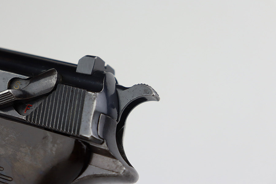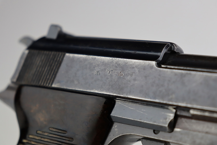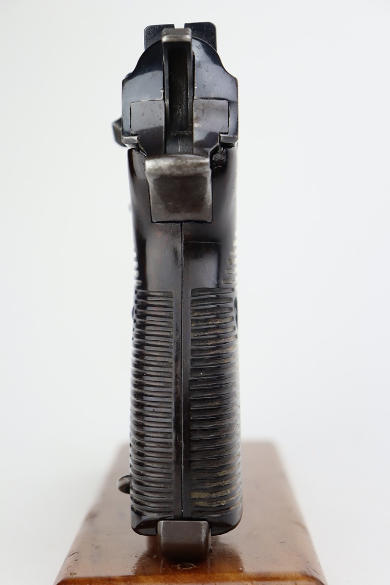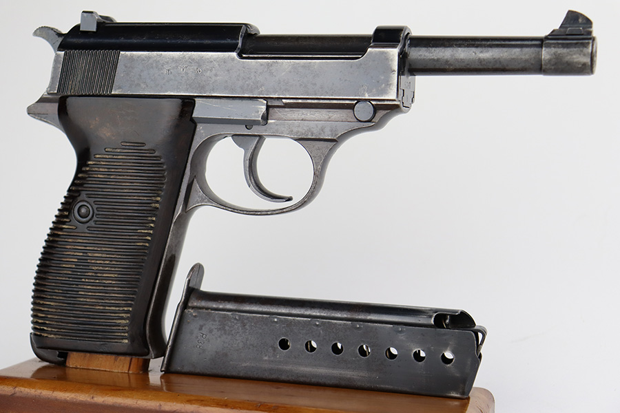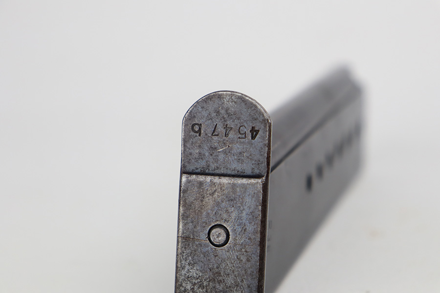 8/24/23 – This is a nice example of an AC 40 Walther P.38 issued to the Nazi military in 1940. It is all matching and has the proper “Eagle 359” military acceptance proofs throughout, even on the small parts. The grips are also matching-numbered and waffen-proofed. It comes with a numbered magazine in the same “b” serial block, but it is mismatched. The gun itself has retained roughly 65% of its original high polish finish. There is obvious spotty wear and spotty oxidation throughout. Very nice bore with great rifling. De-cocker is functional.