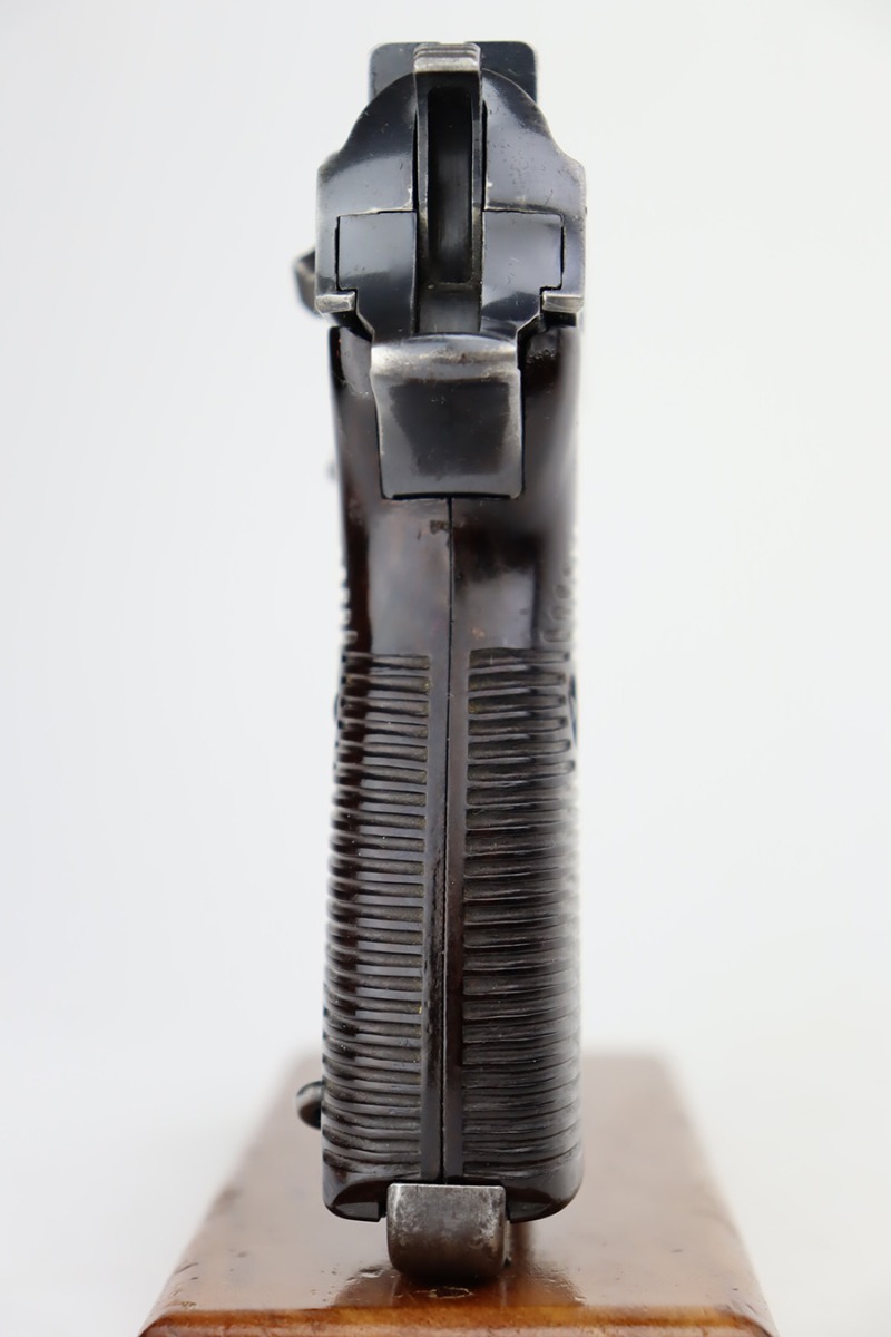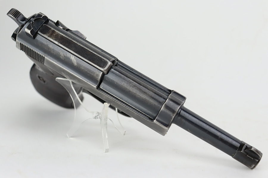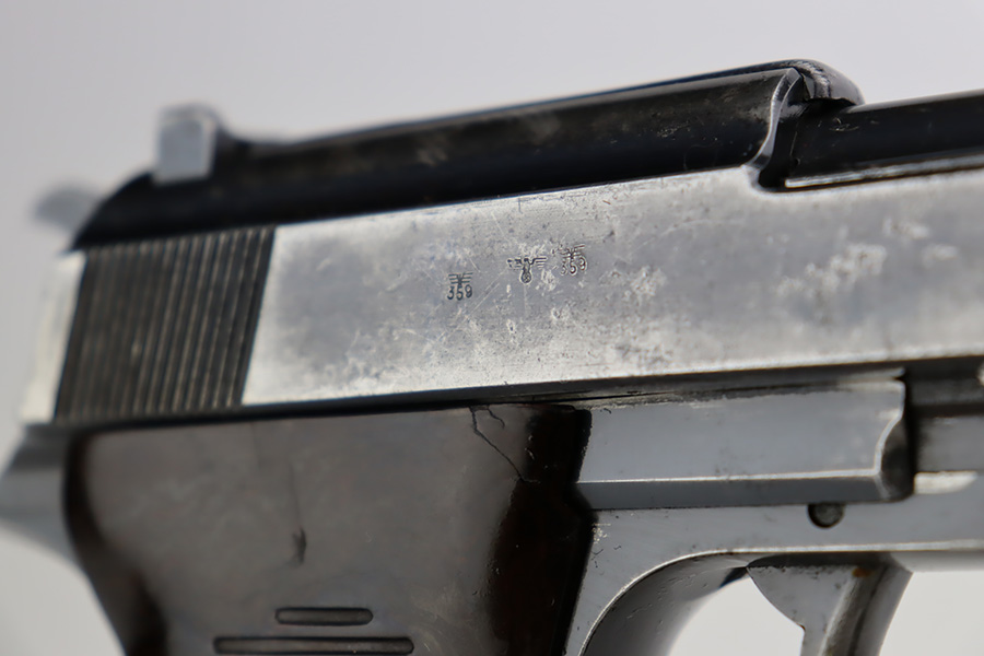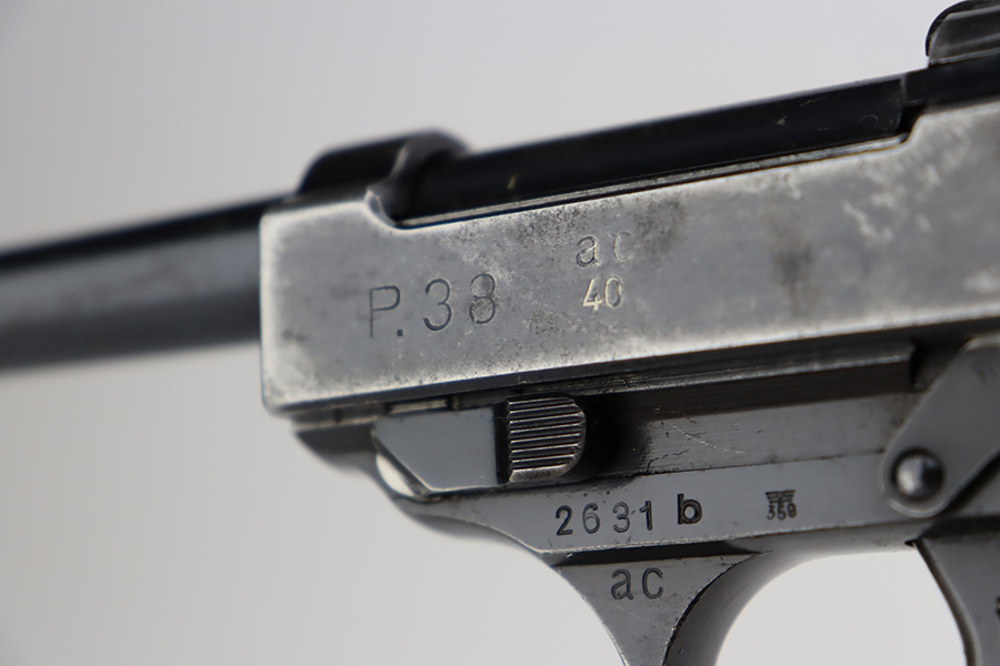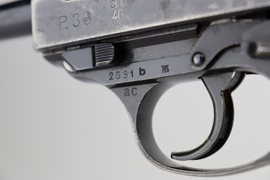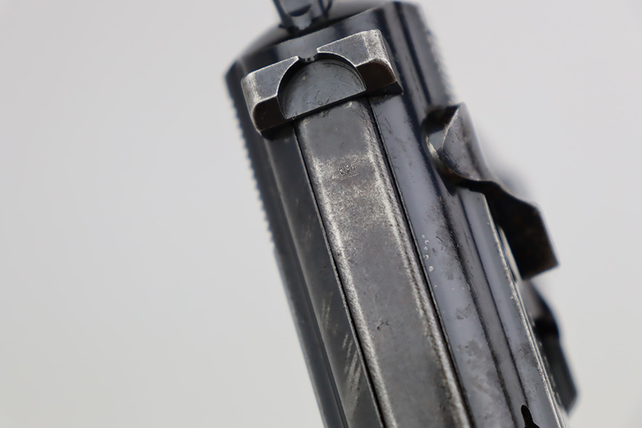 9/20/23 – This is an AC 40 Walther P.38 issued to the Nazi military in 1940. It is all matching and has the proper “Eagle 359” military acceptance proofs throughout, even on the small parts. The grips are also matching-numbered and “Eagle 359” proofed – a couple of small cracks on the right side. The gun has retained roughly 60% of its original high polish finish with areas of obvious wear and spotty oxidation on the front strap, on both sides of the slide, and around the muzzle. Some tiny pits here and there along the slide. The bore has strong rifling, but there is some light frosting in the grooves. De-cocker is functional.