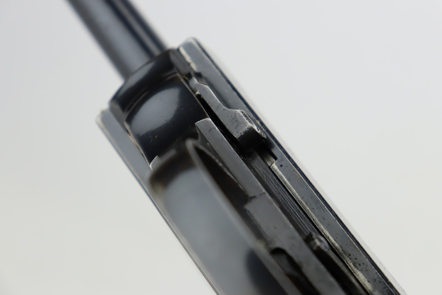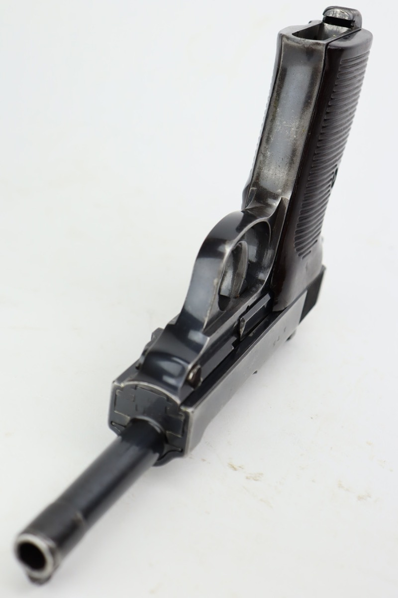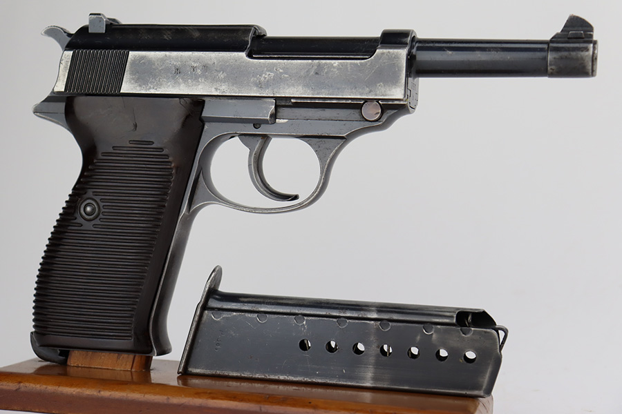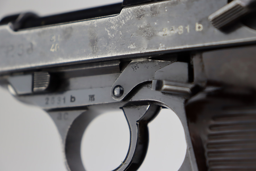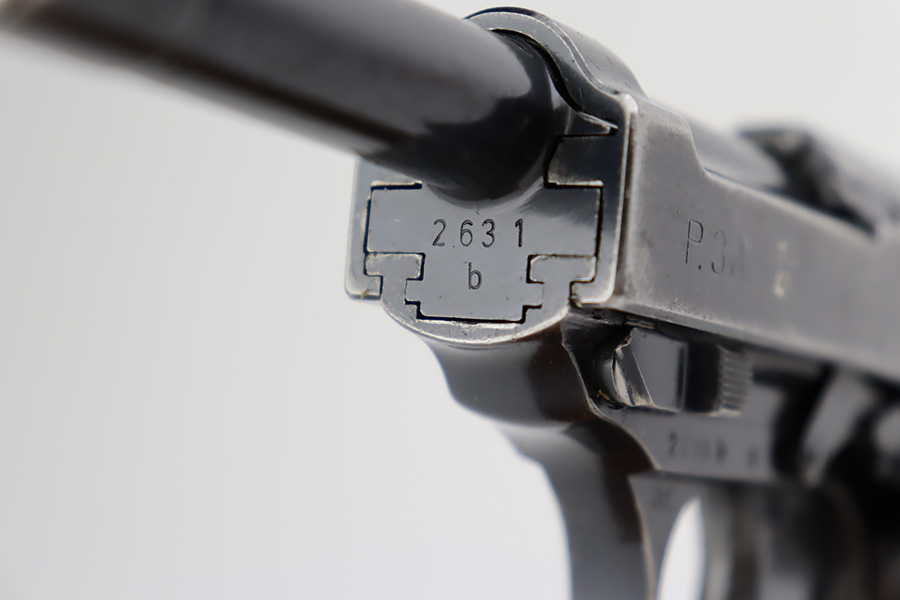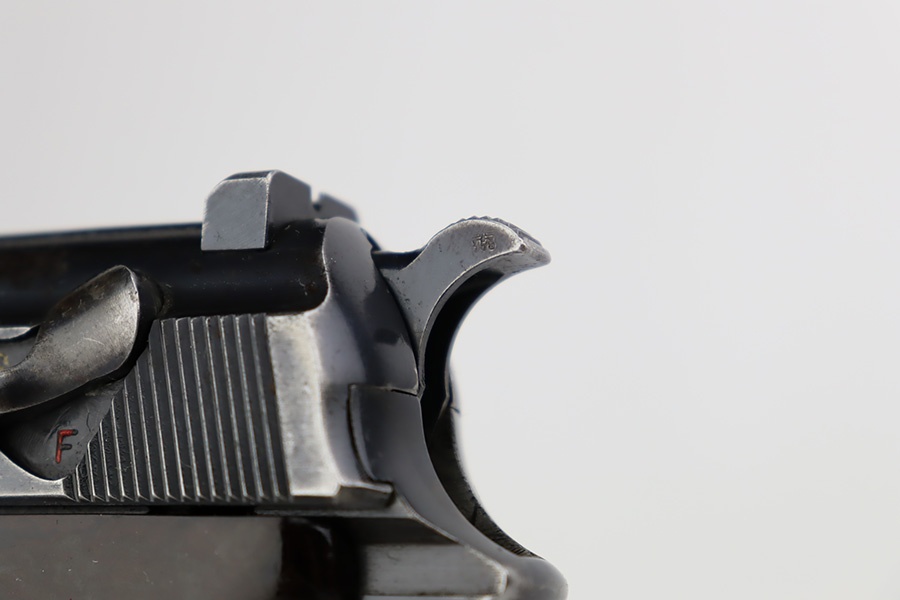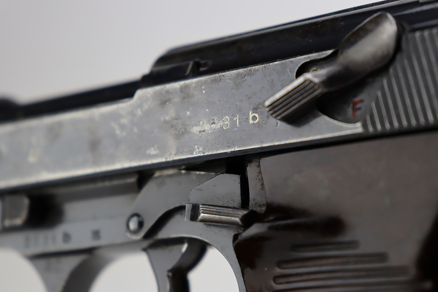 9/20/23 – This is an AC 40 Walther P.38 issued to the Nazi military in 1940. It is all matching and has the proper “Eagle 359” military acceptance proofs throughout, even on the small parts. The grips are also matching-numbered and “Eagle 359” proofed – a couple of small cracks on the right side. The gun has retained roughly 60% of its original high polish finish with areas of obvious wear and spotty oxidation on the front strap, on both sides of the slide, and around the muzzle. Some tiny pits here and there along the slide. The bore has strong rifling, but there is some light frosting in the grooves. De-cocker is functional.