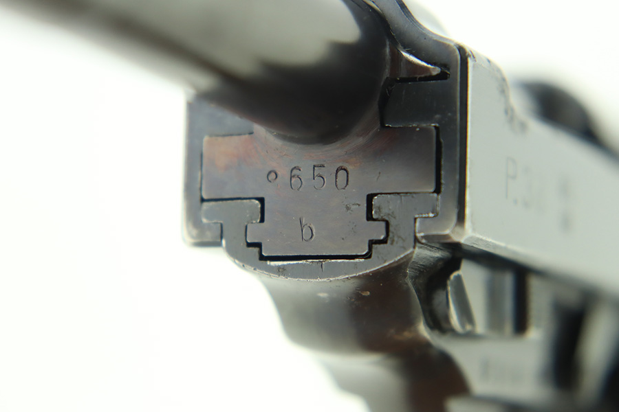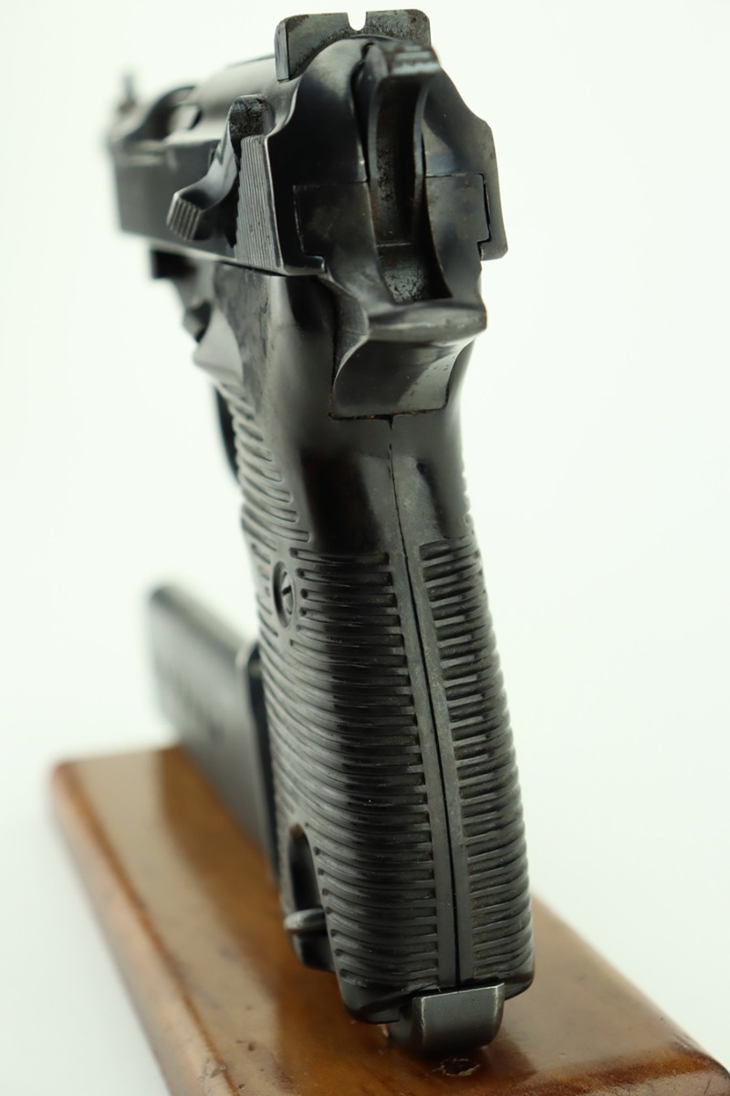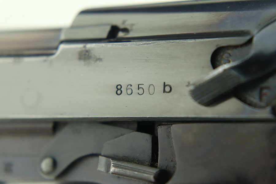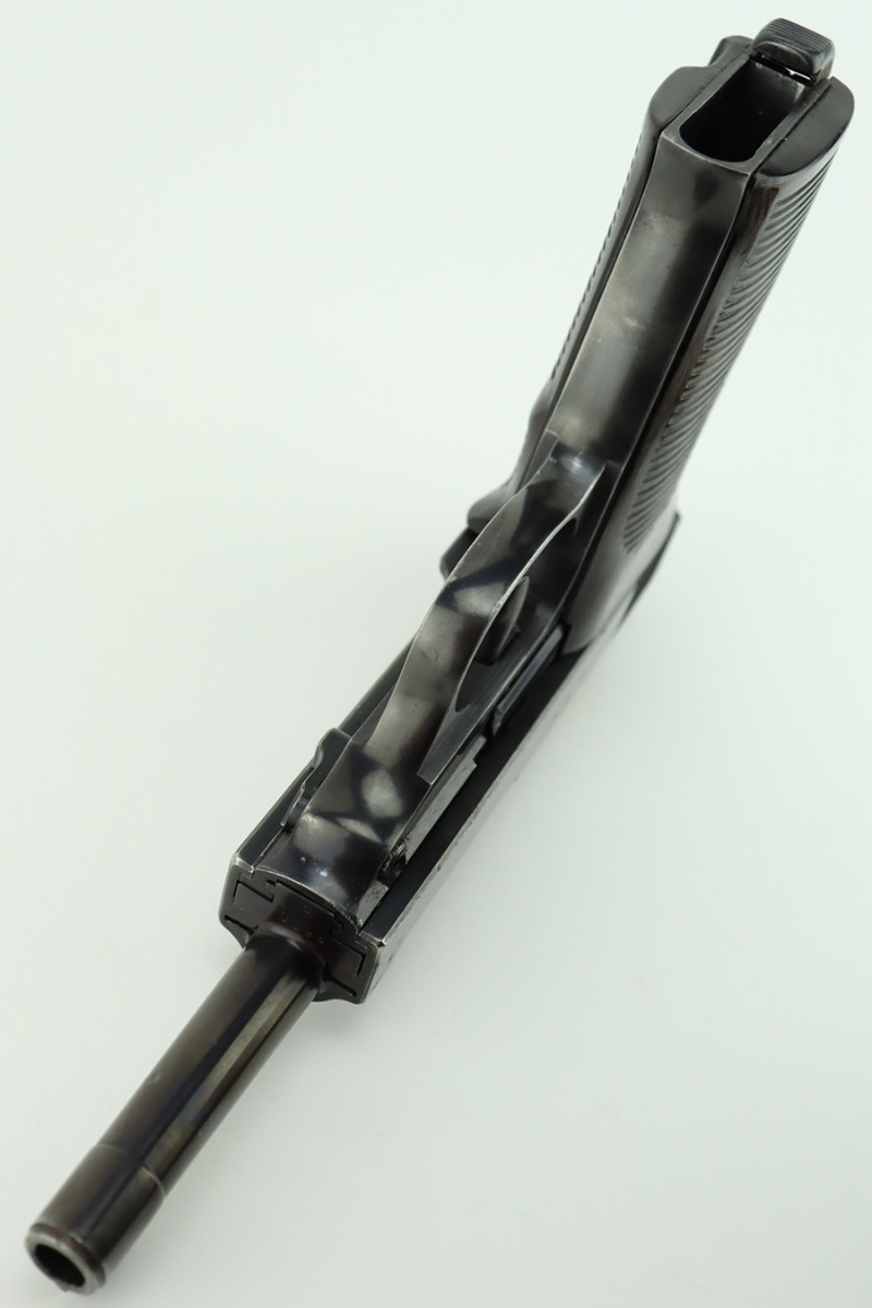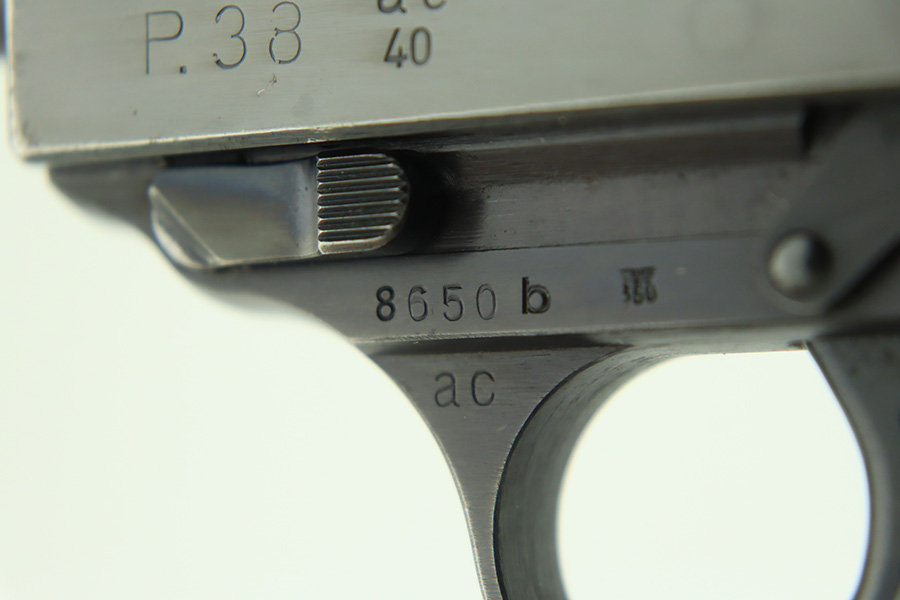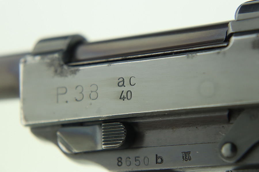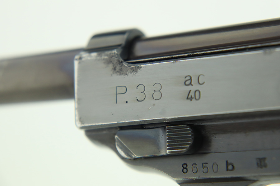 1/12/24 – This is a very nice example of an AC 40 Walther P.38 issued to the Nazi military in 1940. It is all matching with the proper “Eagle 359” military acceptance proofs throughout. Its original high polish finish rates about 94-95%. There is thinning on the front strap, general high edge wear, wear around the muzzle, and a few small dots of wear on the left side of the barrel. While there is very little actual finish loss, there are small spots of pitting here and there. Fitted with original matching-numbered grips. Comes with a mismatched but close-in-number magazine. Like-new bore. De-cocker is functional.