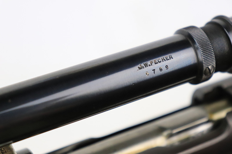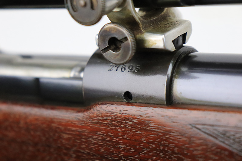 10/5/22 – This is a very nice example of an early Winchester Model 70, manufactured in 1940 and chambered in .22 Hornet. The gun is all matching and comes equipped with an original J.W. Fecker rifle scope (excellent optics) and original J.W. Fecker scope mounts. The gun is very nice. The barrel and receiver have very little signs of wear except for a few tiny handling marks. The majority of the finish loss is on the floor plate and trigger group, where there is also some brown patina. Minty wood stock. Comes with a period-correct leather sling. The bore is like-new.