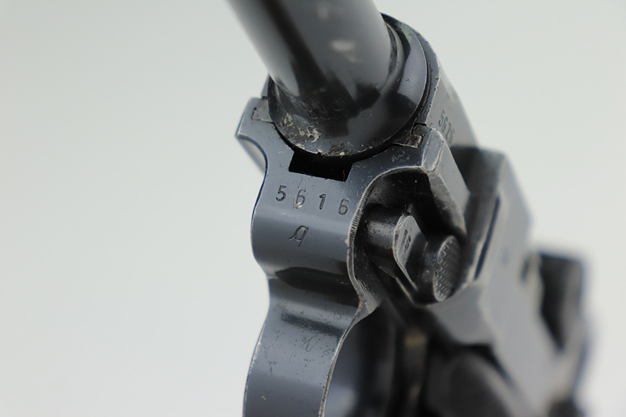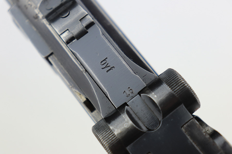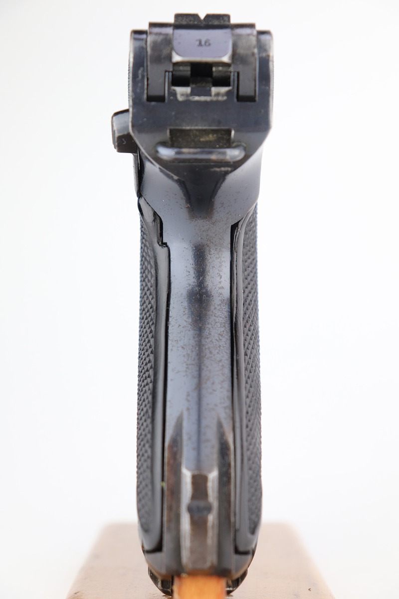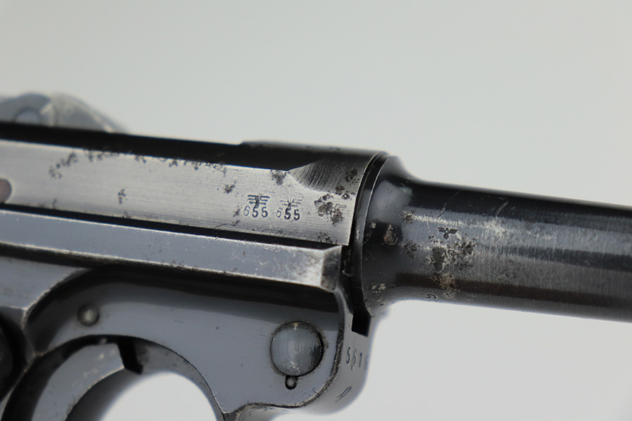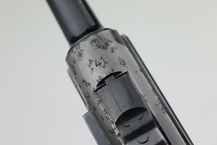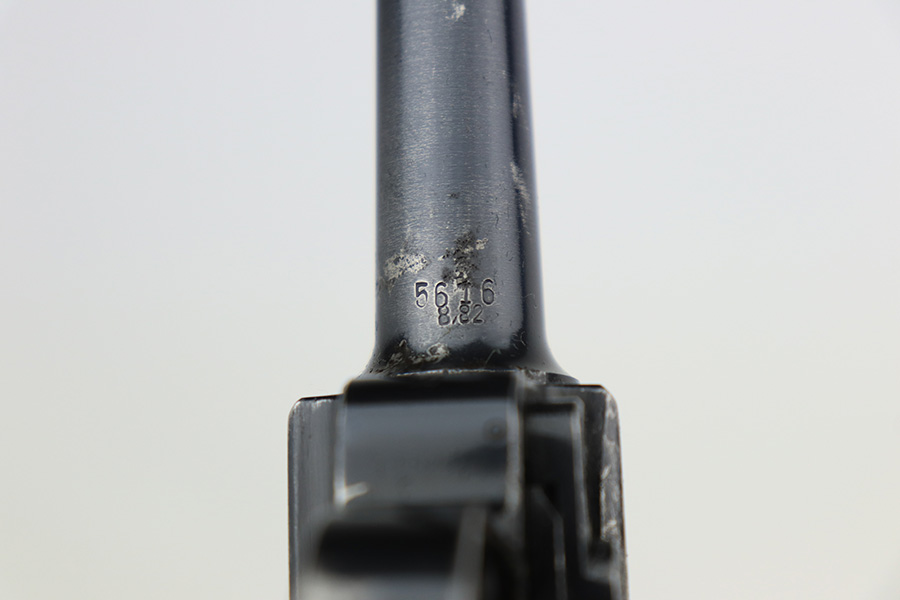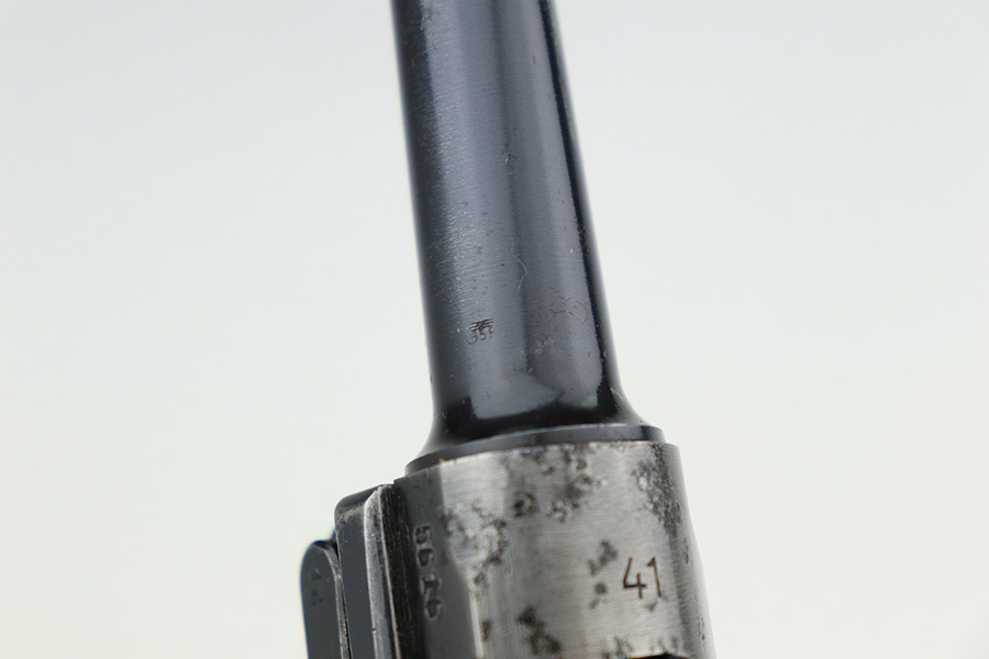 3/6/23 – This is a nice example of a BYF 41 “Black Widow” Mauser Luger issued to the Nazi military in 1941. It is all matching, has the proper “Eagle 655” military acceptance proofs. It comes with one period-correct black bakelite “black widow” magazine and it is fitted with a set of high quality reproduction grips. The gun itself has retained about 90-92% of its original bluing. The majority of the bluing loss is on the chamber and on the right side of the slide, but there is also minor wear around the muzzle and on the side plate, and there is spotty wear along the barrel. There is freckling on both grip straps and some spotty oxidation with tiny pitting on the chamber. The bore has strong rifling, but there is light freckling throughout.