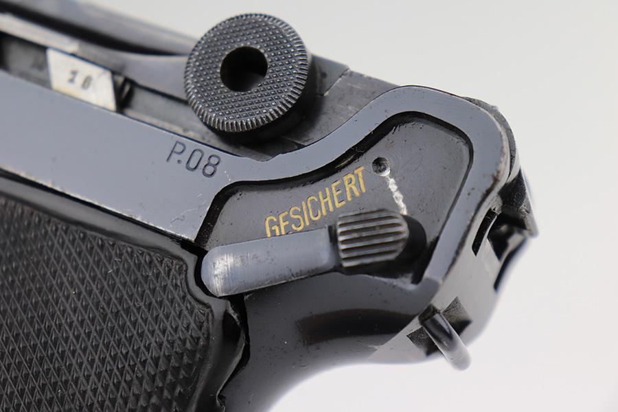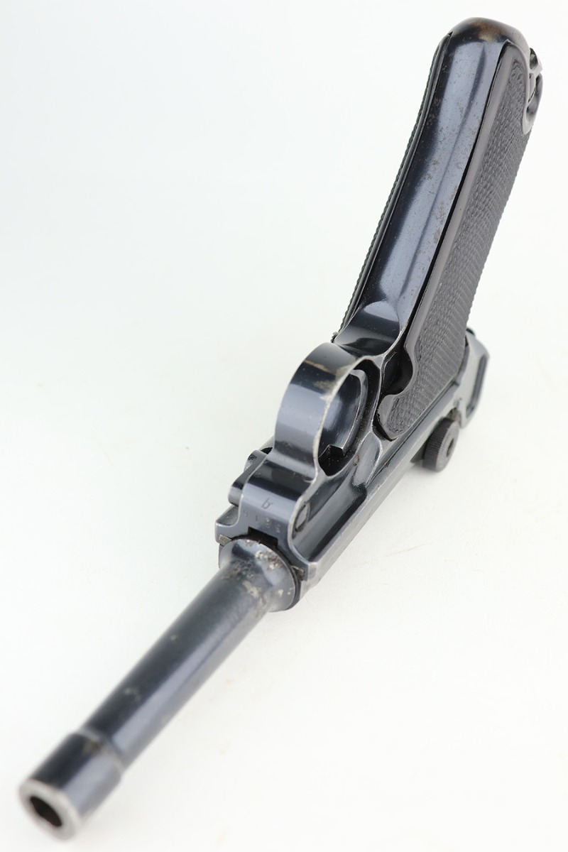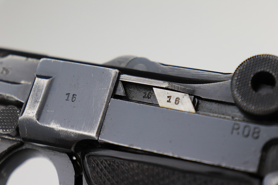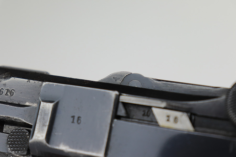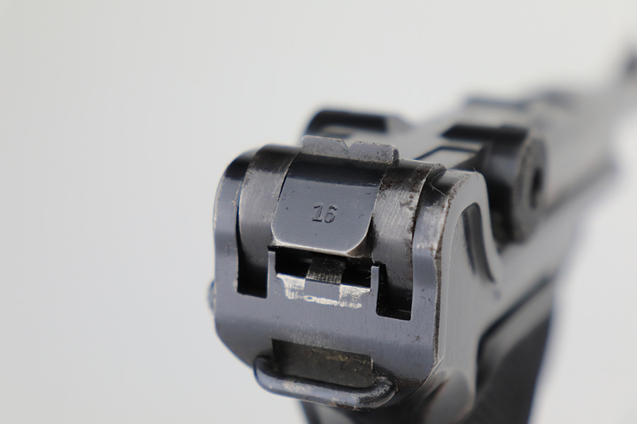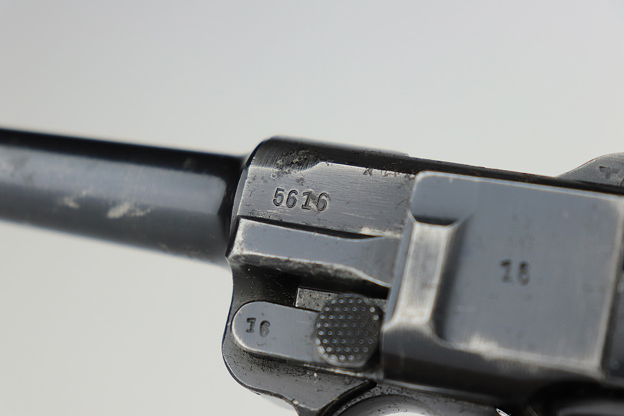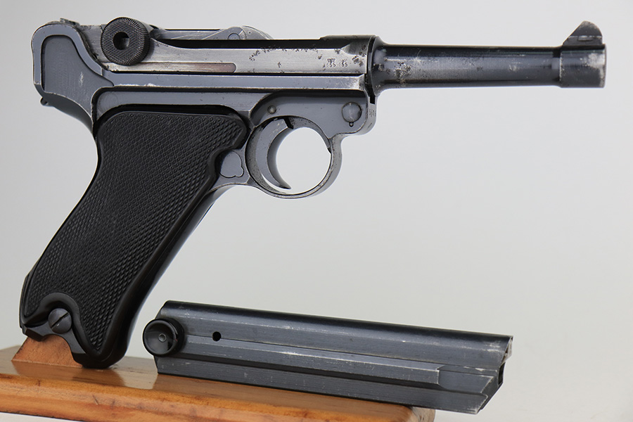3/6/23 – This is a nice example of a BYF 41 “Black Widow” Mauser Luger issued to the Nazi military in 1941. It is all matching, has the proper “Eagle 655” military acceptance proofs. It comes with one period-correct black bakelite “black widow” magazine and it is fitted with a set of high quality reproduction grips. The gun itself has retained about 90-92% of its original bluing. The majority of the bluing loss is on the chamber and on the right side of the slide, but there is also minor wear around the muzzle and on the side plate, and there is spotty wear along the barrel. There is freckling on both grip straps and some spotty oxidation with tiny pitting on the chamber. The bore has strong rifling, but there is light freckling throughout.