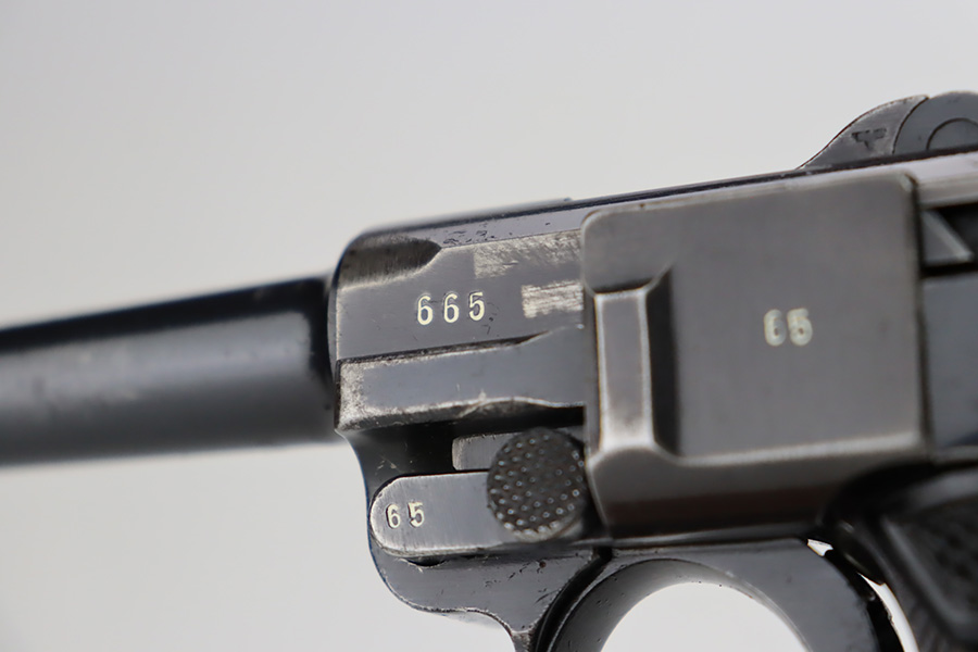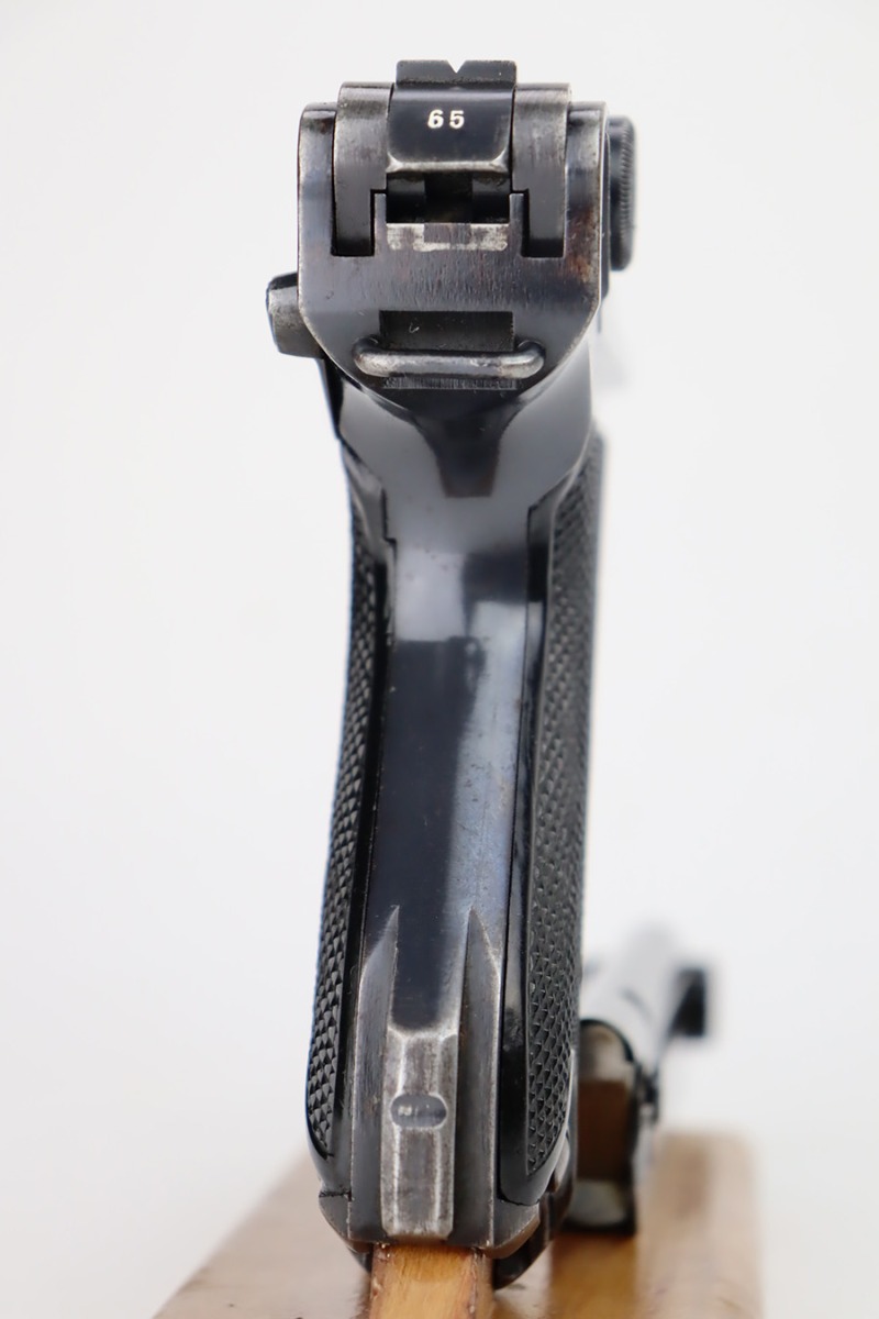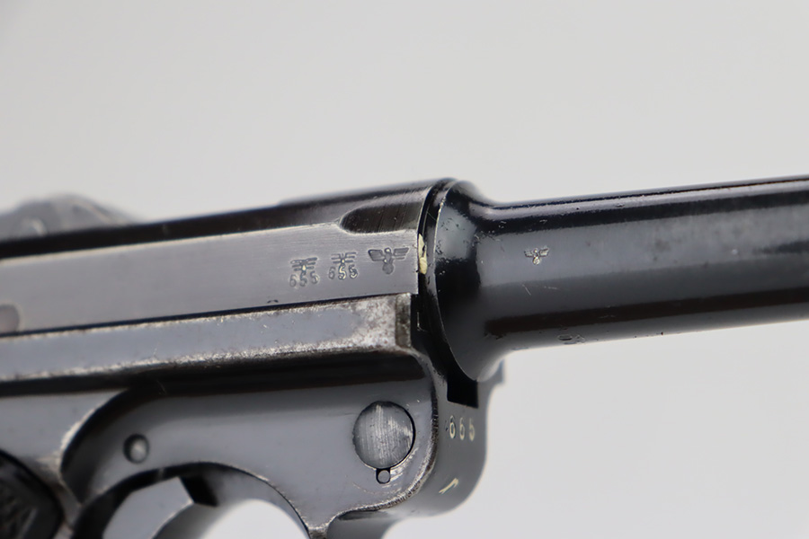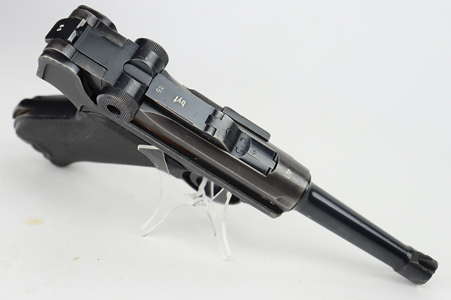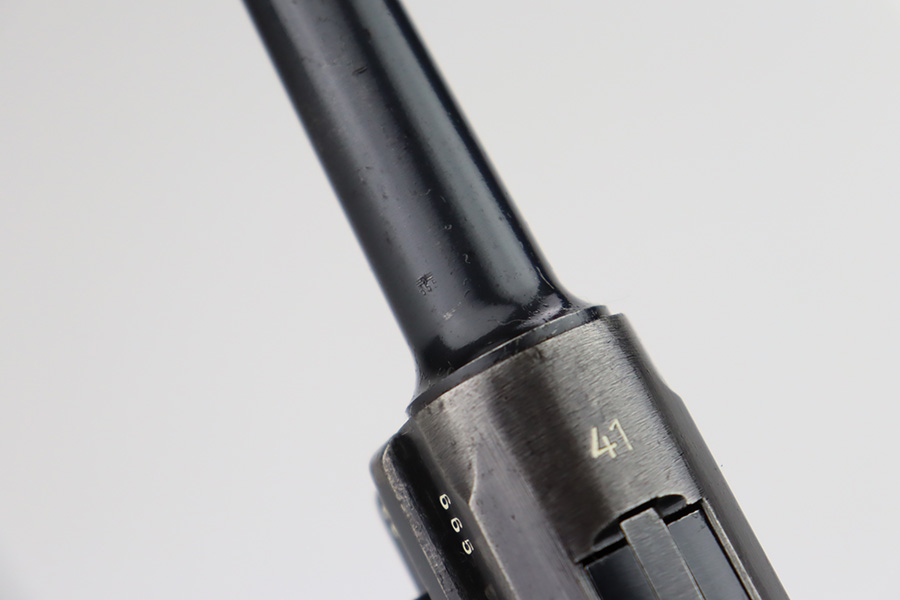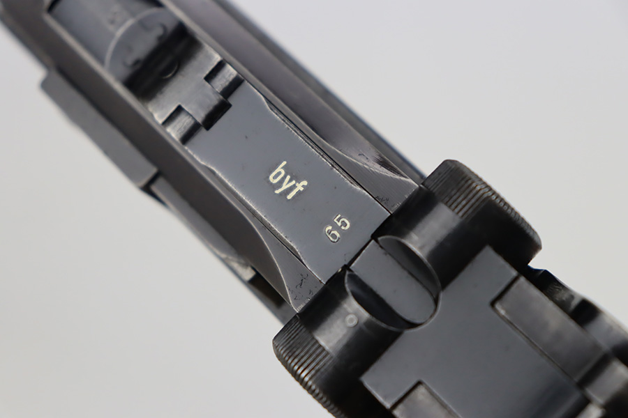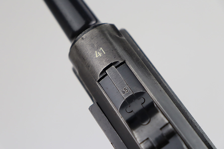 9/26/23 – This is a nice example of a BYF 41 “Black Widow” Mauser Luger issued to the Nazi military in 1941. It is all matching, has the proper “Eagle 135” military acceptance proofs, and fitted with an excellent set of original “Black Widow” bakelite grips. It comes as a rig with two original “Black Widow” magazines, an “Eagle 655” marked tool, and a very nice 1942-dated holster. The gun itself has retained somewhere between 85-90% of its original finish. Wear around the muzzle, on the side plate, and on the high edges. Thinning on the chamber. Some minor pitting on both grip straps. The bore has decent rifling, but there is tiny pitting throughout.
