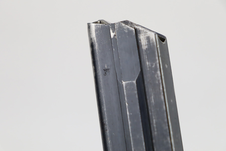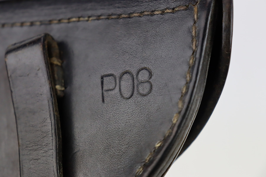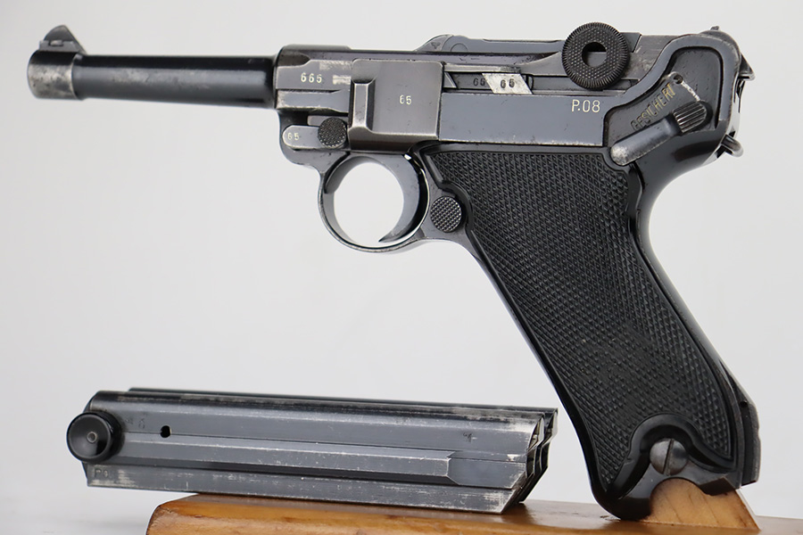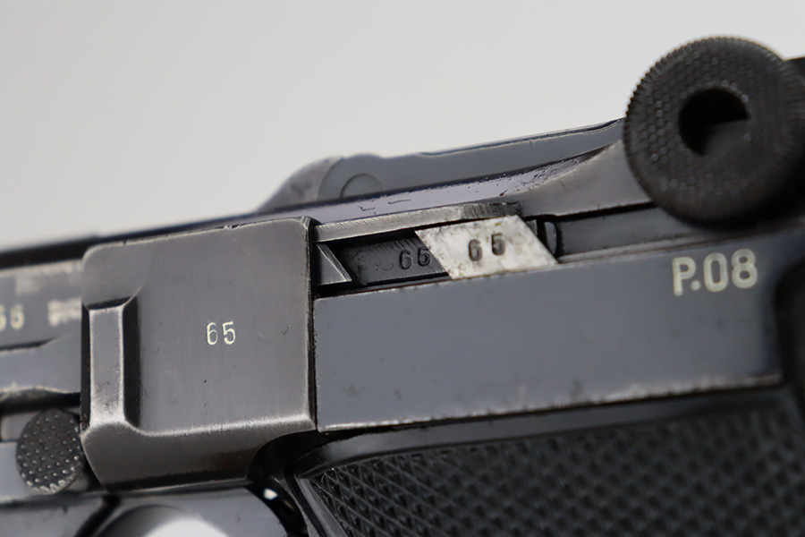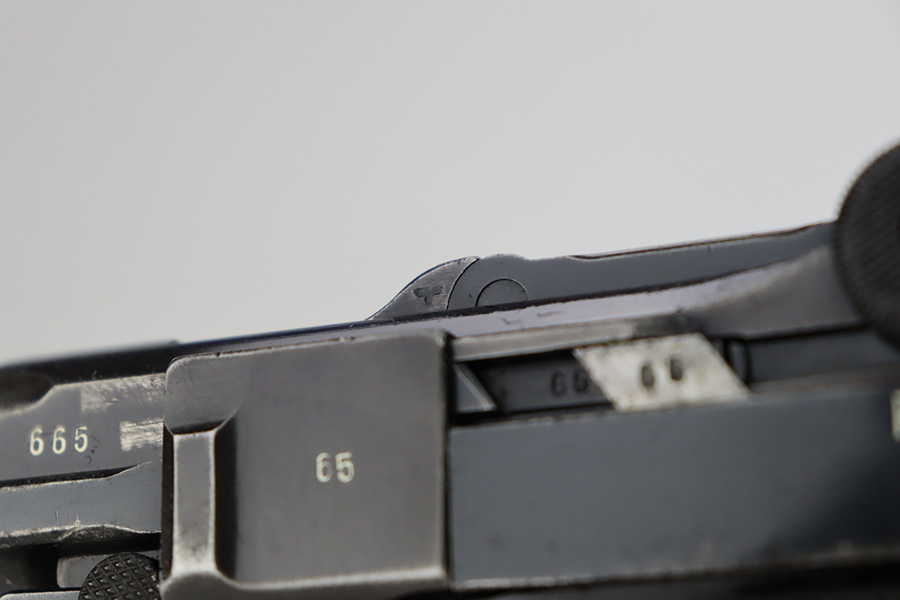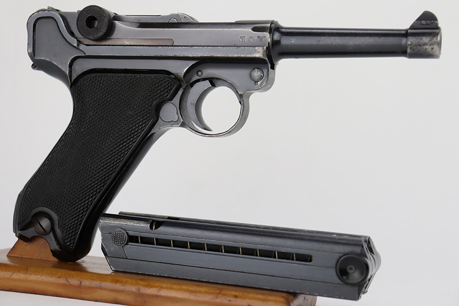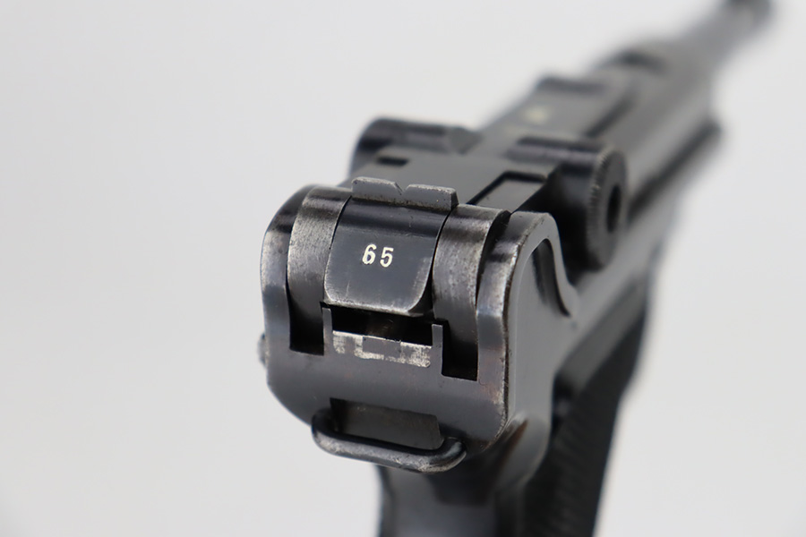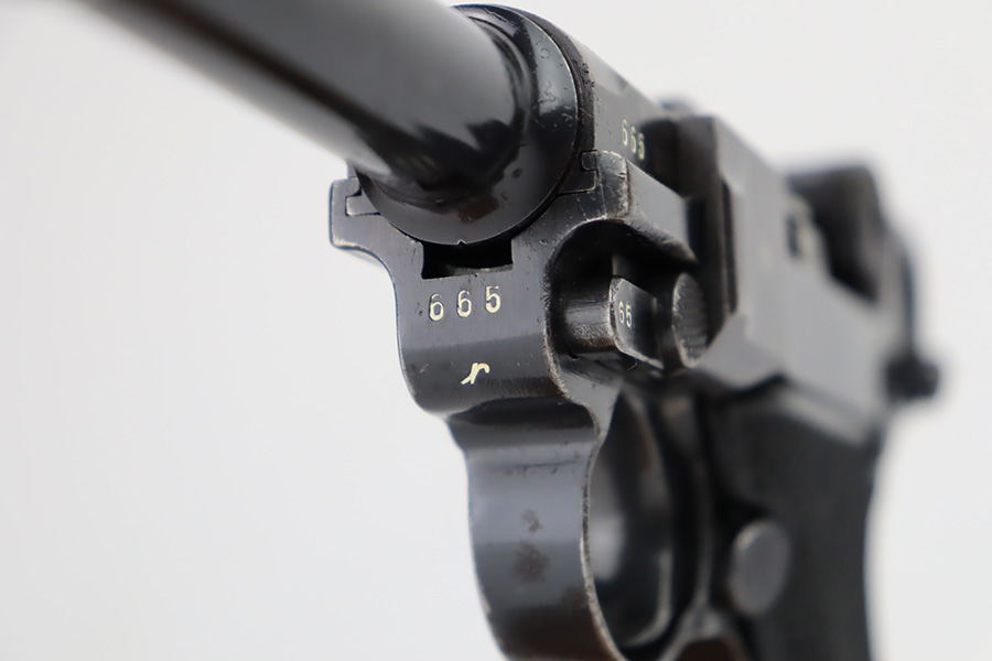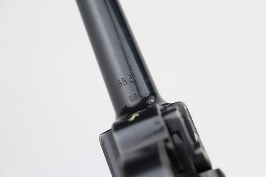 9/26/23 – This is a nice example of a BYF 41 “Black Widow” Mauser Luger issued to the Nazi military in 1941. It is all matching, has the proper “Eagle 135” military acceptance proofs, and fitted with an excellent set of original “Black Widow” bakelite grips. It comes as a rig with two original “Black Widow” magazines, an “Eagle 655” marked tool, and a very nice 1942-dated holster. The gun itself has retained somewhere between 85-90% of its original finish. Wear around the muzzle, on the side plate, and on the high edges. Thinning on the chamber. Some minor pitting on both grip straps. The bore has decent rifling, but there is tiny pitting throughout.
