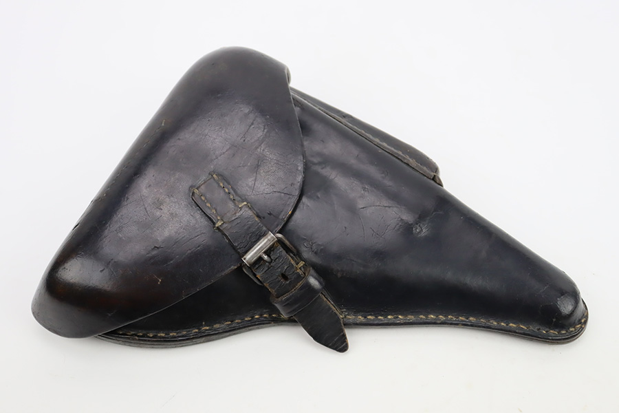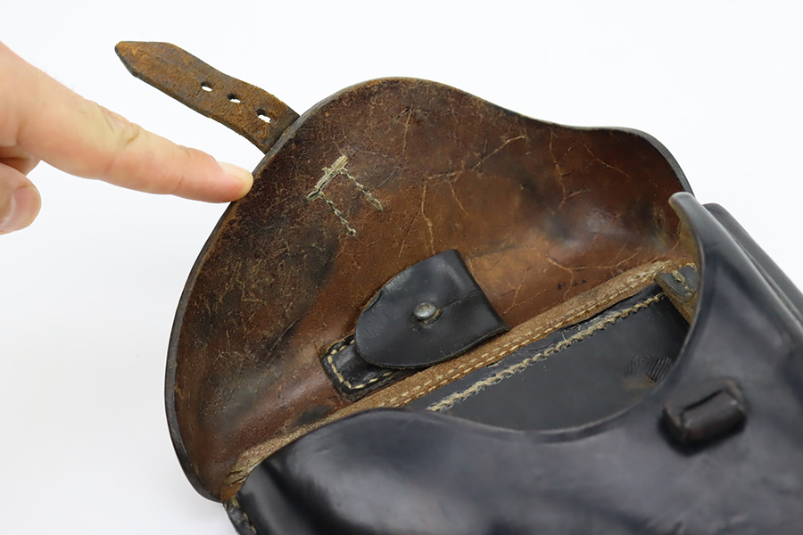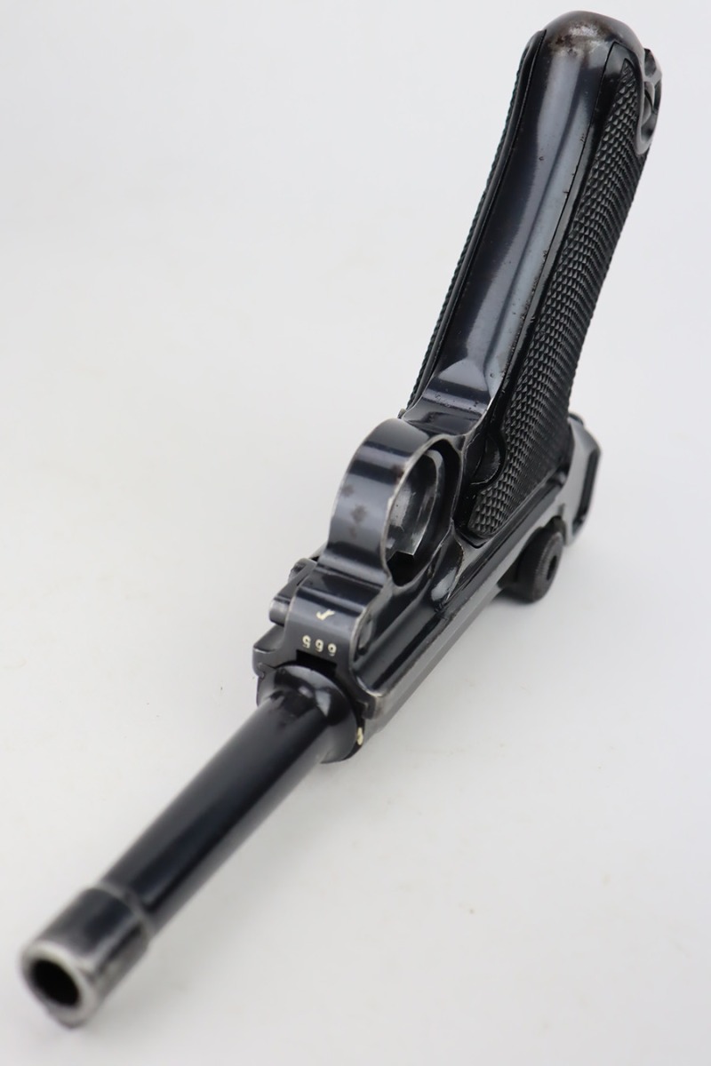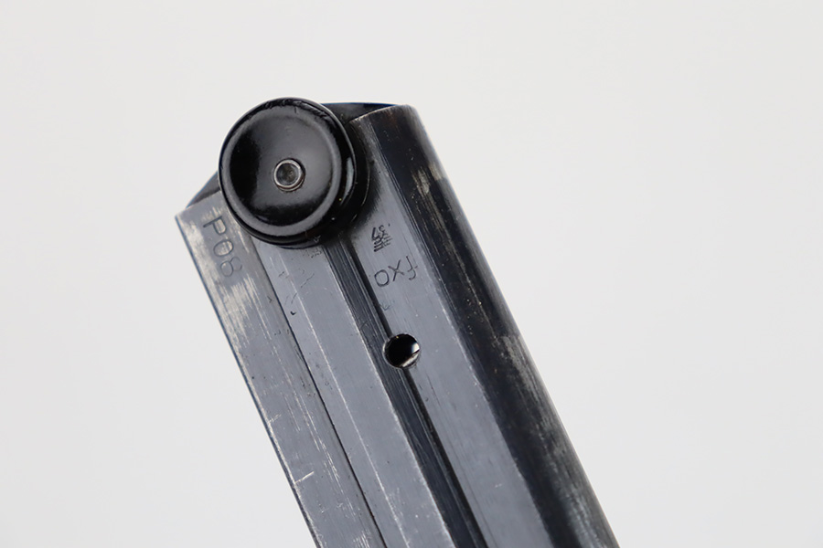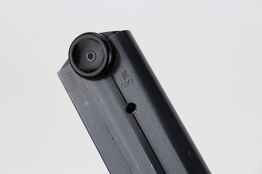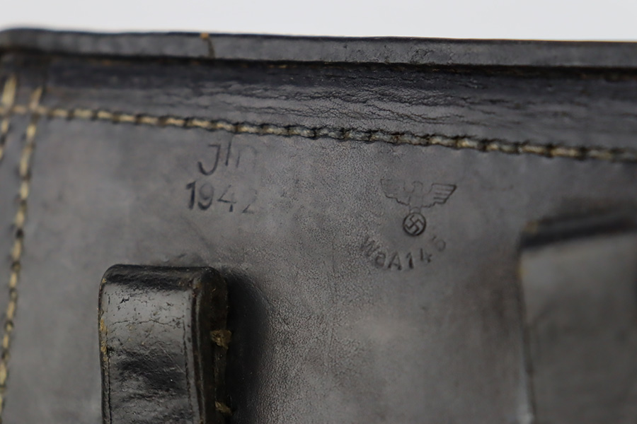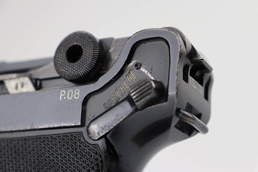 9/26/23 – This is a nice example of a BYF 41 “Black Widow” Mauser Luger issued to the Nazi military in 1941. It is all matching, has the proper “Eagle 135” military acceptance proofs, and fitted with an excellent set of original “Black Widow” bakelite grips. It comes as a rig with two original “Black Widow” magazines, an “Eagle 655” marked tool, and a very nice 1942-dated holster. The gun itself has retained somewhere between 85-90% of its original finish. Wear around the muzzle, on the side plate, and on the high edges. Thinning on the chamber. Some minor pitting on both grip straps. The bore has decent rifling, but there is tiny pitting throughout.