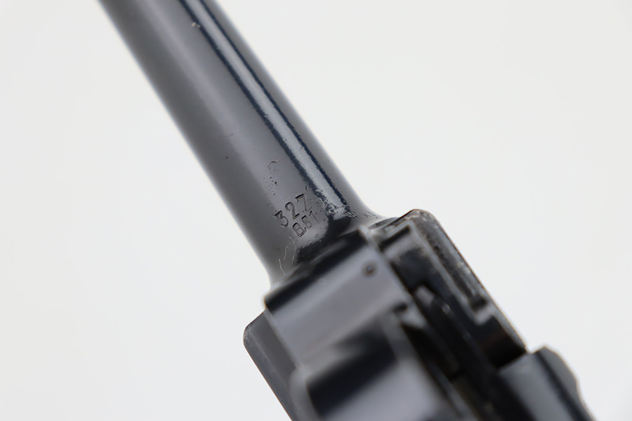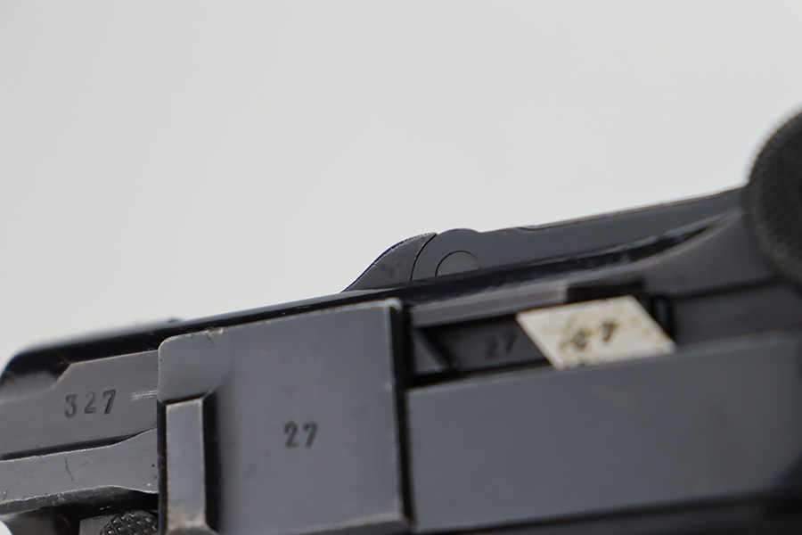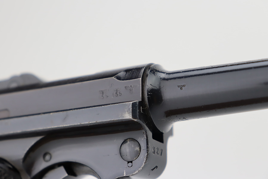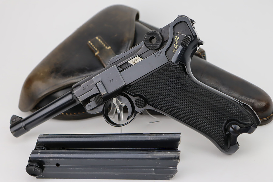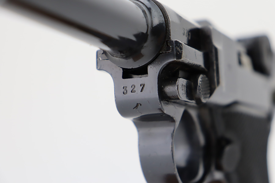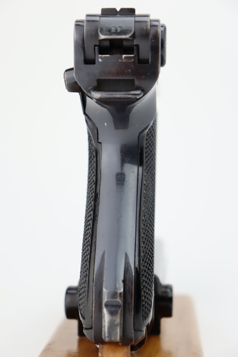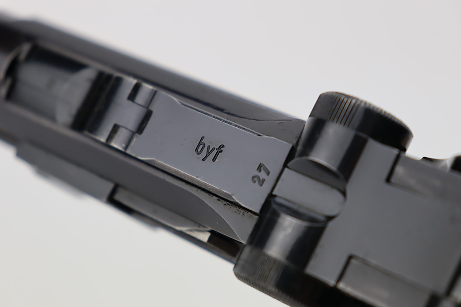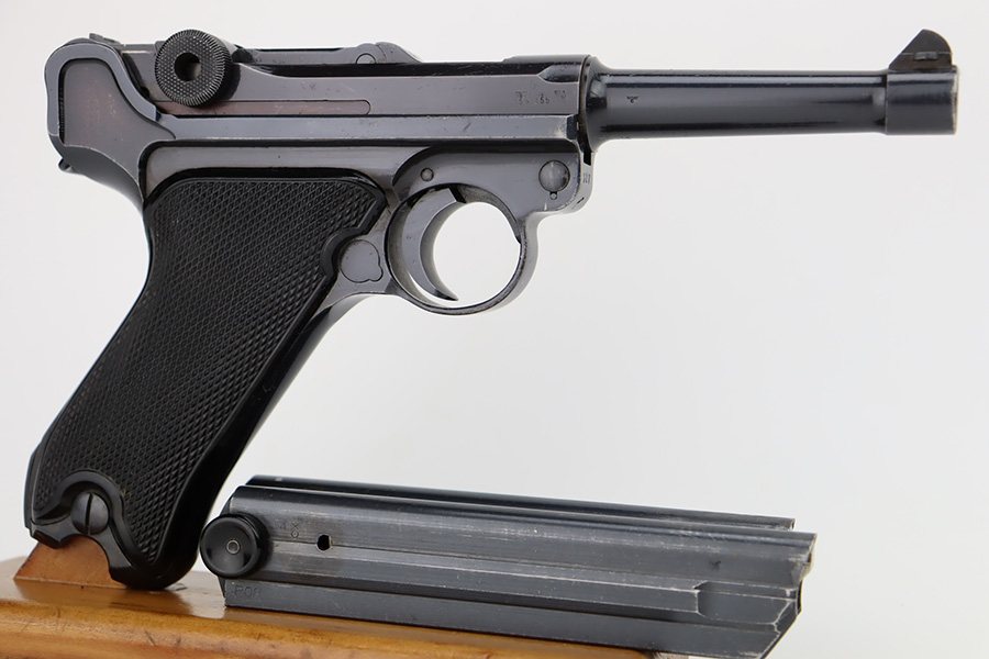 10/12/23 – This is a minty example of a BYF 41 “Black Widow” Mauser Luger issued to the Nazi military in 1941. It is all matching, has the proper “Eagle 135” military acceptance proofs, and fitted with an excellent set of original “Black Widow” bakelite grips. It comes as a rig with two original “Black Widow” magazines, and a very nice 1941-dated holster. The gun itself has retained about 97% of its original finish. There is just very minor high edge wear. Mint bore.