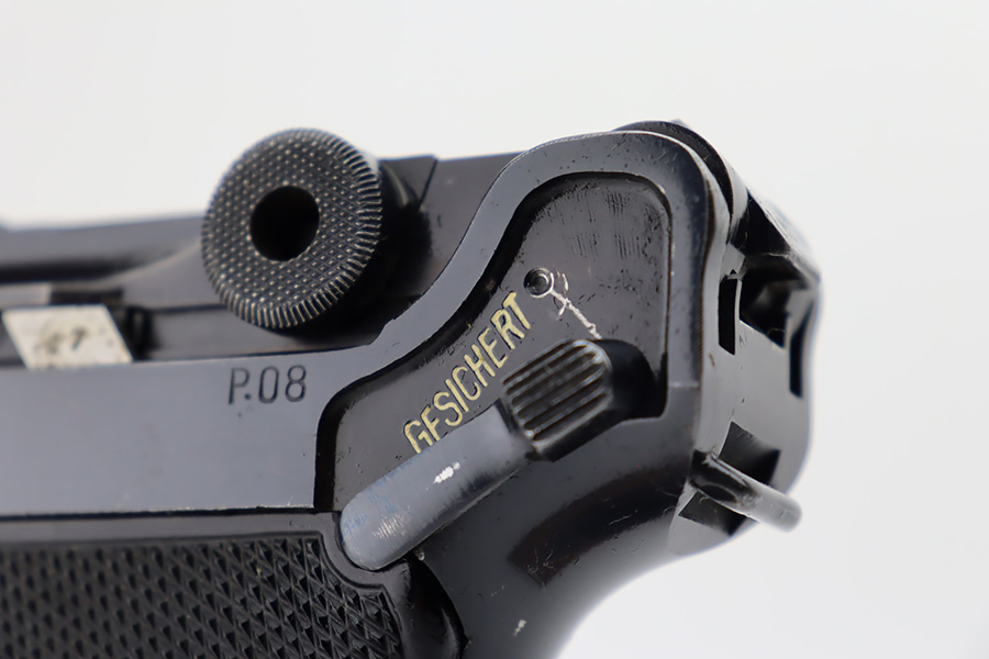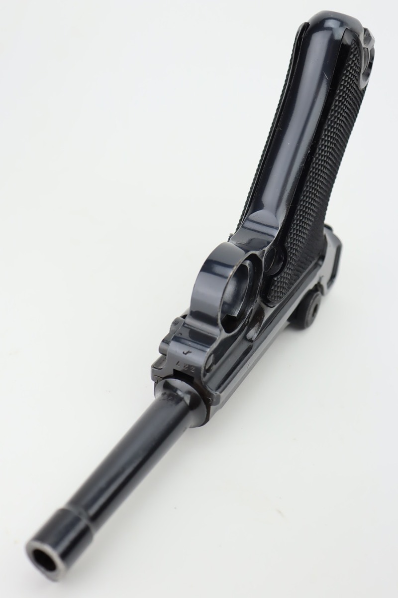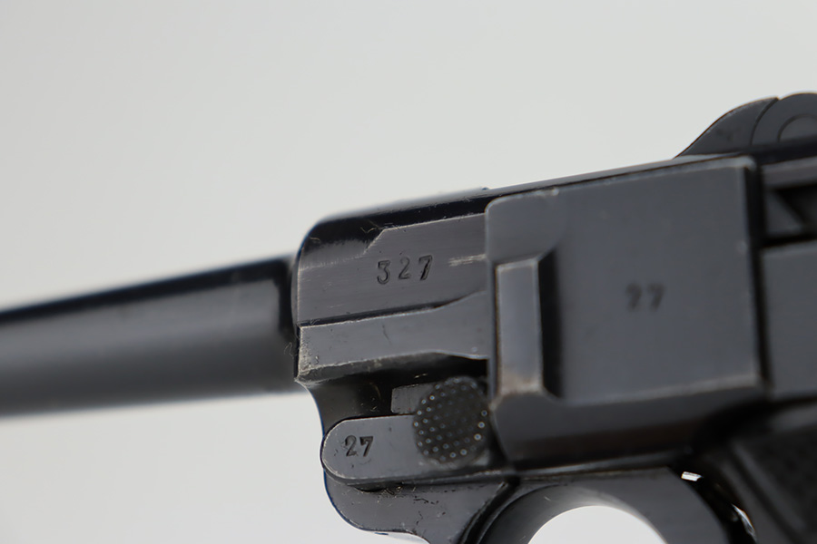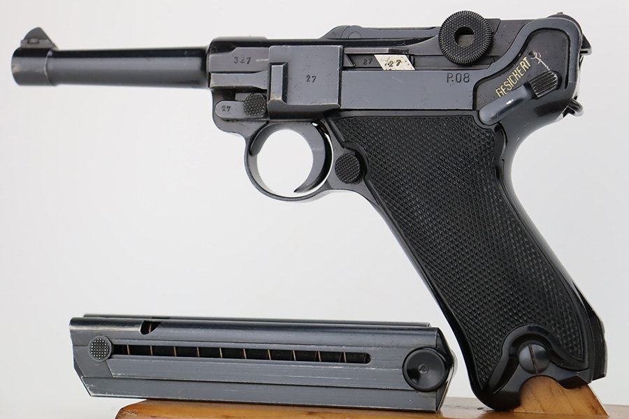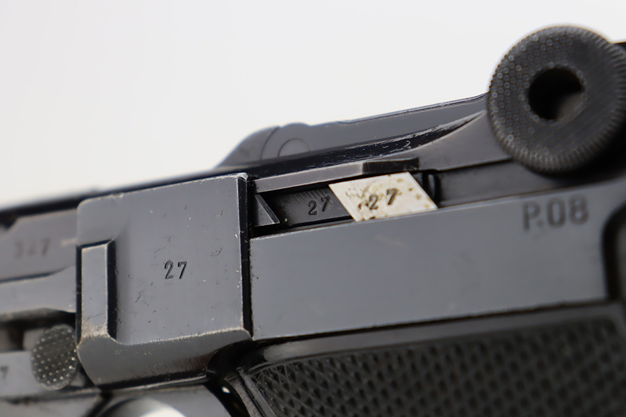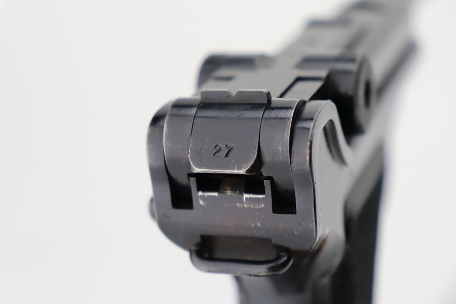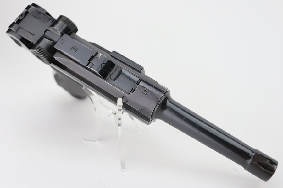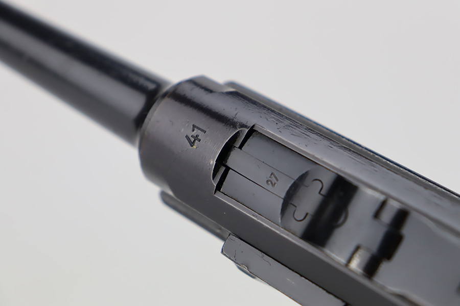 10/12/23 – This is a minty example of a BYF 41 “Black Widow” Mauser Luger issued to the Nazi military in 1941. It is all matching, has the proper “Eagle 135” military acceptance proofs, and fitted with an excellent set of original “Black Widow” bakelite grips. It comes as a rig with two original “Black Widow” magazines, and a very nice 1941-dated holster. The gun itself has retained about 97% of its original finish. There is just very minor high edge wear. Mint bore.