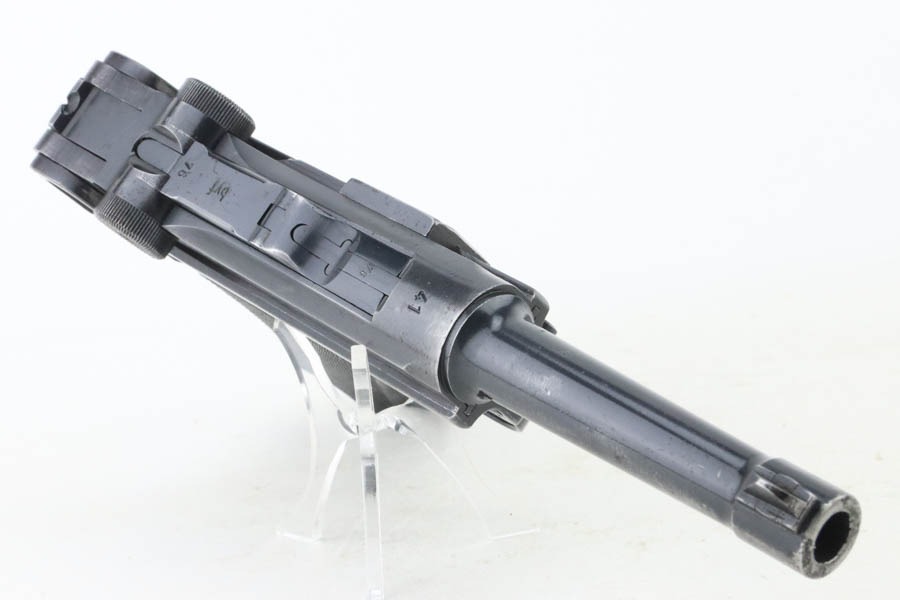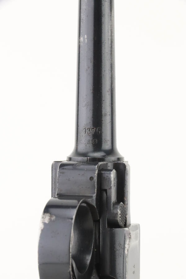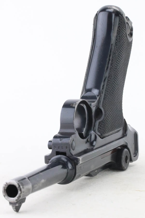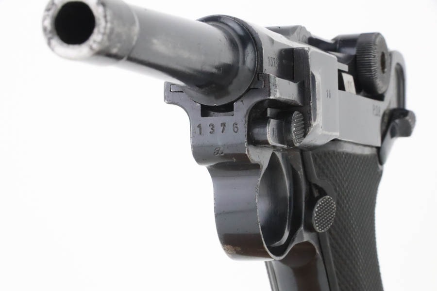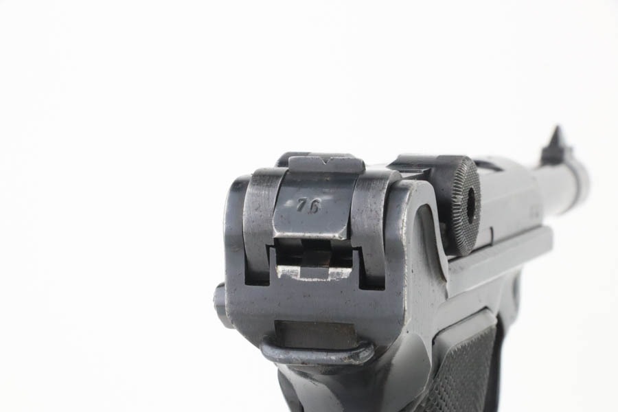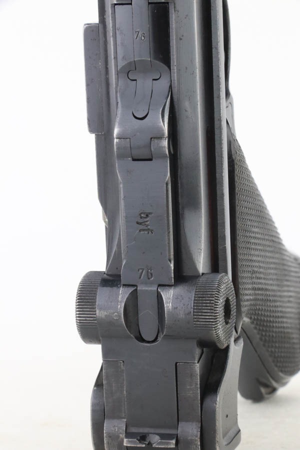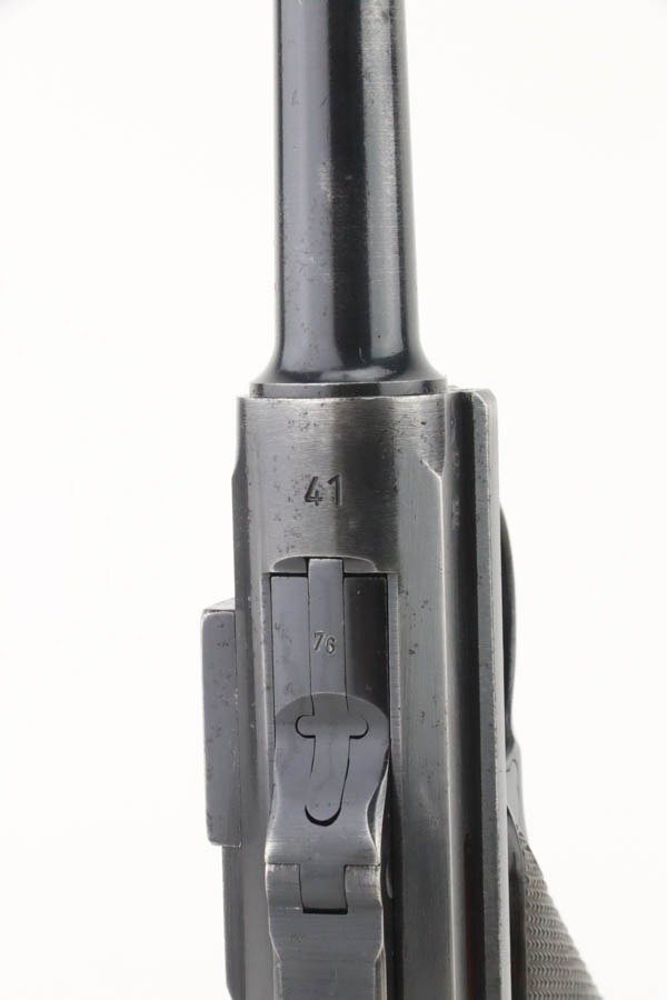 10/30/24 – This is a nice example of a BYF 41 “Black Widow” Mauser Luger issued to the German military in 1941. It is all matching, has the proper “Eagle 655” military acceptance proofs, and fitted with an excellent set of original “Black Widow” bakelite grips. It comes as a rig with a 1942-dated holster, a rare “Eagle 135” Luger tool, and a mismatched “Eagle 83” magazine. The finish on the gun rates about 91-92%. The majority of the wear is along the barrel, but there is minor wear on the side plate and on the high edges as well. Pin-pricking around the muzzle. Very light freckling on the grip straps. The bore has good rifling, but there is noticeable freckling throughout.