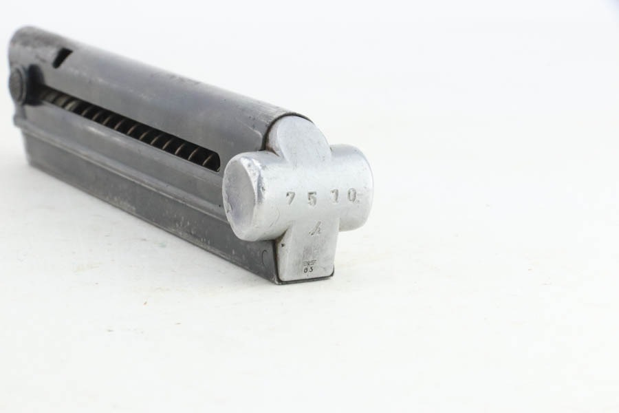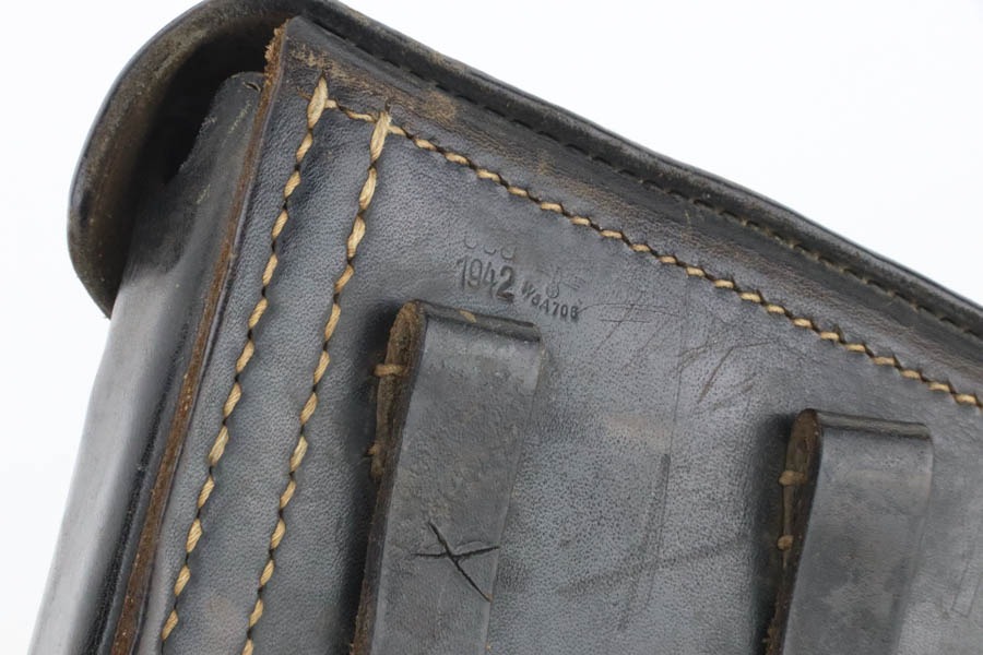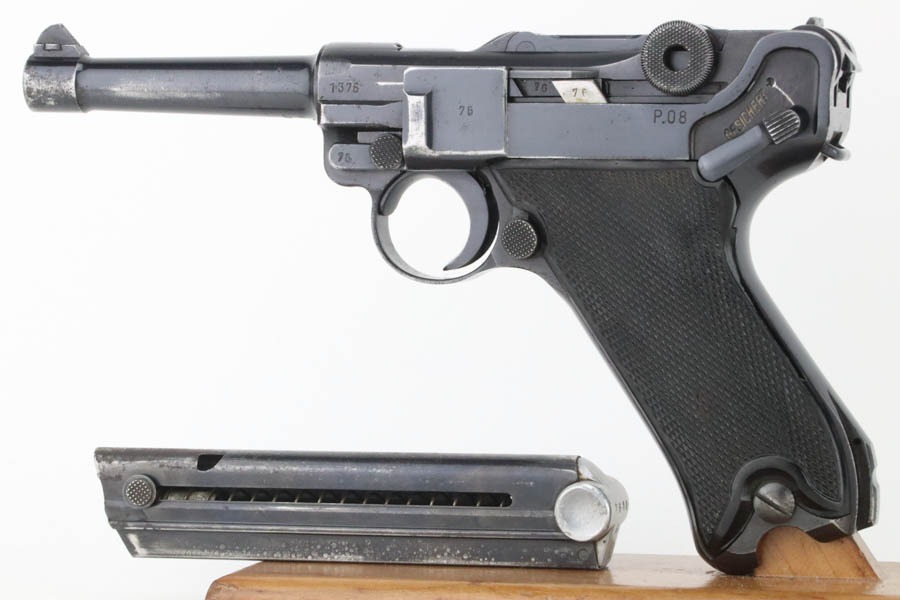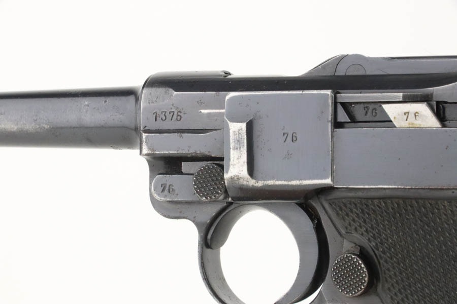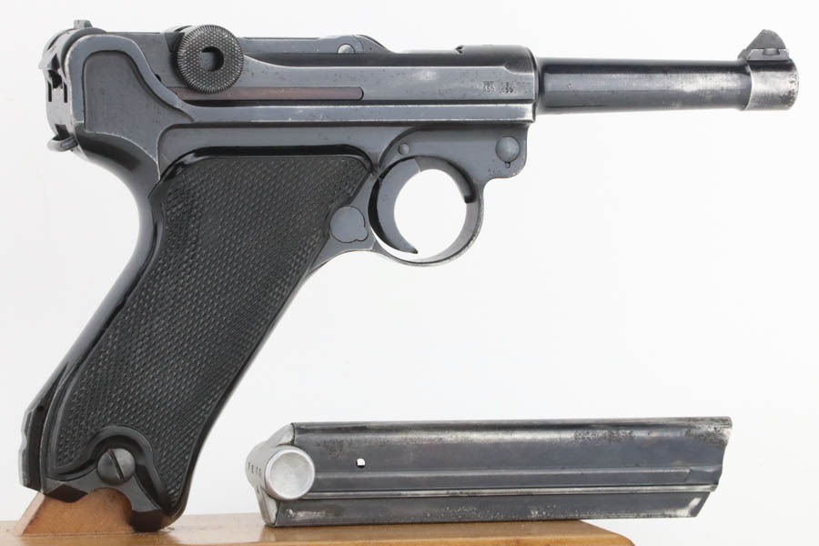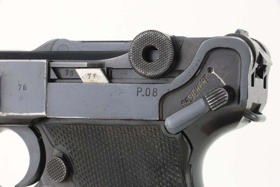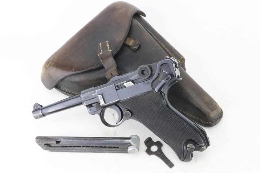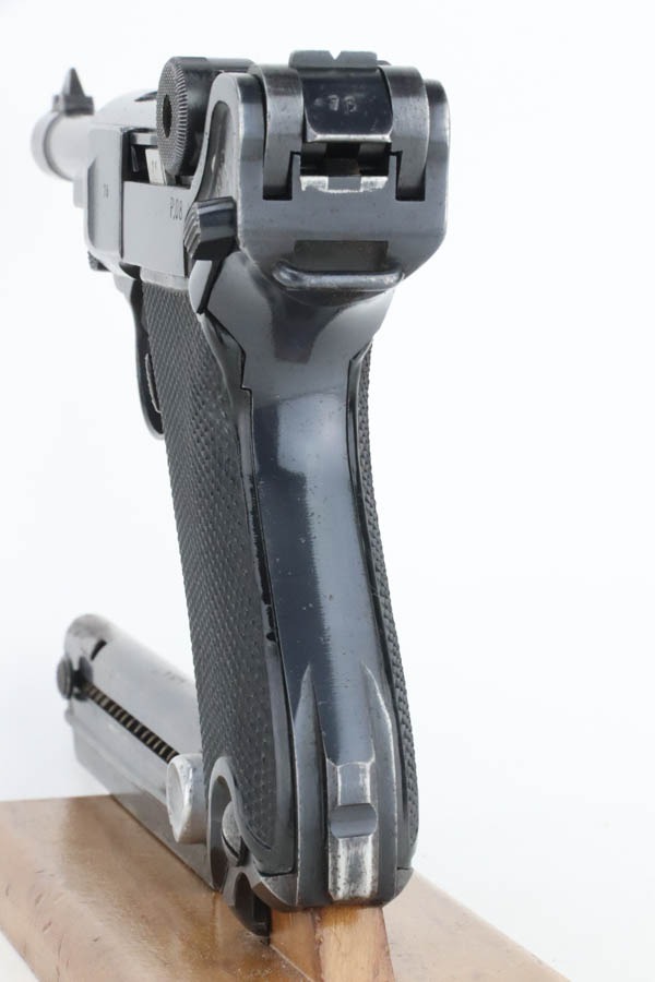 10/30/24 – This is a nice example of a BYF 41 “Black Widow” Mauser Luger issued to the German military in 1941. It is all matching, has the proper “Eagle 655” military acceptance proofs, and fitted with an excellent set of original “Black Widow” bakelite grips. It comes as a rig with a 1942-dated holster, a rare “Eagle 135” Luger tool, and a mismatched “Eagle 83” magazine. The finish on the gun rates about 91-92%. The majority of the wear is along the barrel, but there is minor wear on the side plate and on the high edges as well. Pin-pricking around the muzzle. Very light freckling on the grip straps. The bore has good rifling, but there is noticeable freckling throughout.