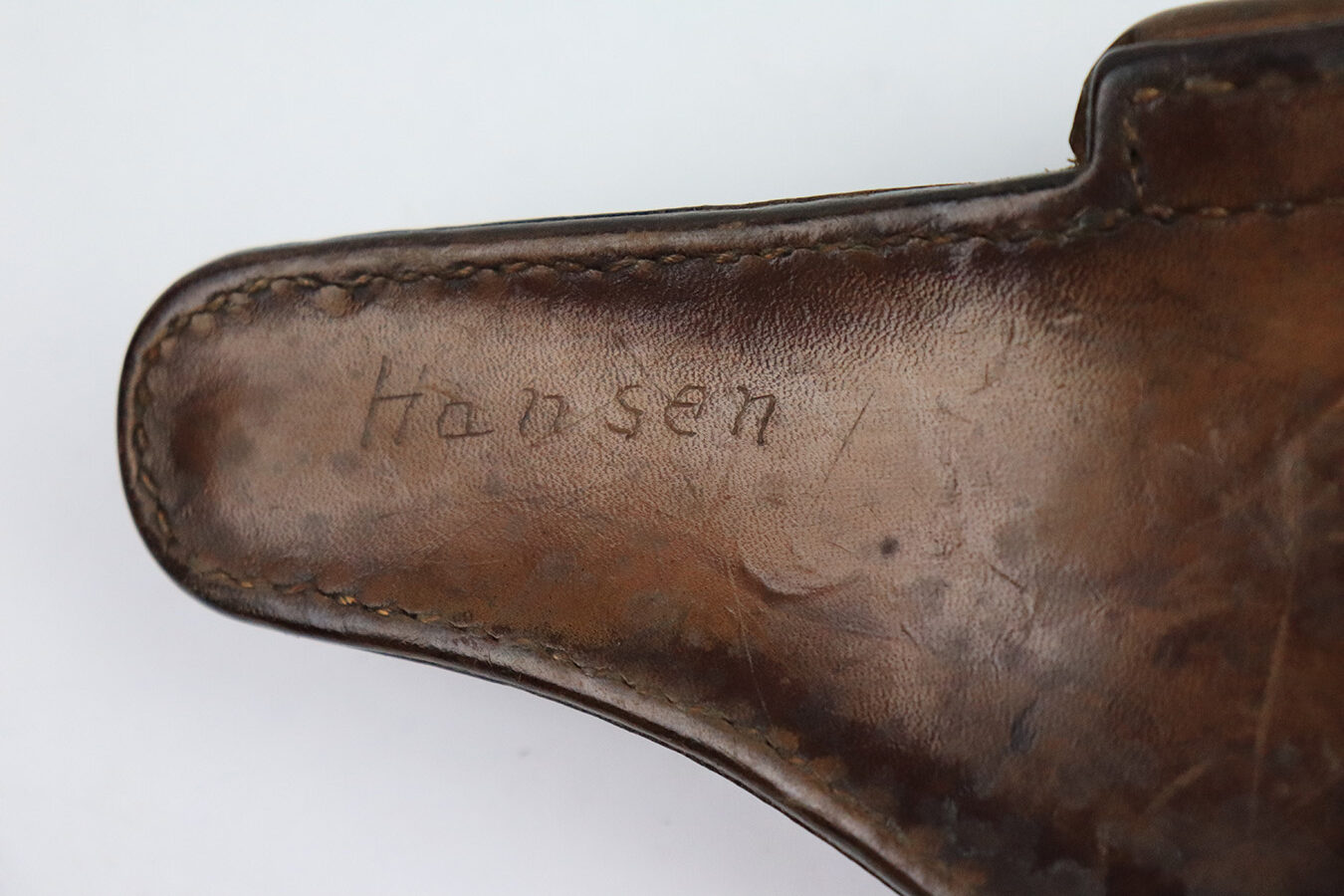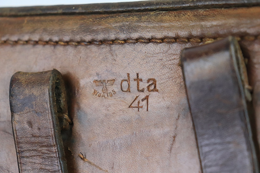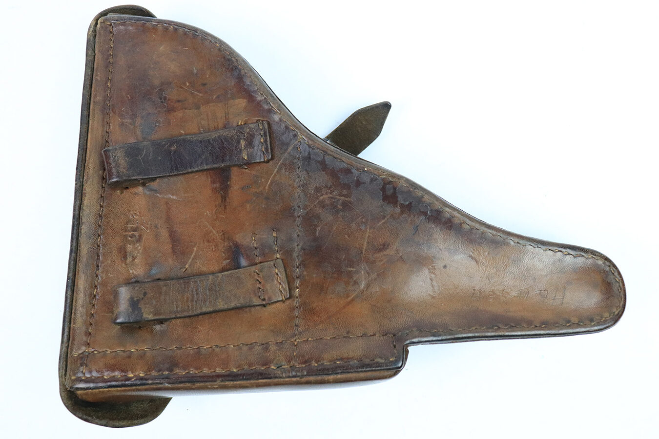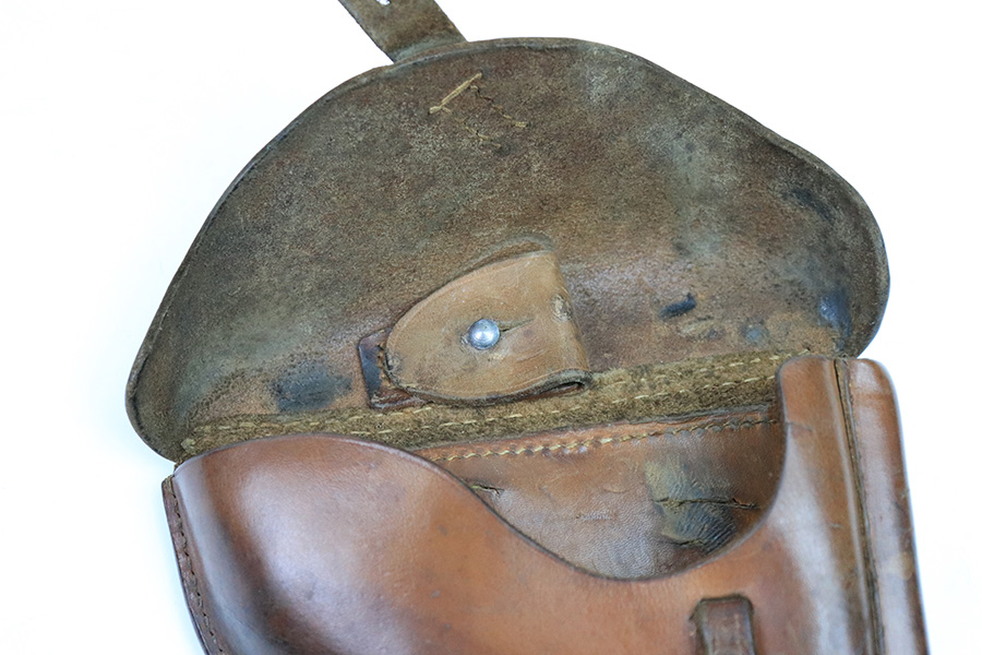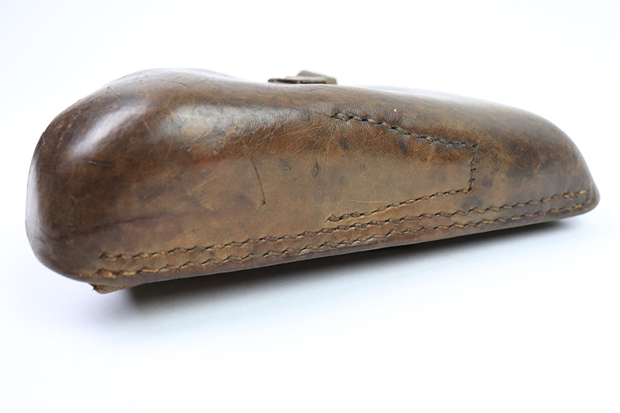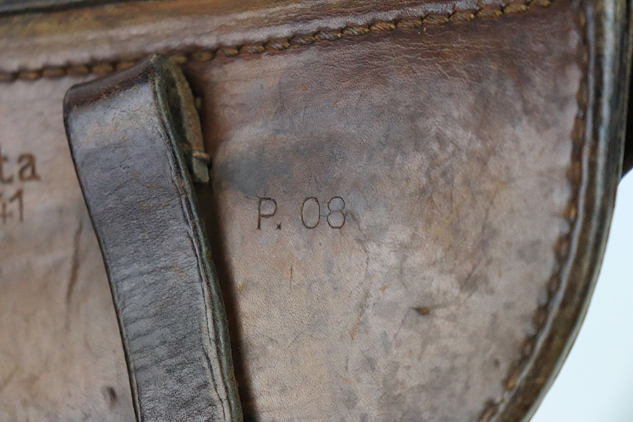 12/7/22 – This is an original 1941 dated Luger holster with brown leather. The leather was most likely black when it left the factory, but the only black dye that remains is traces found on the lid of the holster. Nice natural aging throughout the leather without having any excess damage or notable flaws. The leather has normal pliability and a name lightly scratched into the toe on the back side. The back leather is dated, maker stamped, waffen proofed, and P.08 stamped with crisp markings. The interior leather shows typical use. No stitching issues, and all original stitching.