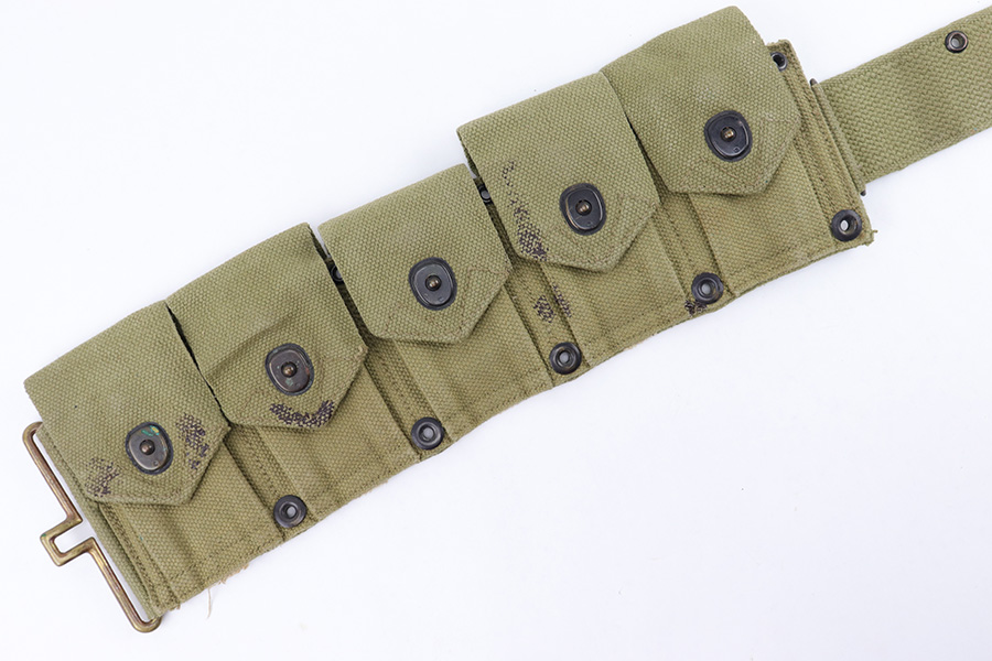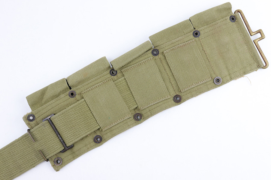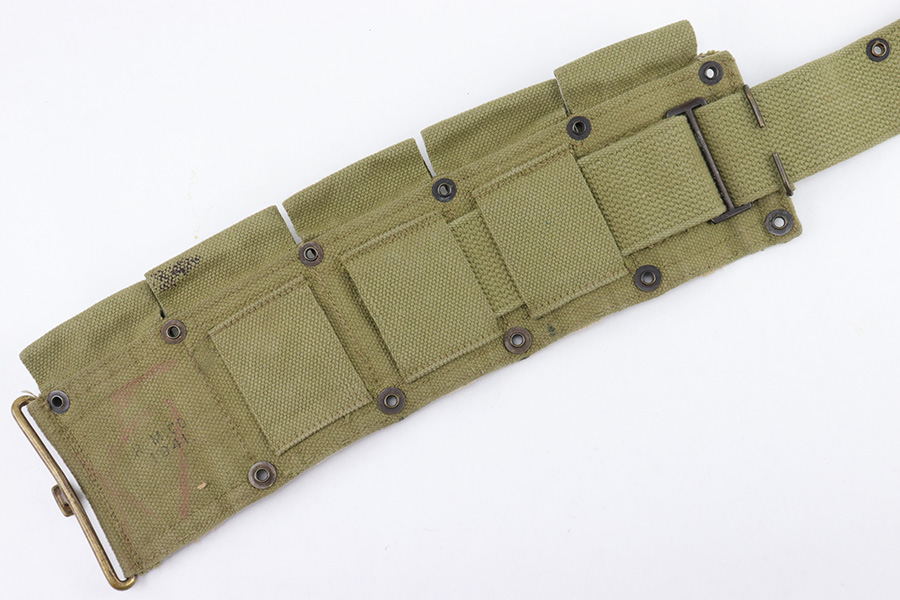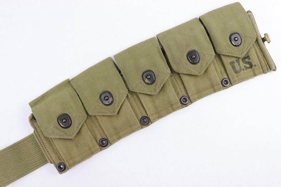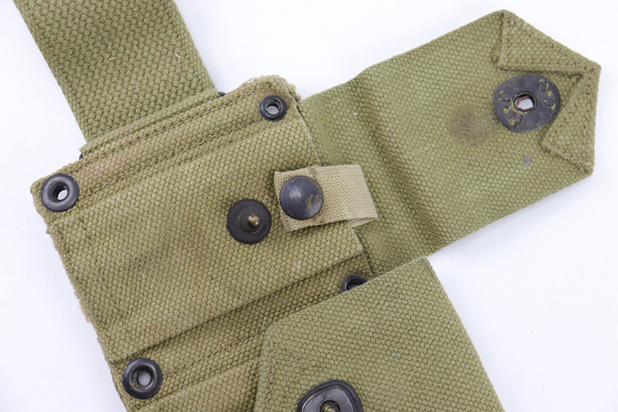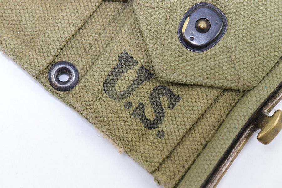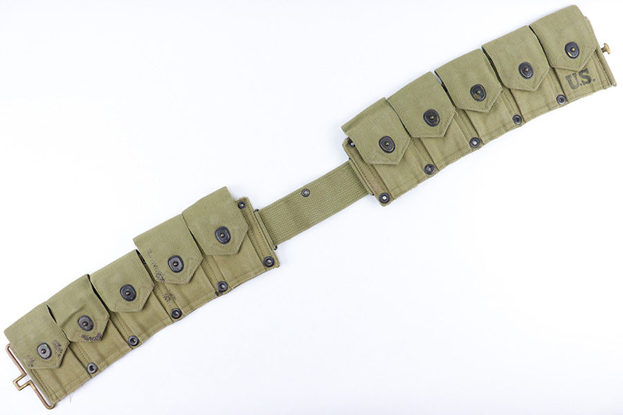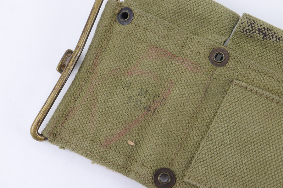 7/18/23 – This is an original 1941 dated canvas cartridge belt. US military issued during WW2, and ink stamped on the back side as shown. There’s some mild residue staining the canvas in a few small areas. Otherwise excellent condition.