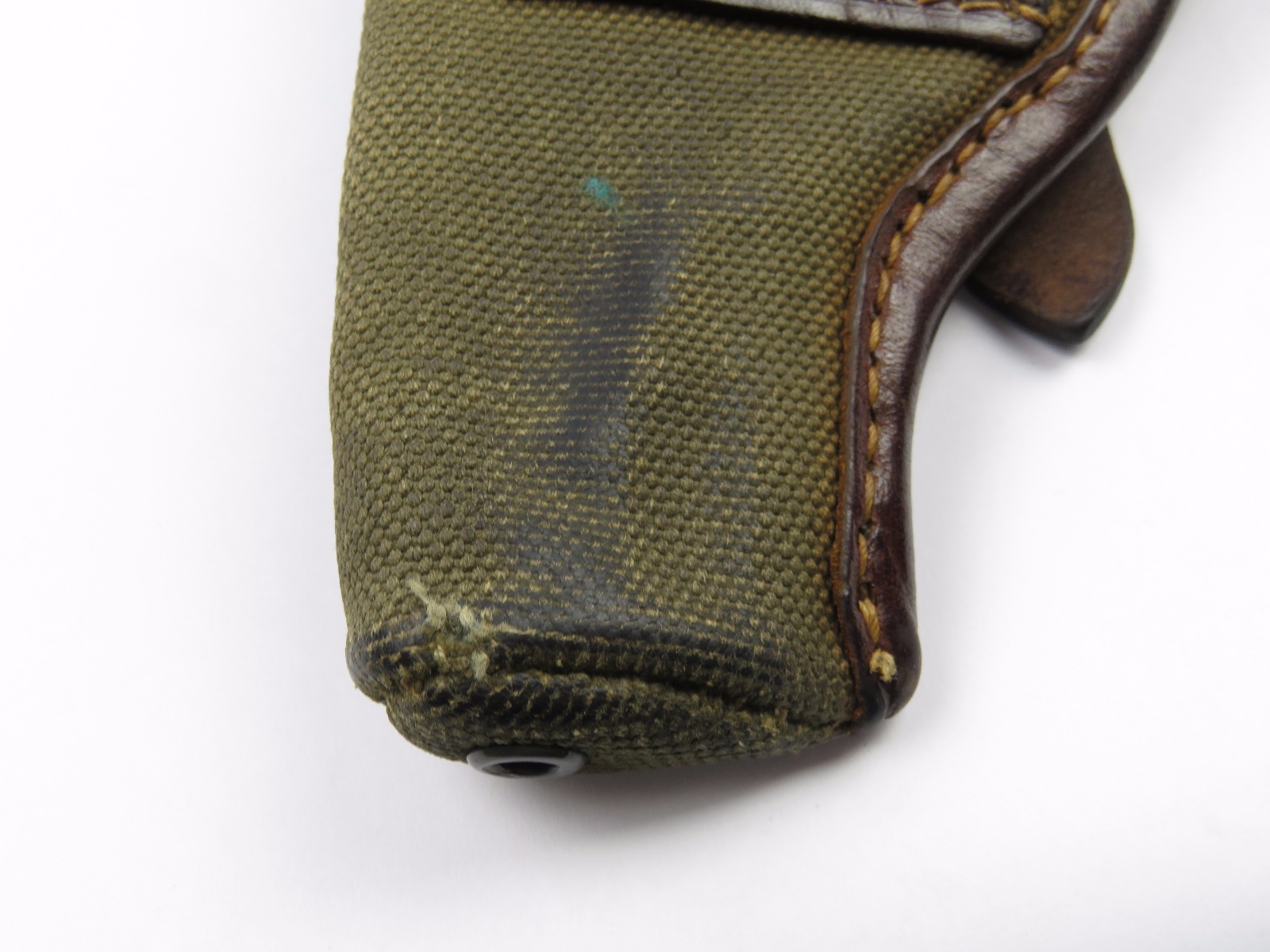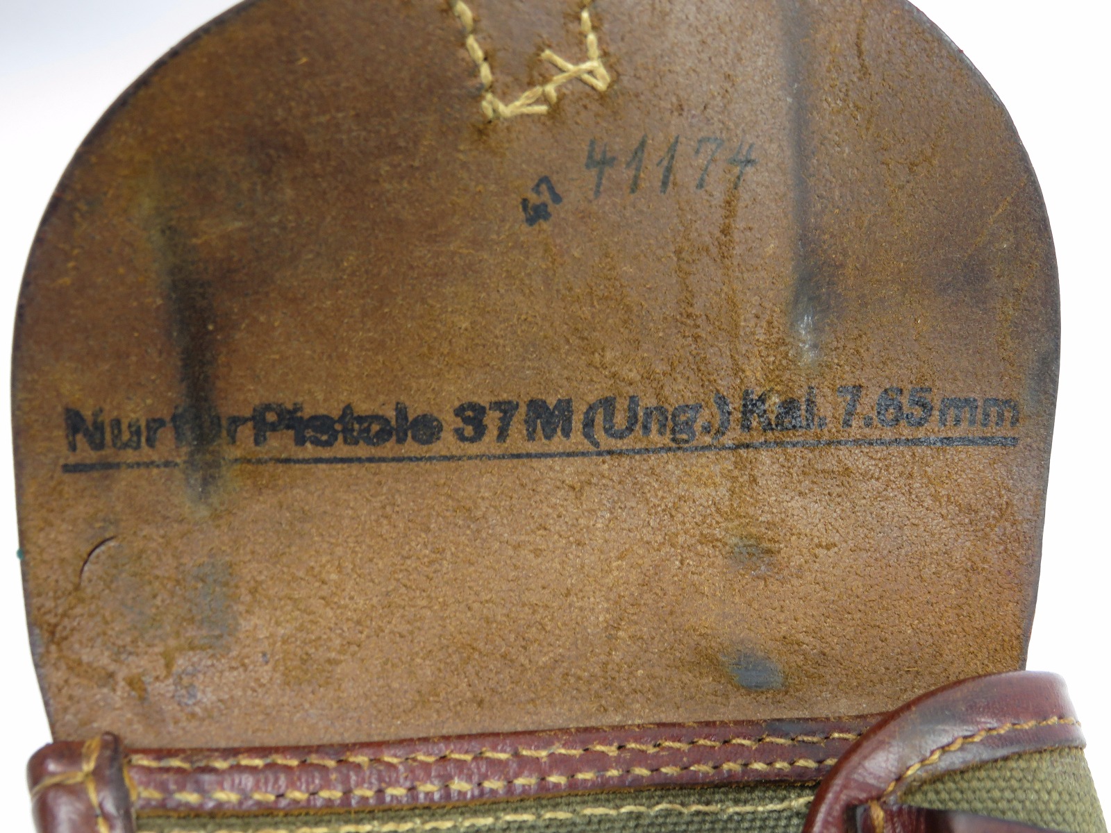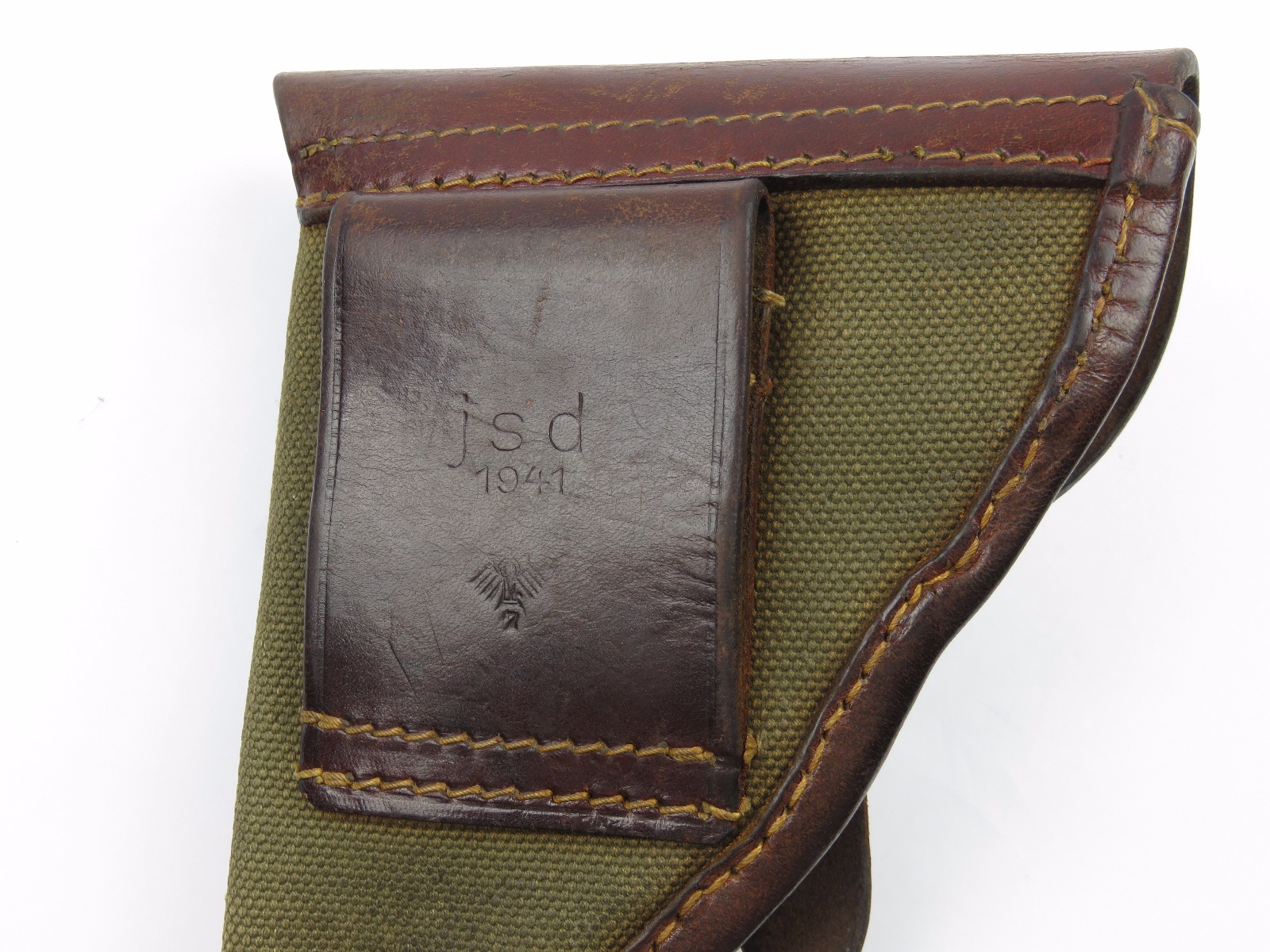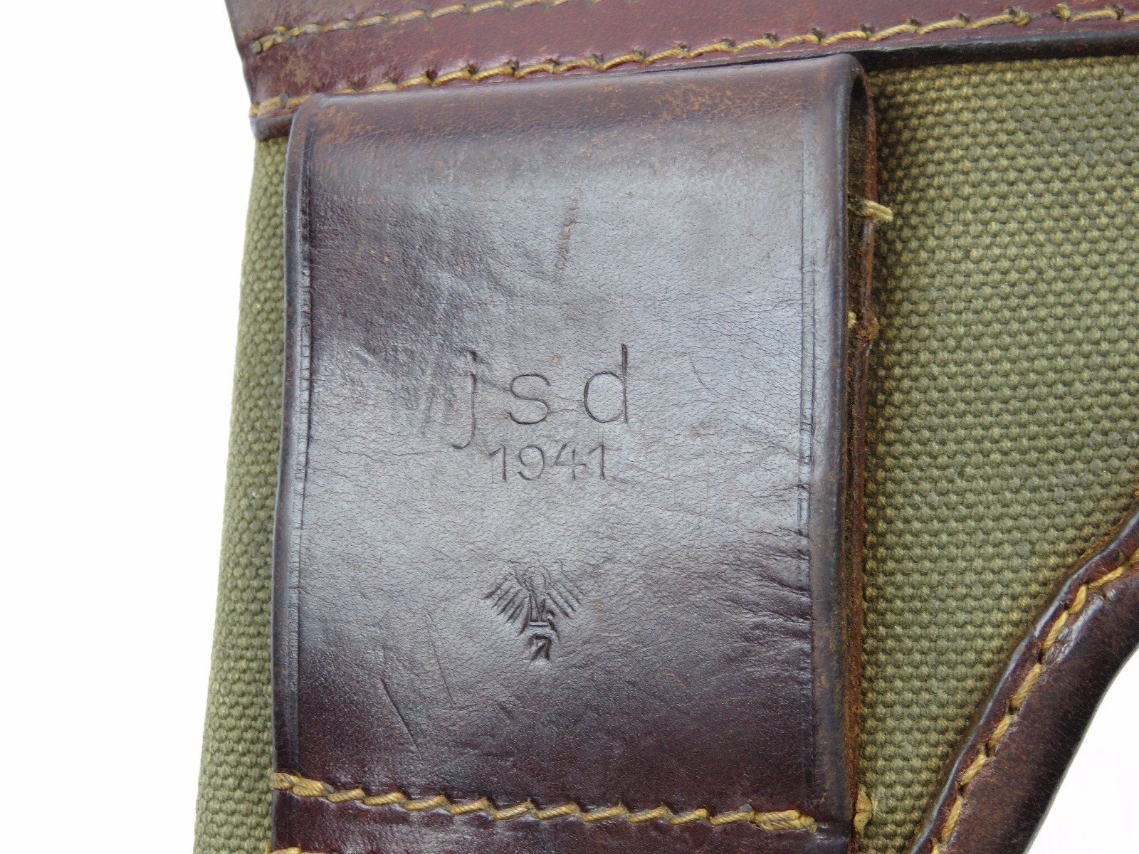 11/3/17 – This is a desirable canvas femaru M37 holster. The holster has a canvas body with leather accents and a leather lid. The back of the holster is stamped “jsd 1941” with a droop winged luftwaffe eagle/2 proof stamp. The interior leather has a nice ink stamp that indicates this holster is for the M37 pistol. The canvas has some light surface wear on the backside, but overall is excellent. The leather has very light wrinkling but no major issues. Excellent stitching overall a very nice, desriable WW2 holster.