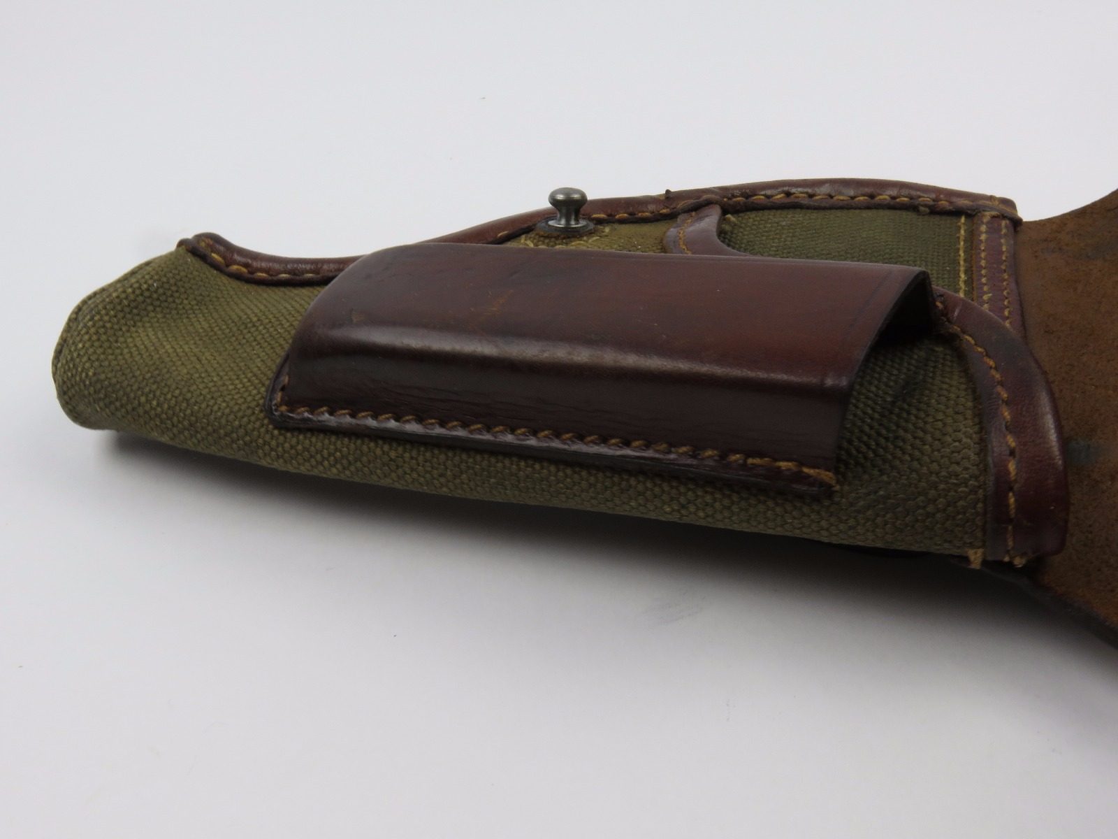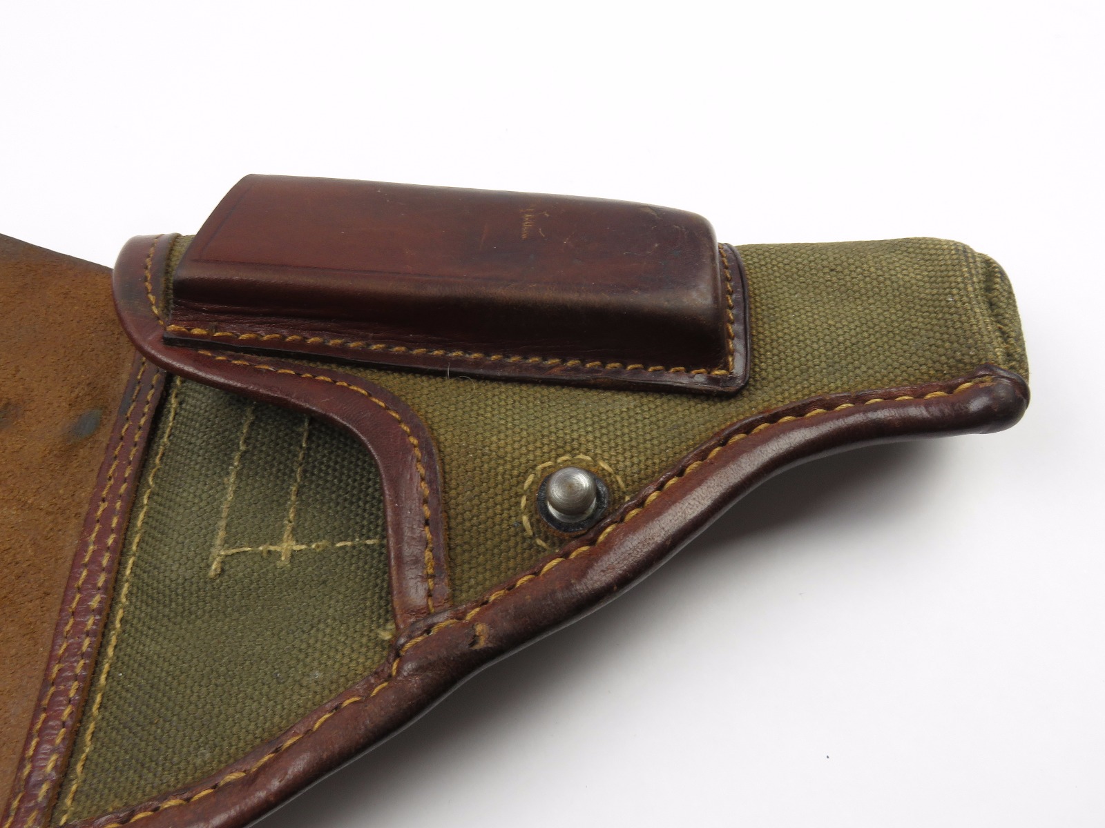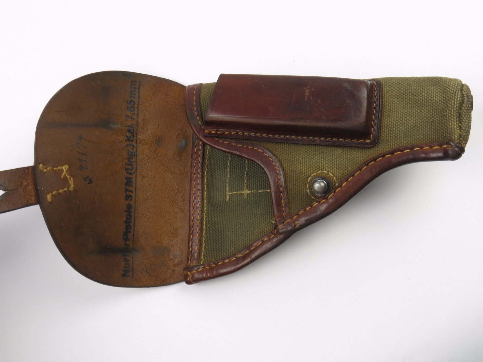 11/3/17 – This is a desirable canvas femaru M37 holster. The holster has a canvas body with leather accents and a leather lid. The back of the holster is stamped “jsd 1941” with a droop winged luftwaffe eagle/2 proof stamp. The interior leather has a nice ink stamp that indicates this holster is for the M37 pistol. The canvas has some light surface wear on the backside, but overall is excellent. The leather has very light wrinkling but no major issues. Excellent stitching overall a very nice, desriable WW2 holster.