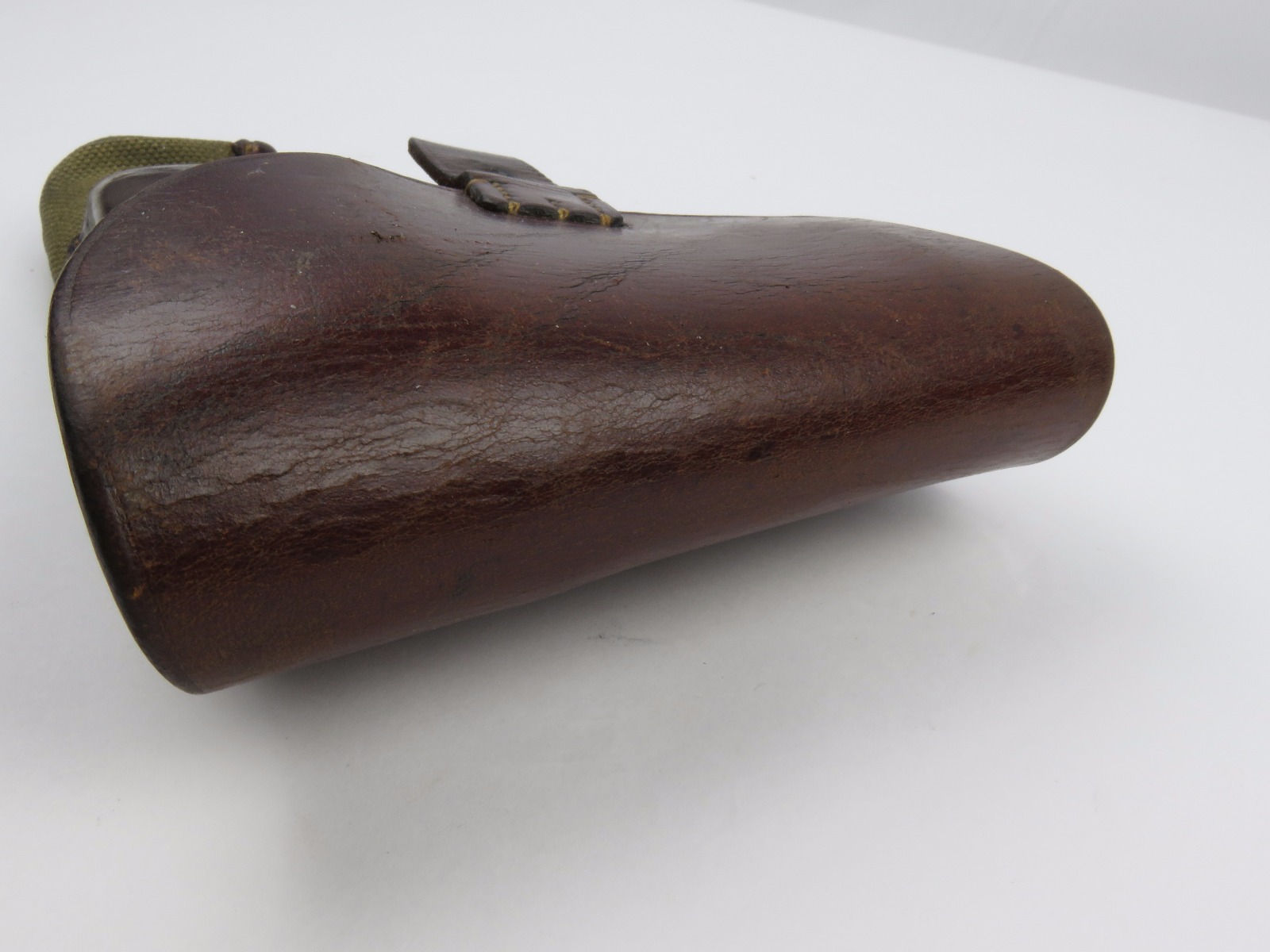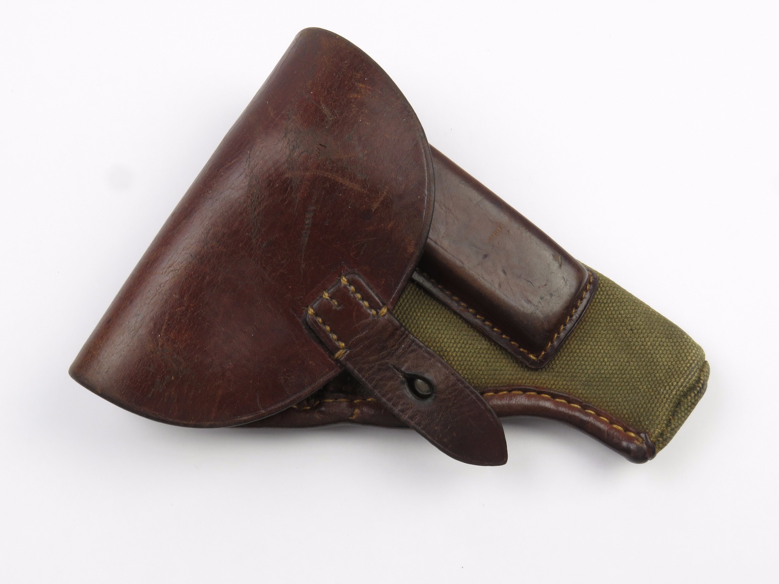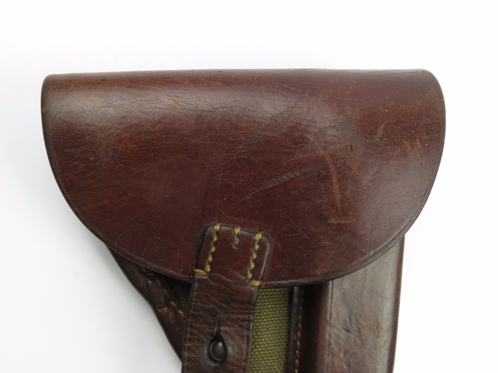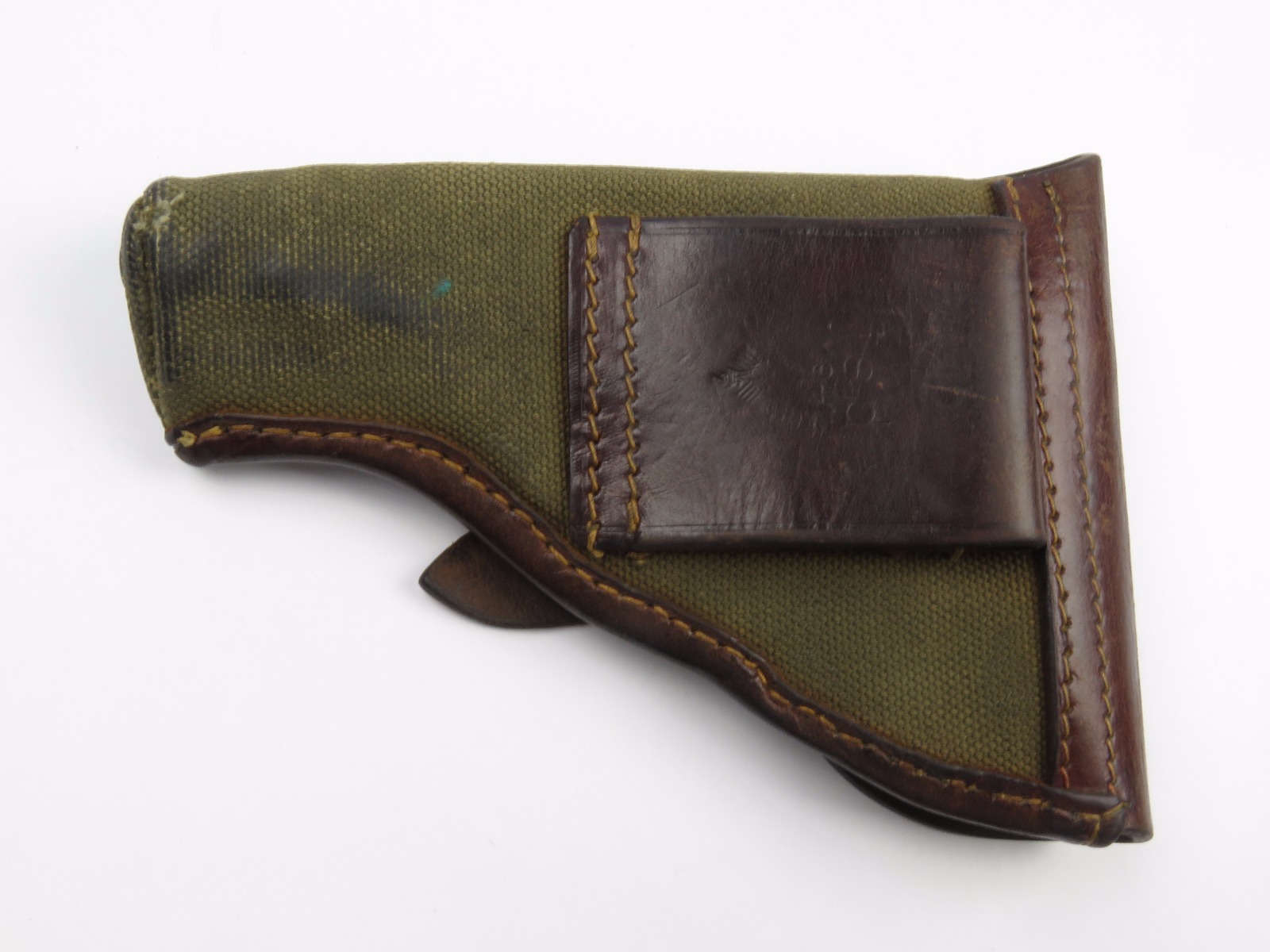 11/3/17 – This is a desirable canvas femaru M37 holster. The holster has a canvas body with leather accents and a leather lid. The back of the holster is stamped “jsd 1941” with a droop winged luftwaffe eagle/2 proof stamp. The interior leather has a nice ink stamp that indicates this holster is for the M37 pistol. The canvas has some light surface wear on the backside, but overall is excellent. The leather has very light wrinkling but no major issues. Excellent stitching overall a very nice, desriable WW2 holster.