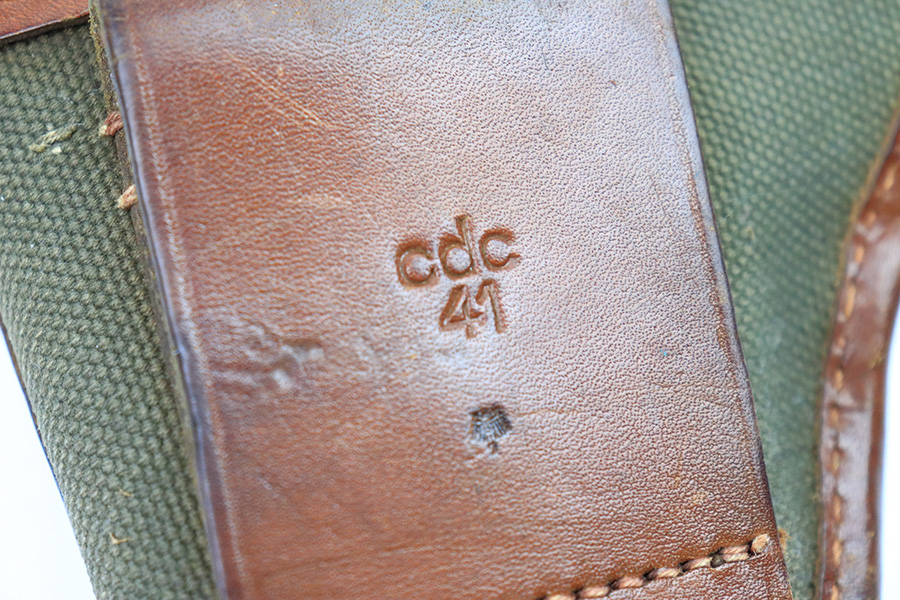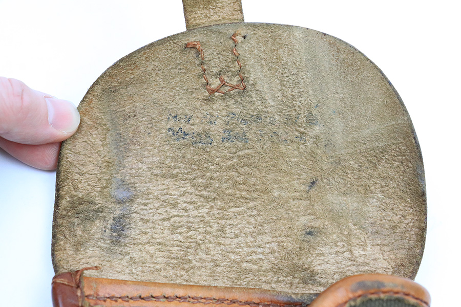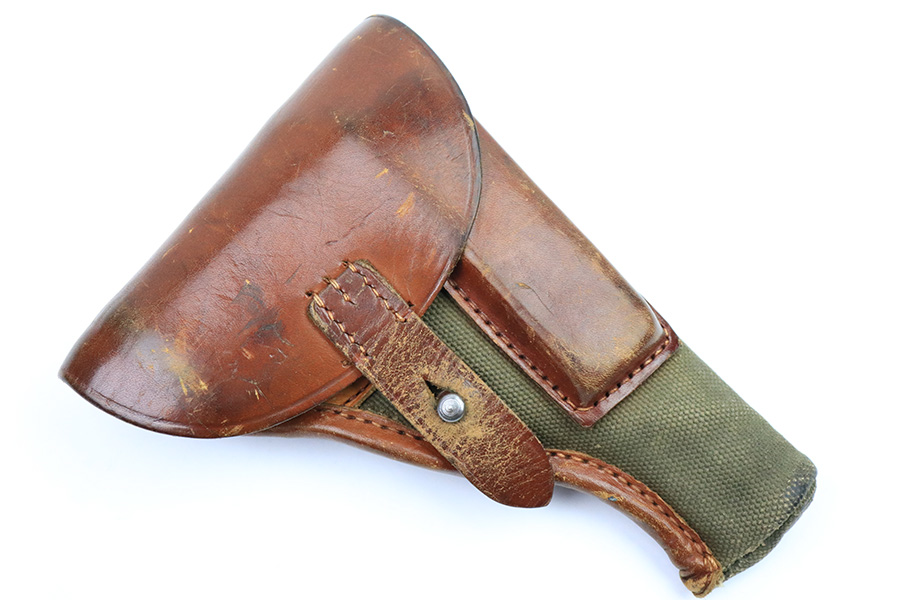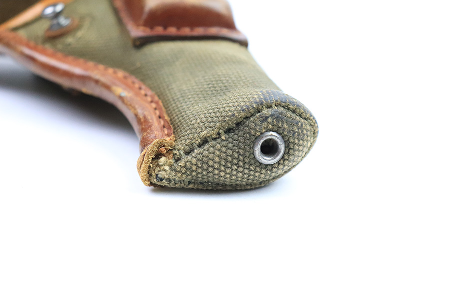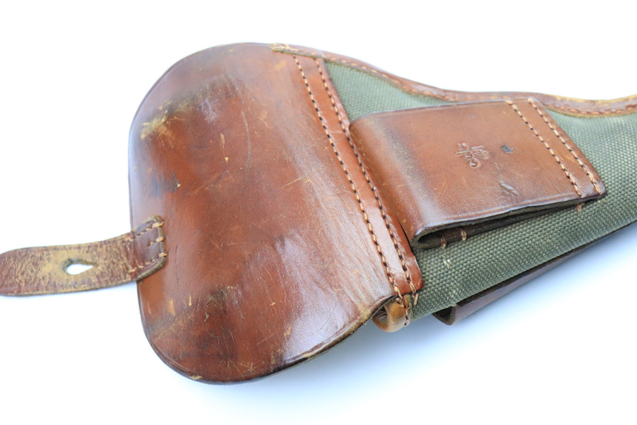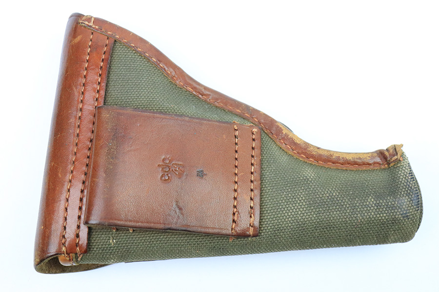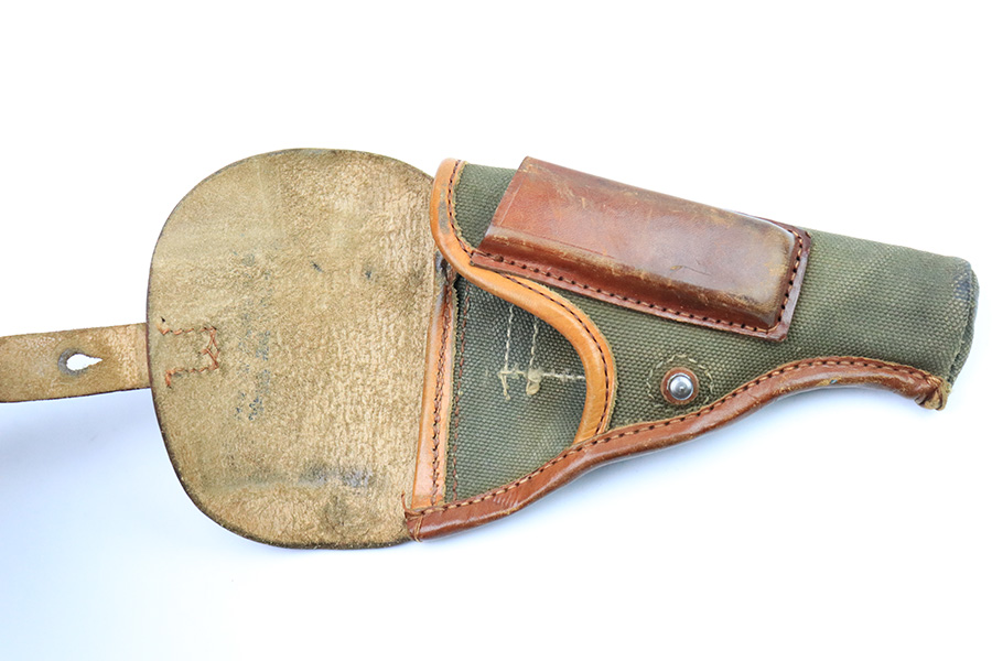 12/15/22 – This is an original 1941 dated M37 Femaru holster from WW2. The holster is known as the ‘tropical style’ with both canvas and leather construction, mostly made for use by the DAK Luftwaffe. The back belt loop is maker stamped, dated, and Luftwaffe proof stamped. The leather has some mild exterior scuffing on the top leather, mag pouch, and closure strap. No cracking or deep wrinkling in the leather. The interior leather shows remnants of the designation ink stamp, but most of the ink is missing. The canvas is clean with no notable flaws. No stitching issues with all original stitching.