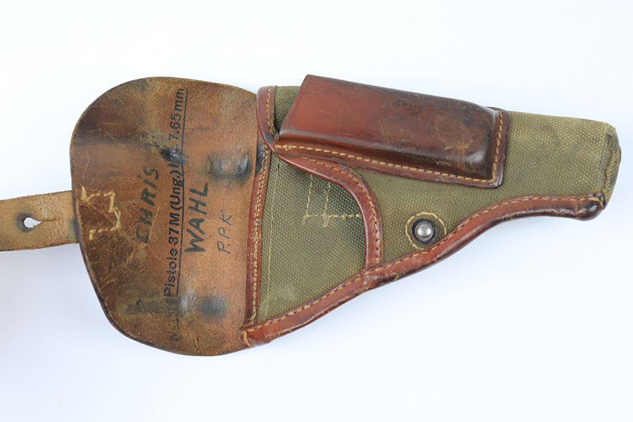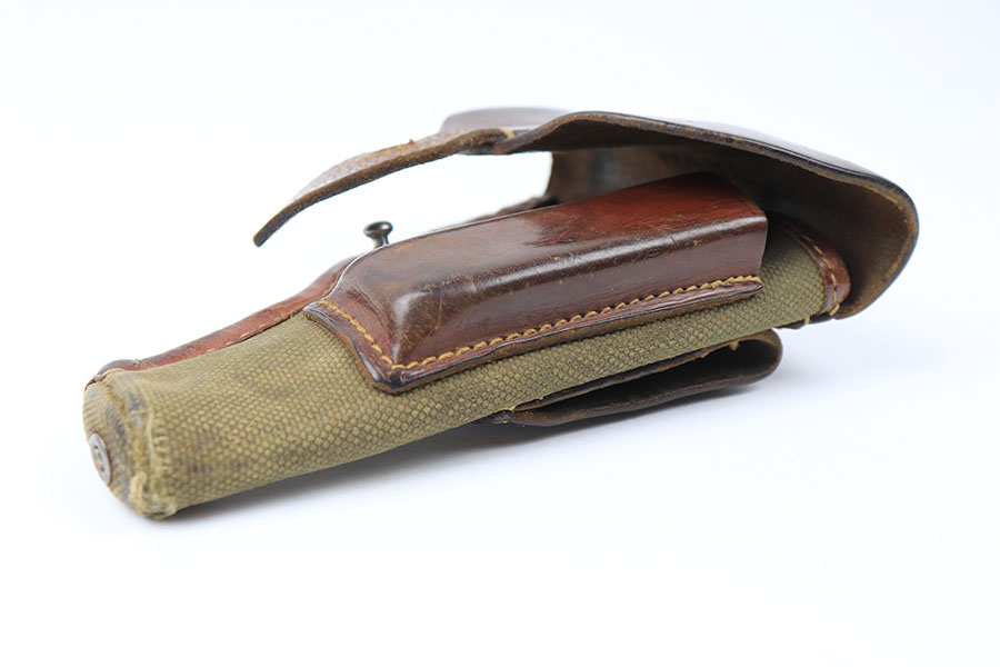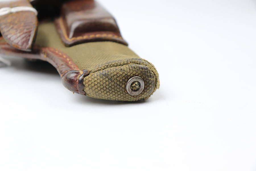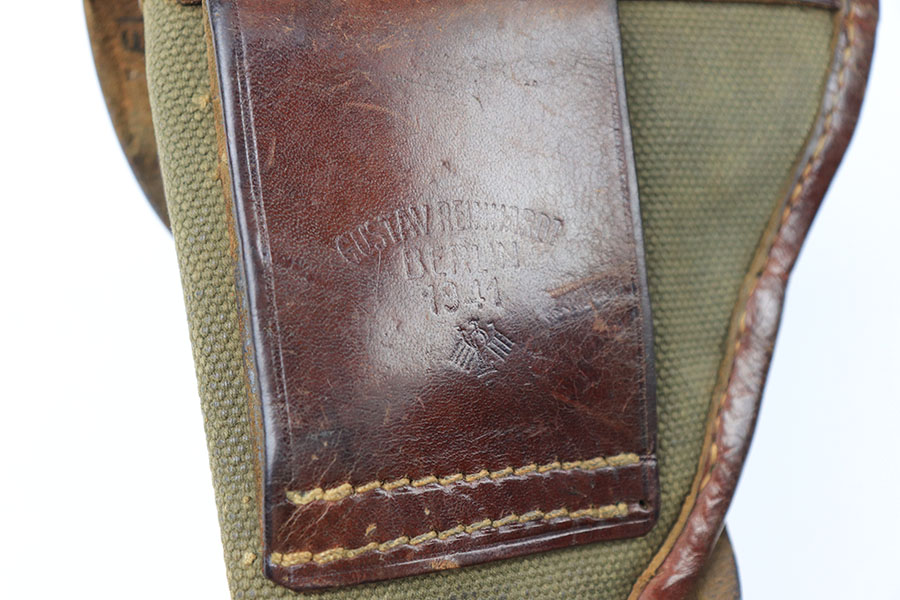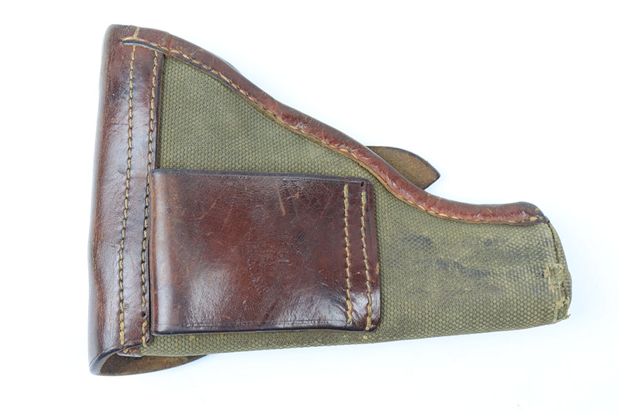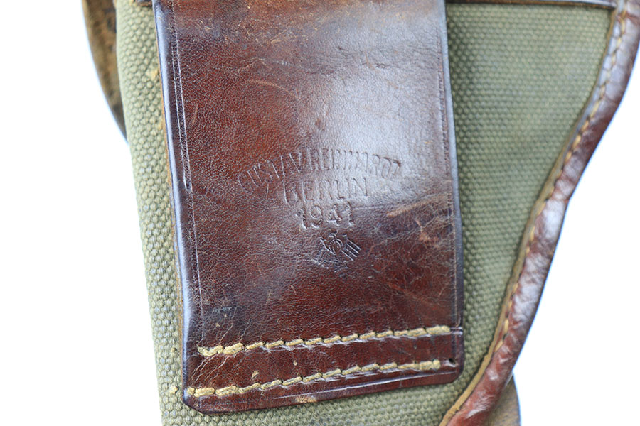 8/18/21 – This is an original tropical canvas style Femaru M37 holster. The holster is maker stamped, 1941 dated, and luftwaffe eagle proof stamped on the back belt loop. The leather and canvas are generally in great condition with some light surface wear and signs of previous use / aging. No stitching issues. The interior leather has some writing, as shown, but also still has a strong ink stamp.