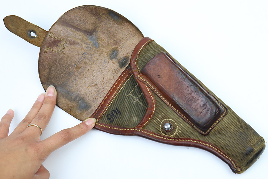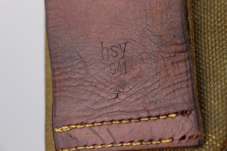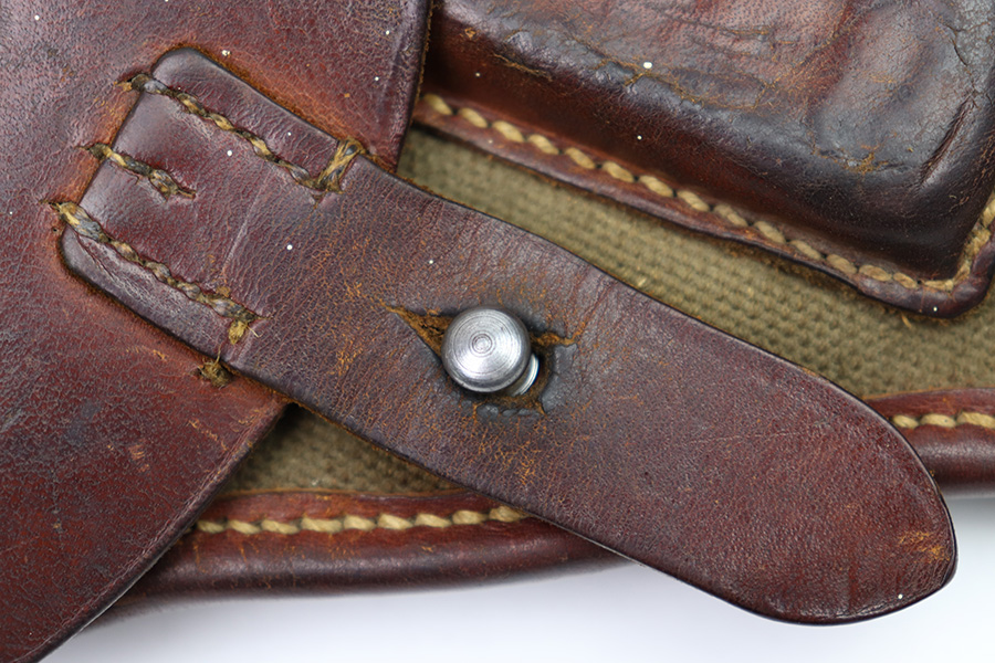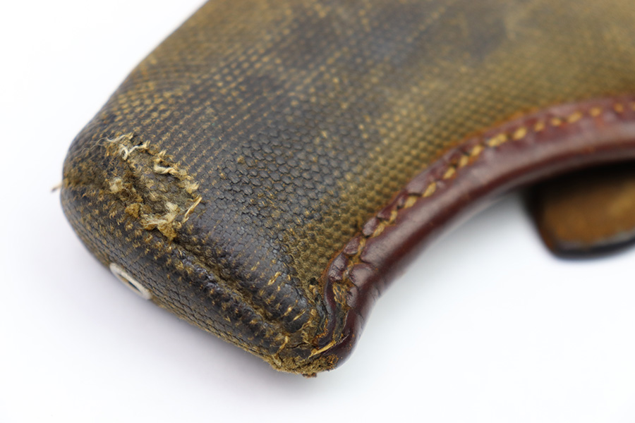 10/18/22 – This is an original Femaru M37 tropical style canvas and leather holster. These holsters are desirable as they were often issued to the Luftwaffe who participated as part of the DAK or German Africa Corps. The back leather is maker stamped, dated, and Luftwaffe eagle/2 proof stamped. The canvas body of the holster is in good condition with some scuffing and dark discoloration near the toe, but this is mostly natural aging and use wear. The leather has similar surface wear but no major issues. Normal pliability throughout. No notable stitching issues. The interior lid is ink stamped designating use for the M37 Femaru pistol.