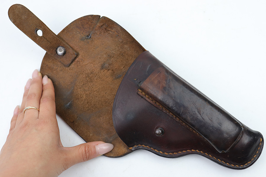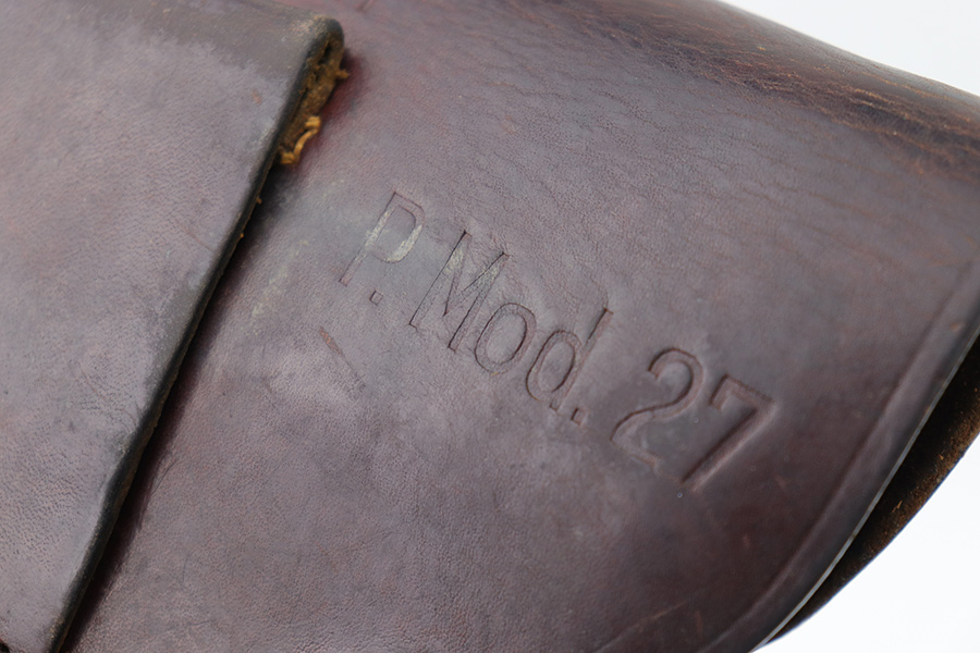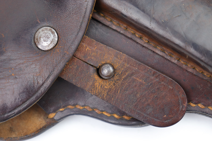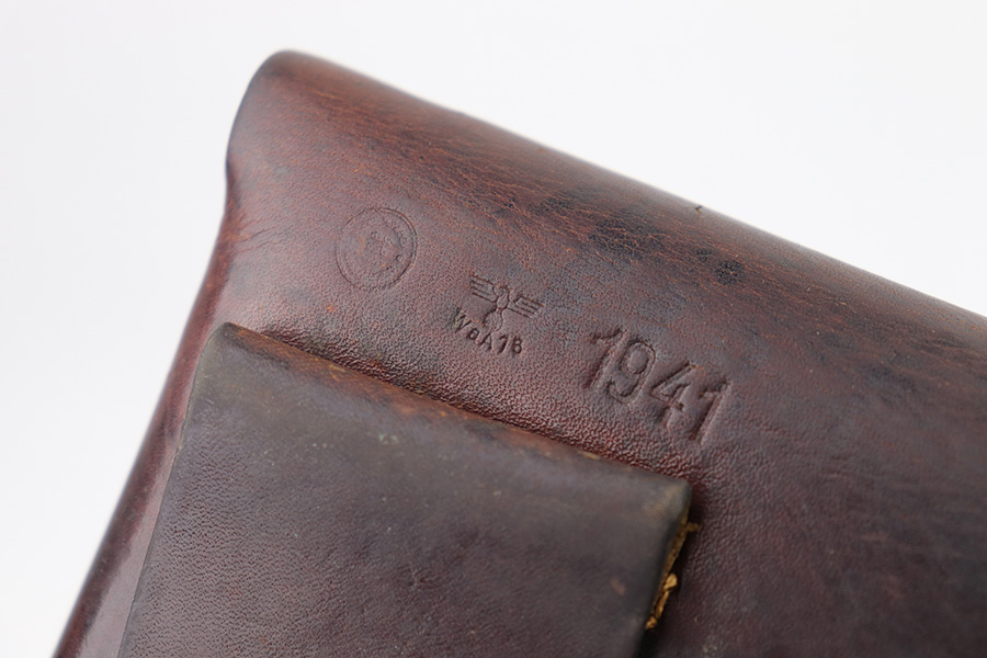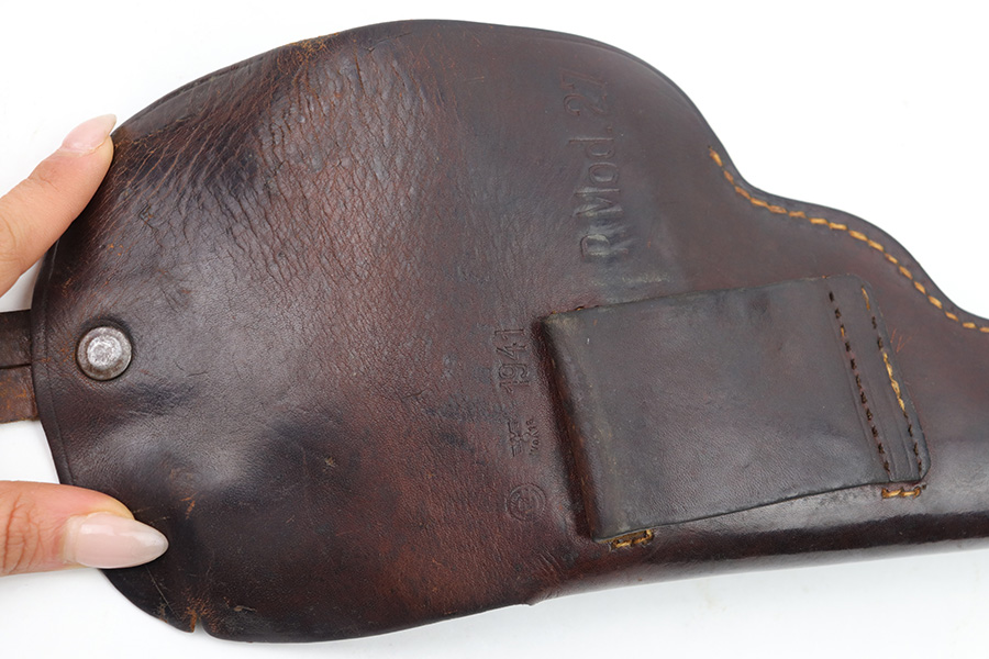 2/8/23 – This is an original 1941 dated CZ-27 holster from WW2. The holster is maker stamped, dated, and waffen proof stamped on the back leather. The dark brown leather has typical surface wear and pliability with no excessive damage. The front leather ahs some wrinkling and the interior leather shows signs of previous use. The stitching is all original, but most of the stitching on the lower part of the back belt loop is missing. The belt loop is still attached and secure, however. Shown in photos.