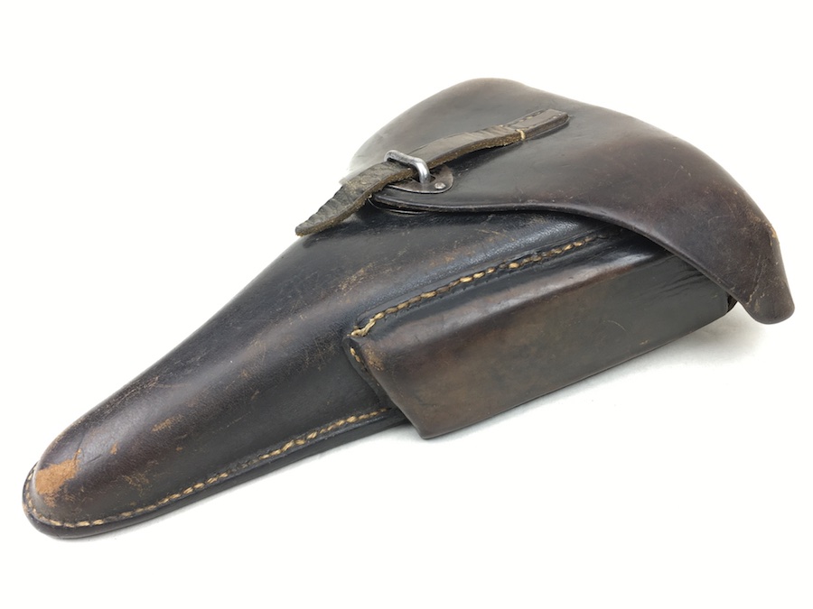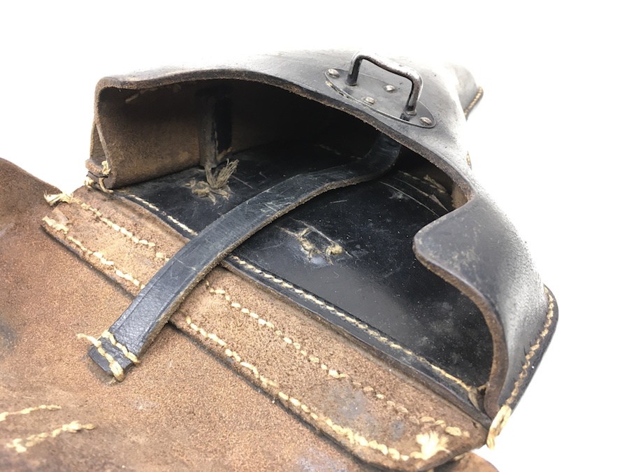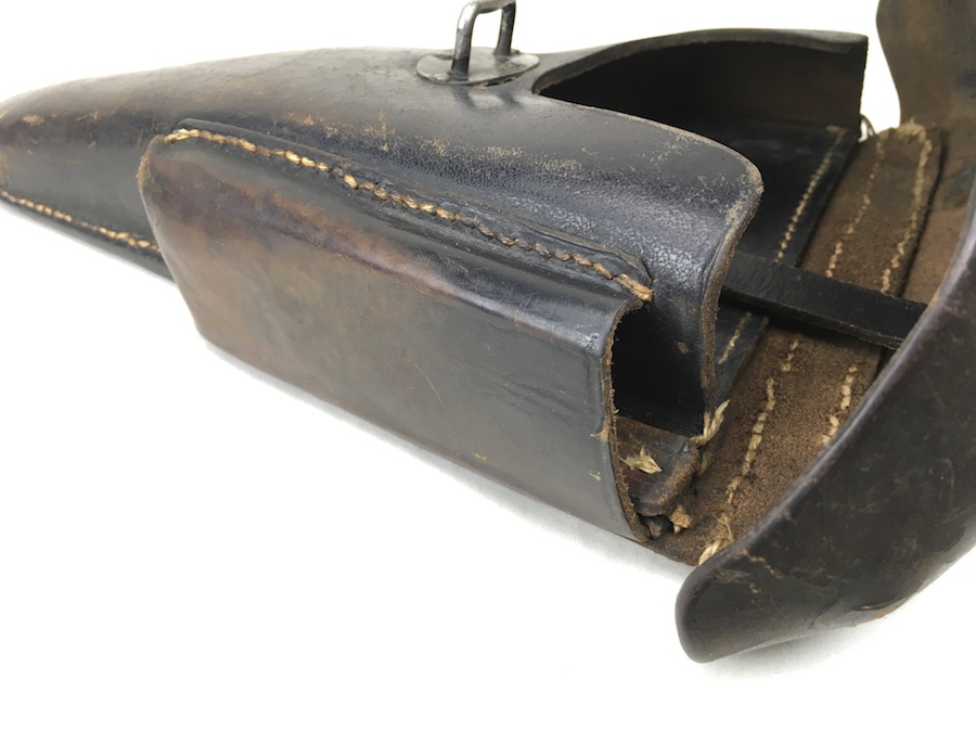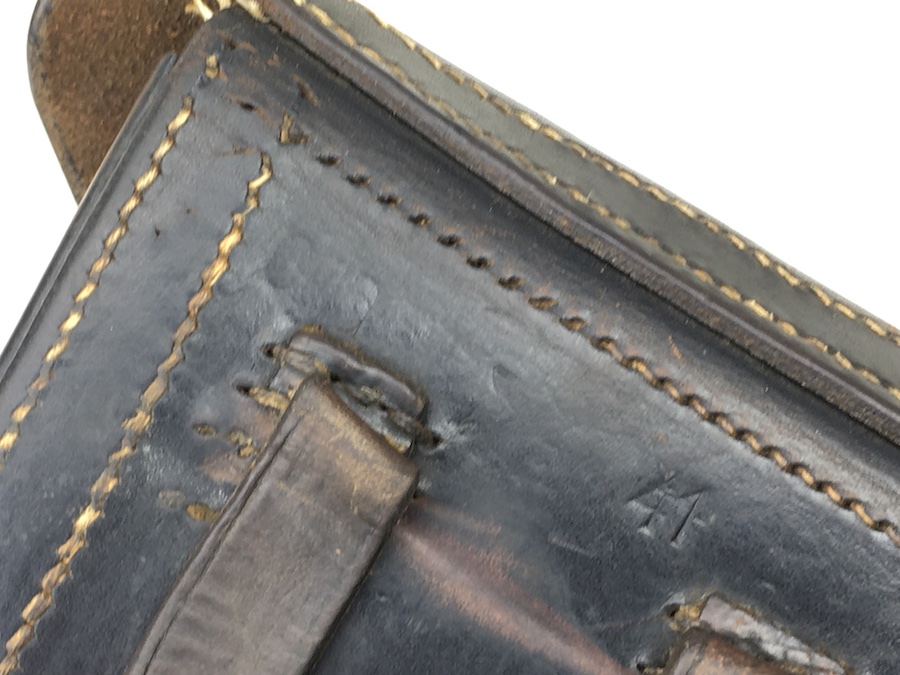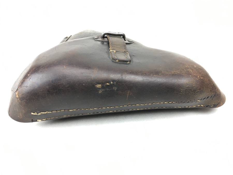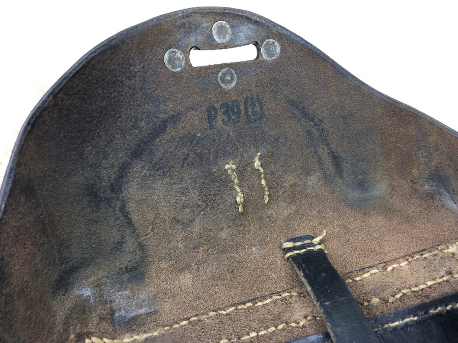12/10/19 – This is an original CZ model 38 holster. The holster is similar to a P.38 holster in size and shape. The back of the holster is maker marked “cga” with a 1941 date and waffen WaA41 stamp. Although faint, it is visible. The leather is somewhat soft and pliable with normal surface wear. The interior leather is clean, and the closure flap is ink stamped “P.39 (t)”. The stitching is intact with the exception of the flap hinge on each end. A few missing and loose stitches, however it is very secure. Guaranteed original.
