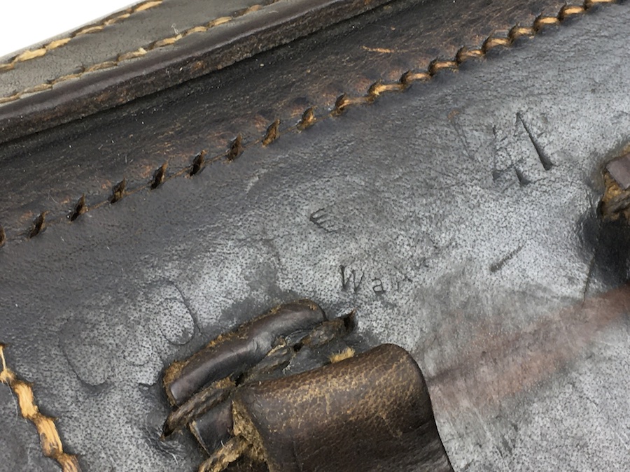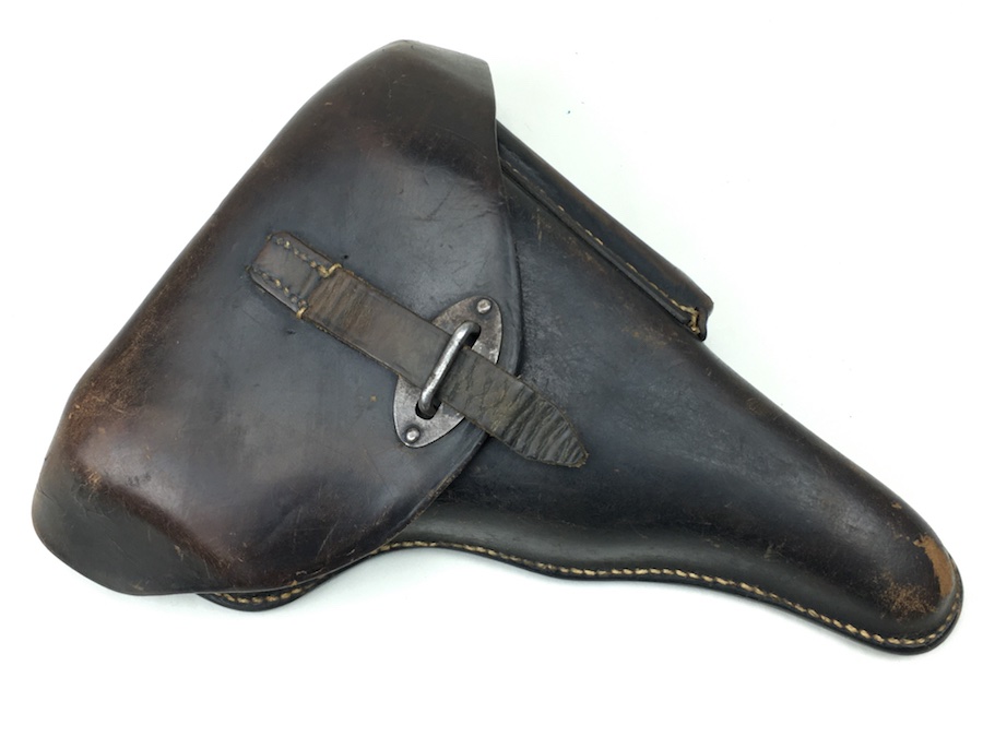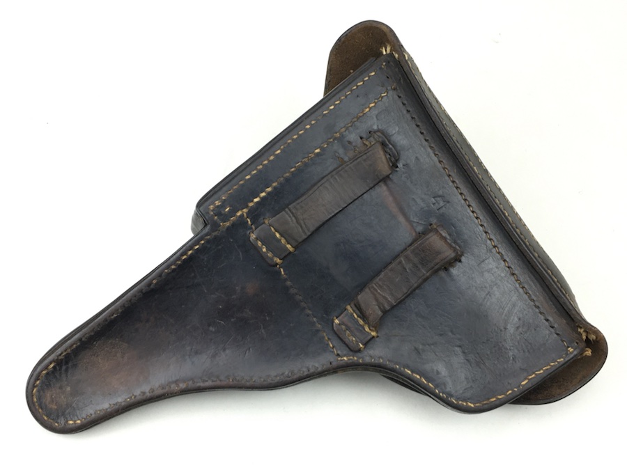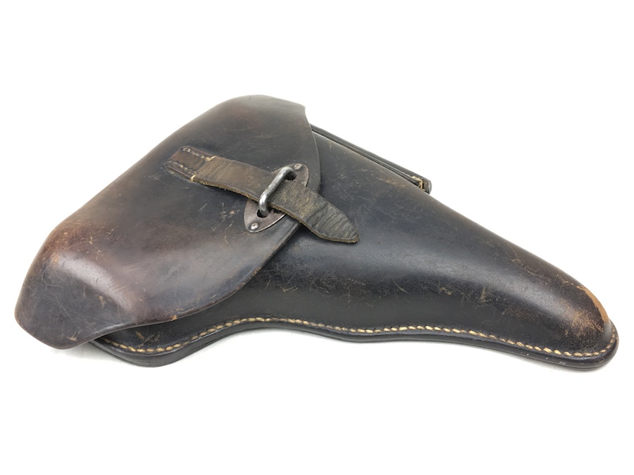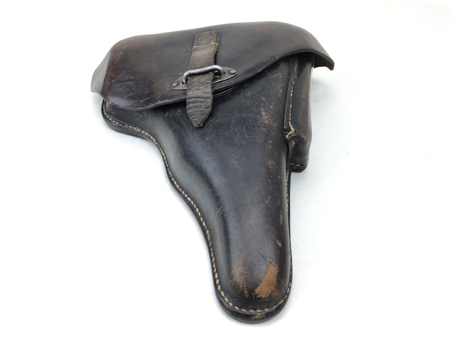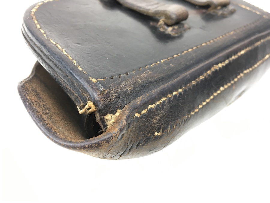 12/10/19 – This is an original CZ model 38 holster. The holster is similar to a P.38 holster in size and shape. The back of the holster is maker marked “cga” with a 1941 date and waffen WaA41 stamp. Although faint, it is visible. The leather is somewhat soft and pliable with normal surface wear. The interior leather is clean, and the closure flap is ink stamped “P.39 (t)”. The stitching is intact with the exception of the flap hinge on each end. A few missing and loose stitches, however it is very secure. Guaranteed original.