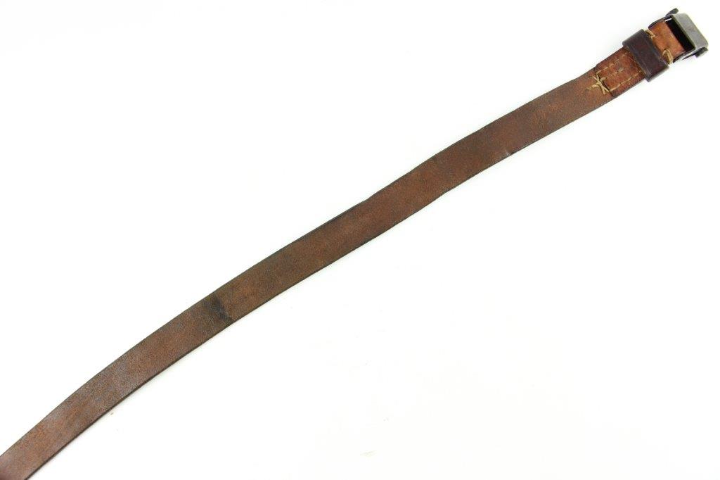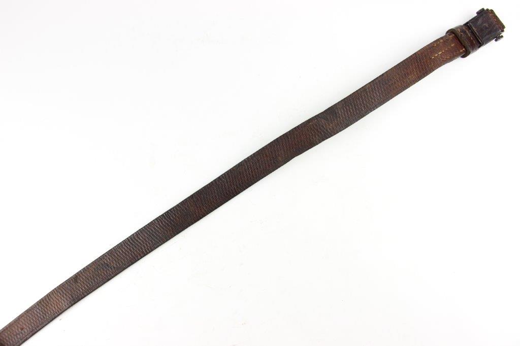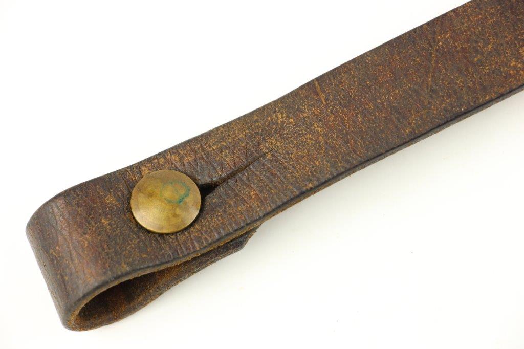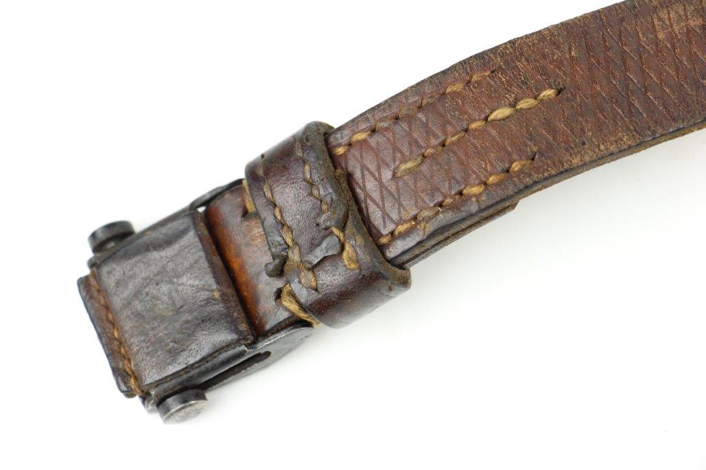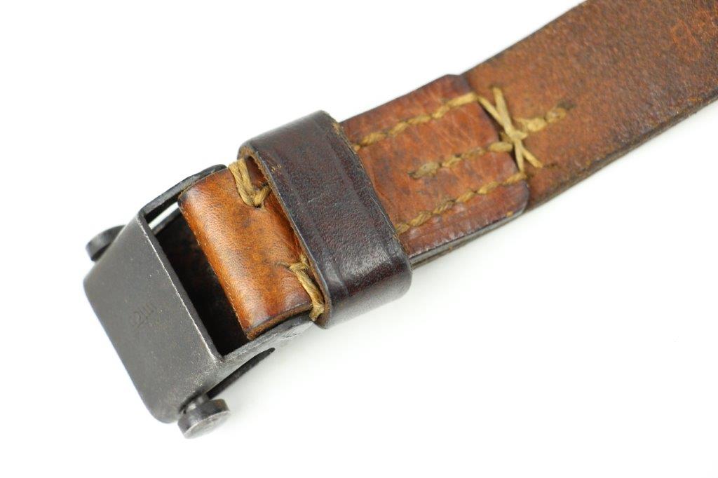 6/5/24 – This is a fairly scarce WW2 production MP.40 leather sling. The sling is in excellent overall condition with some light surface aging but no cracking or notable flaws on the leather. One end of the sling has two adjustment holes (distinguishing characteristic between mp.40 and K98 slings). Brass fastening knob. The metal-end of the sling is maker stamped and retains most of the original finish. The interior leather near this end is maker and date stamped, “gaq 41”. Overall an excellent example.