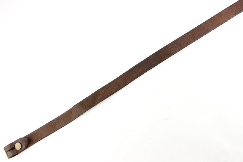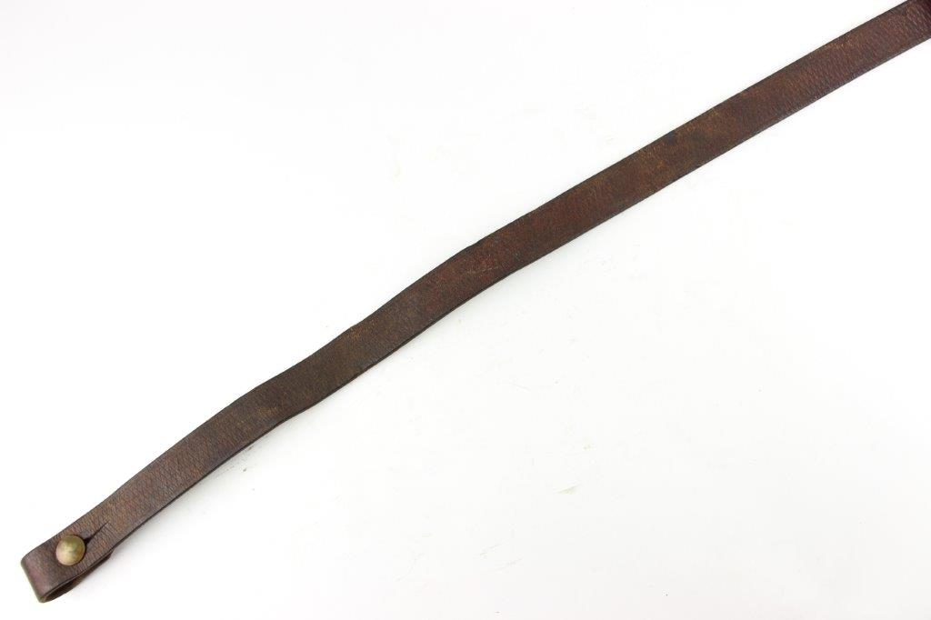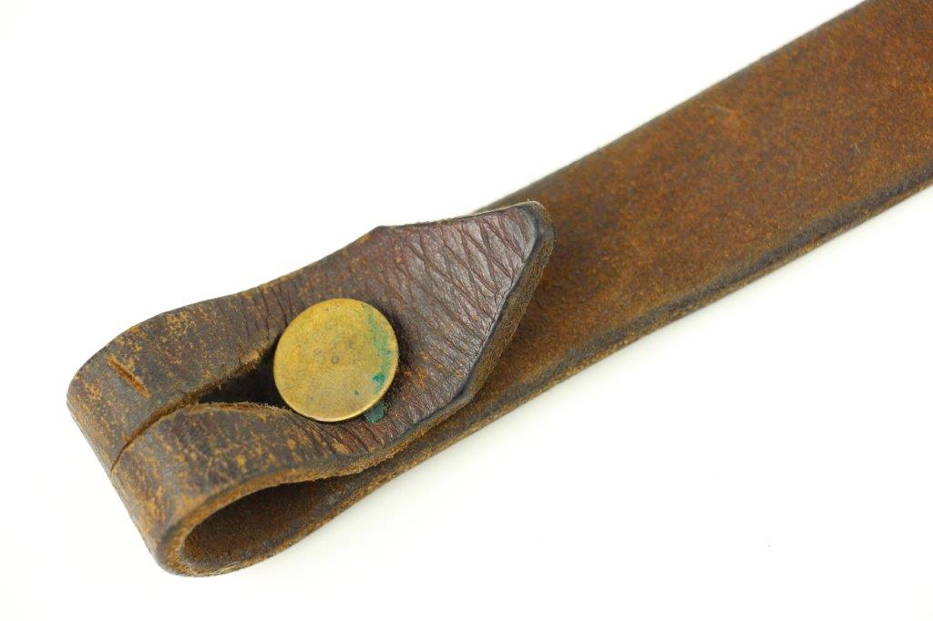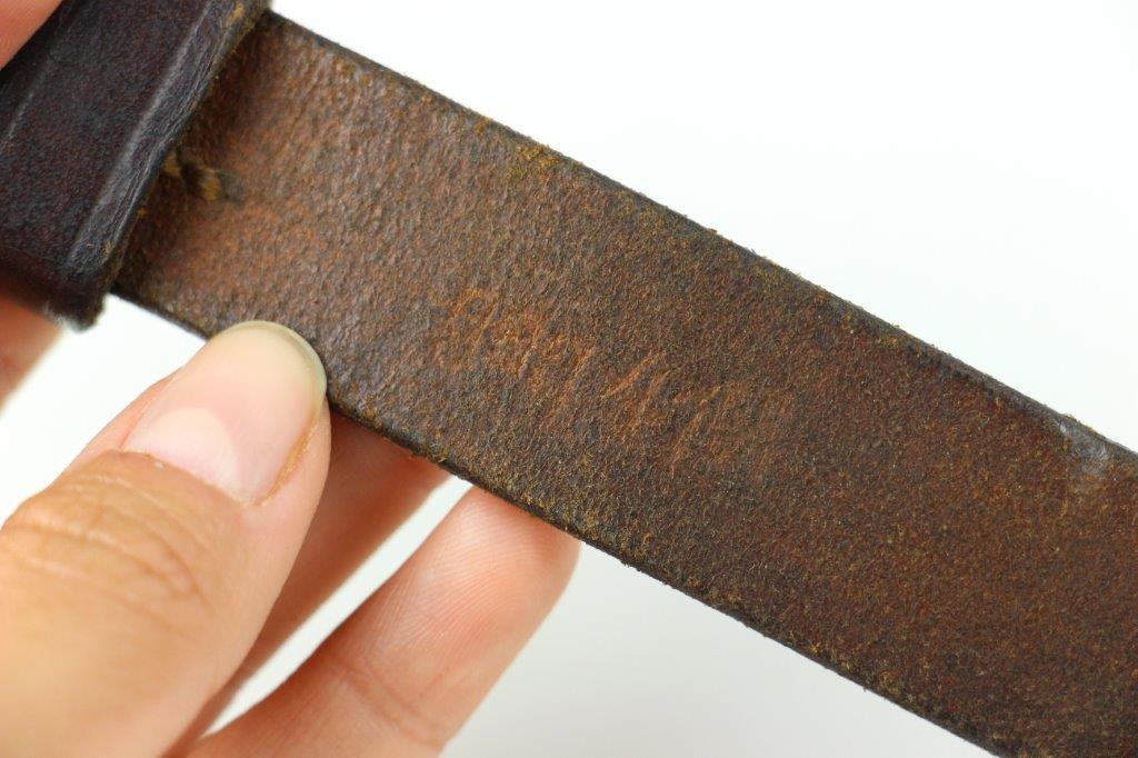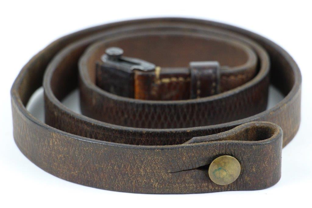 6/5/24 – This is a fairly scarce WW2 production MP.40 leather sling. The sling is in excellent overall condition with some light surface aging but no cracking or notable flaws on the leather. One end of the sling has two adjustment holes (distinguishing characteristic between mp.40 and K98 slings). Brass fastening knob. The metal-end of the sling is maker stamped and retains most of the original finish. The interior leather near this end is maker and date stamped, “gaq 41”. Overall an excellent example.