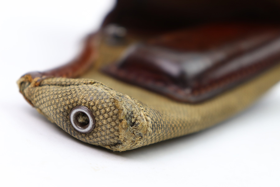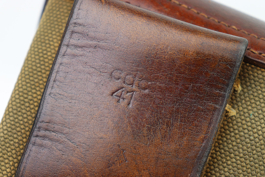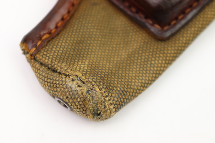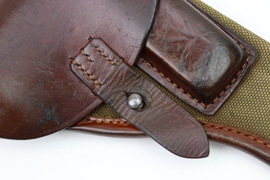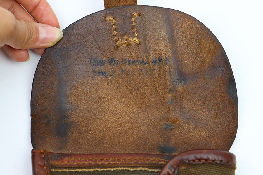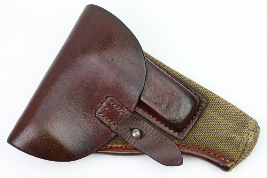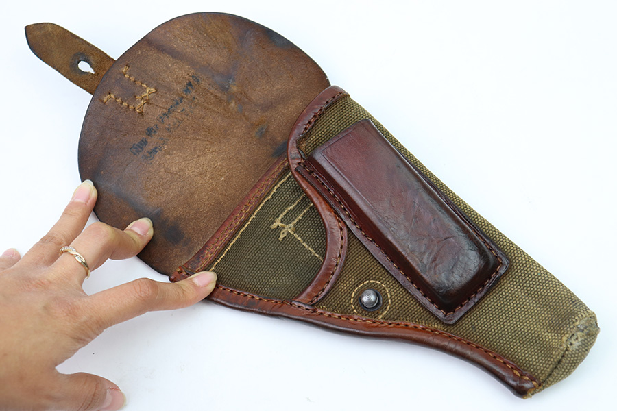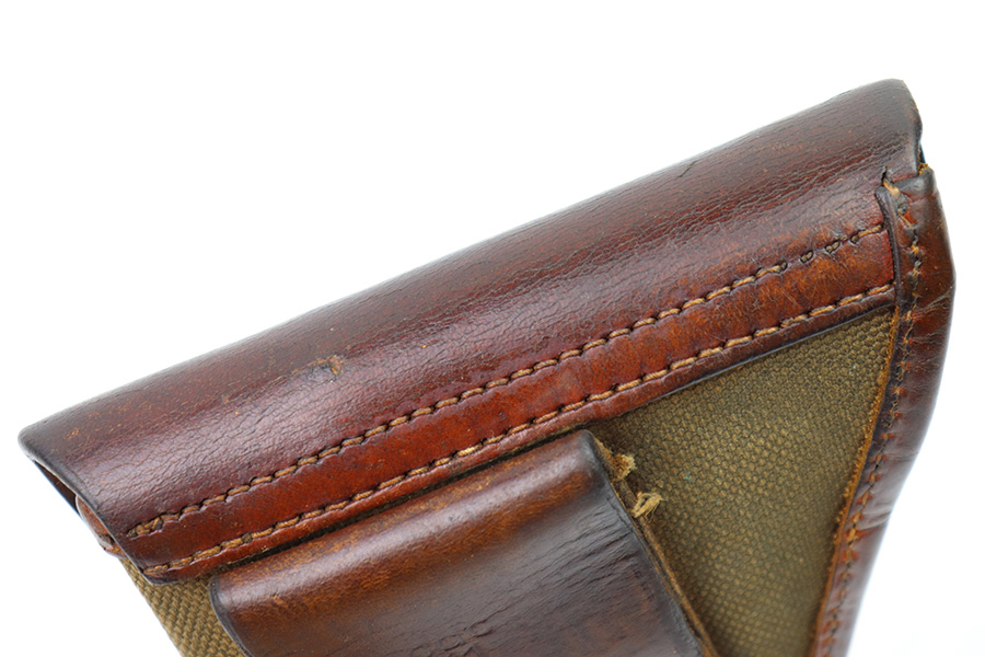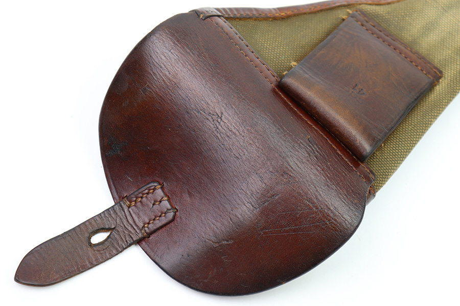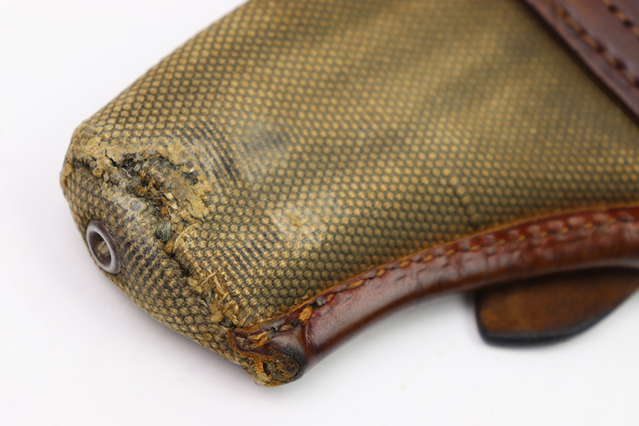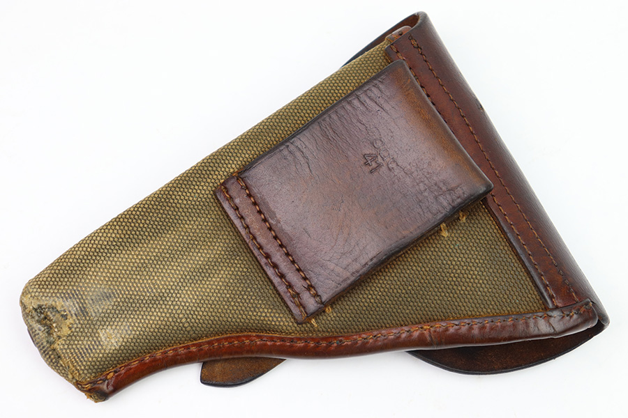8/30/22 – This is an original “tropical style” or canvas Femaru M37 pistol holster. The holster is made from leather and canvas materials, and these were often issued to the Luftwaffe and Afrika Korps during WW2. The back of this holster is maker stamped and dated on the leather belt loop. There’s also a droop eagle/7 proof stamp, which is faded but still visible. The back toe of canvas has some scuffing and a very small hole that goes through the canvas, but this is the only notable area of damage. The rest of this holster is in great condition with excellent stitching and the interior ink stamp still visible.